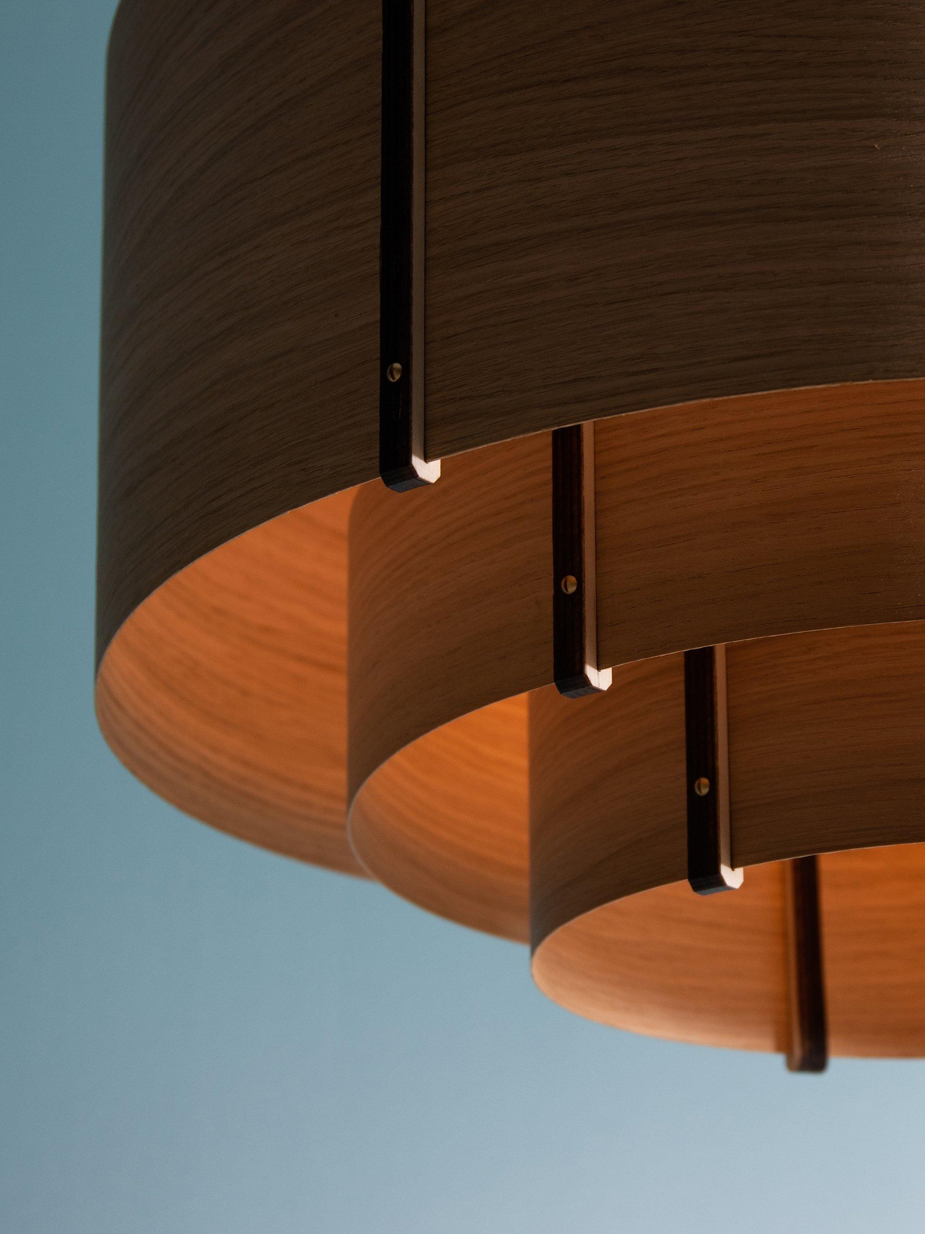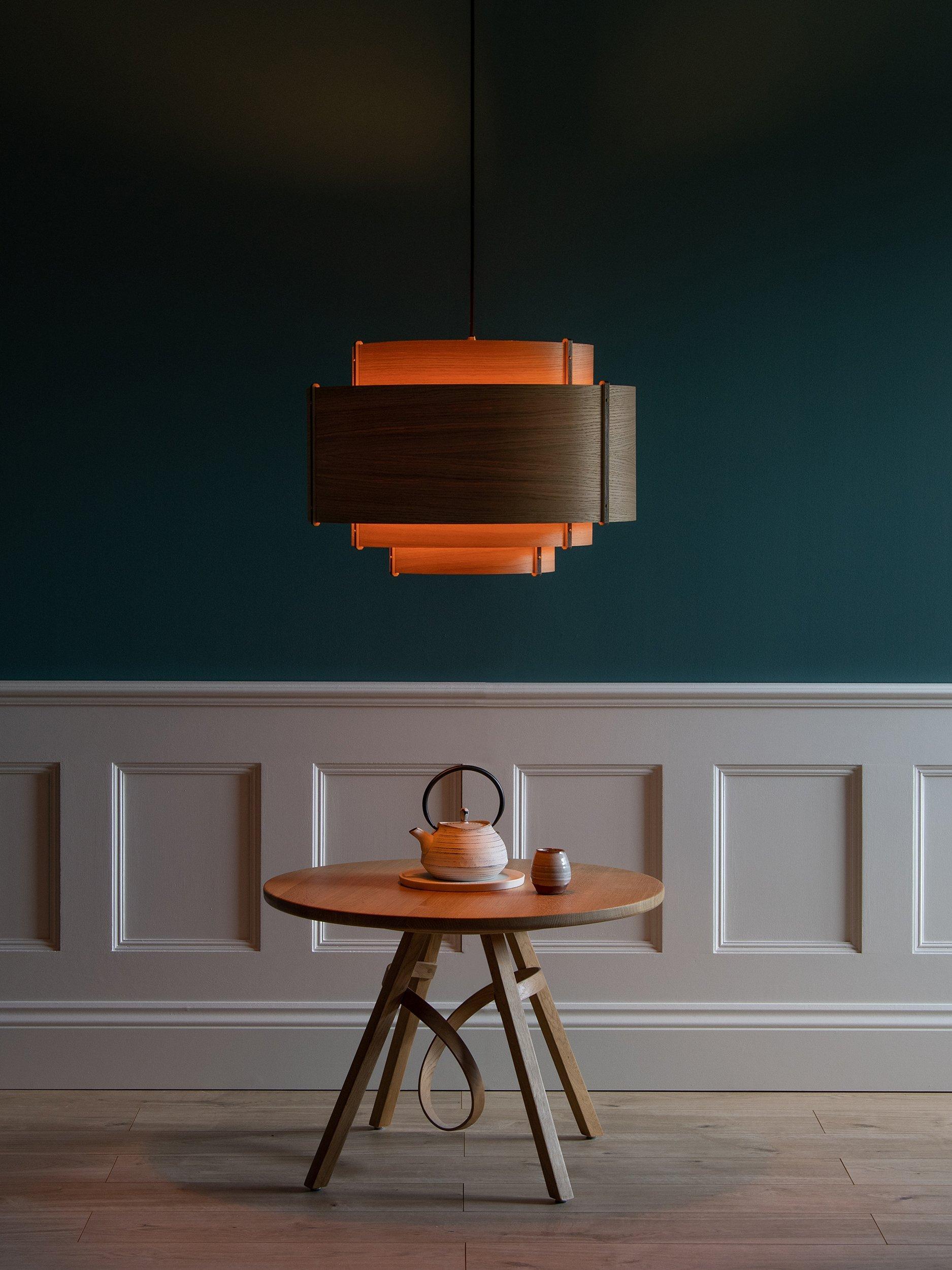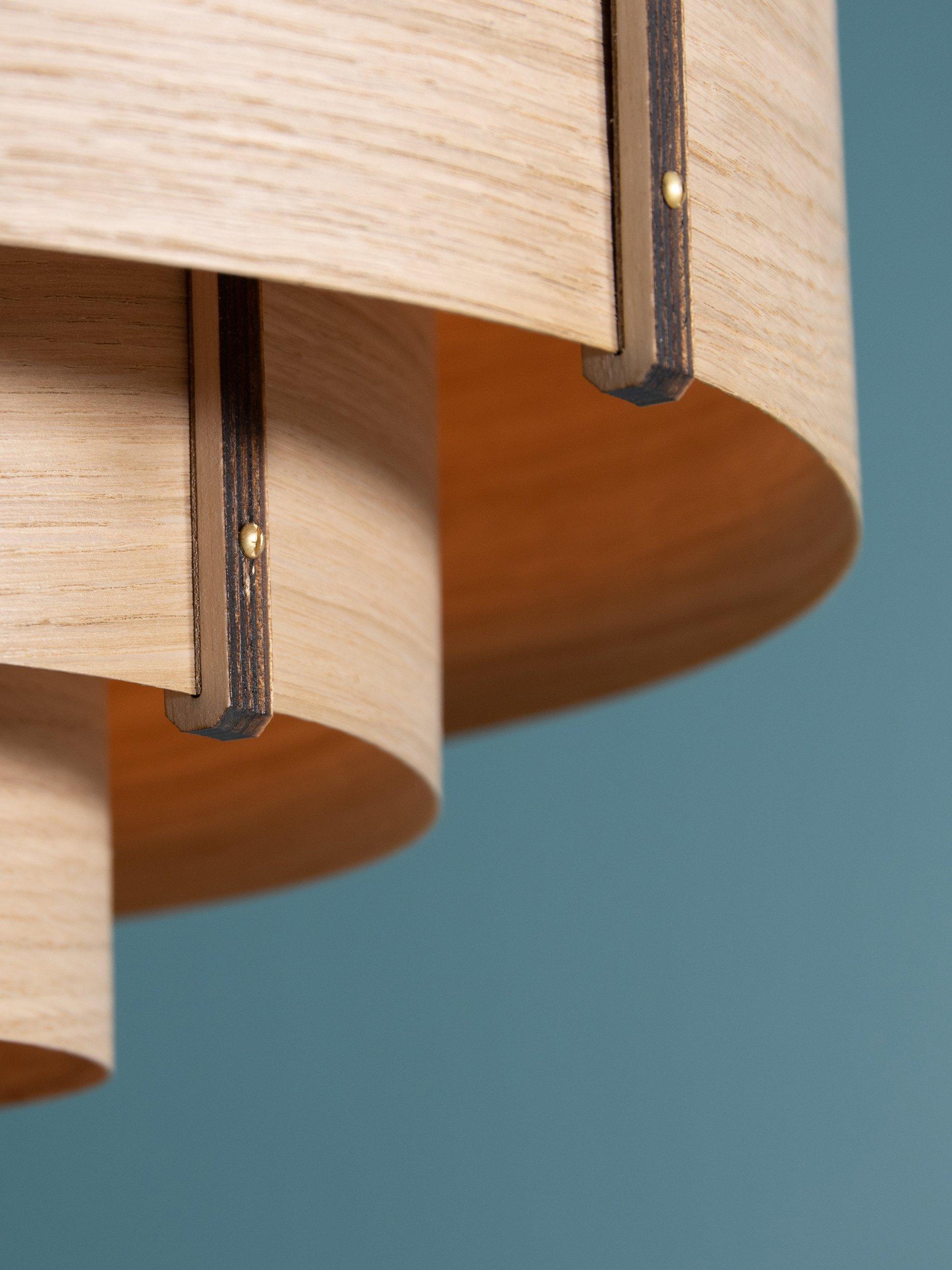 Meaning 'level' in Cornish, this ceiling light is handcrafted using tiers of curving oak or walnut wood that climb a central plywood frame summit. Secured at the seams with brass accented rivets, each taut layer of wood builds a balanced silhouette of careful craftsmanship. This fitting offers a warm and distinctive glow of light and is perfect if you want to introduce a natural style at home.
