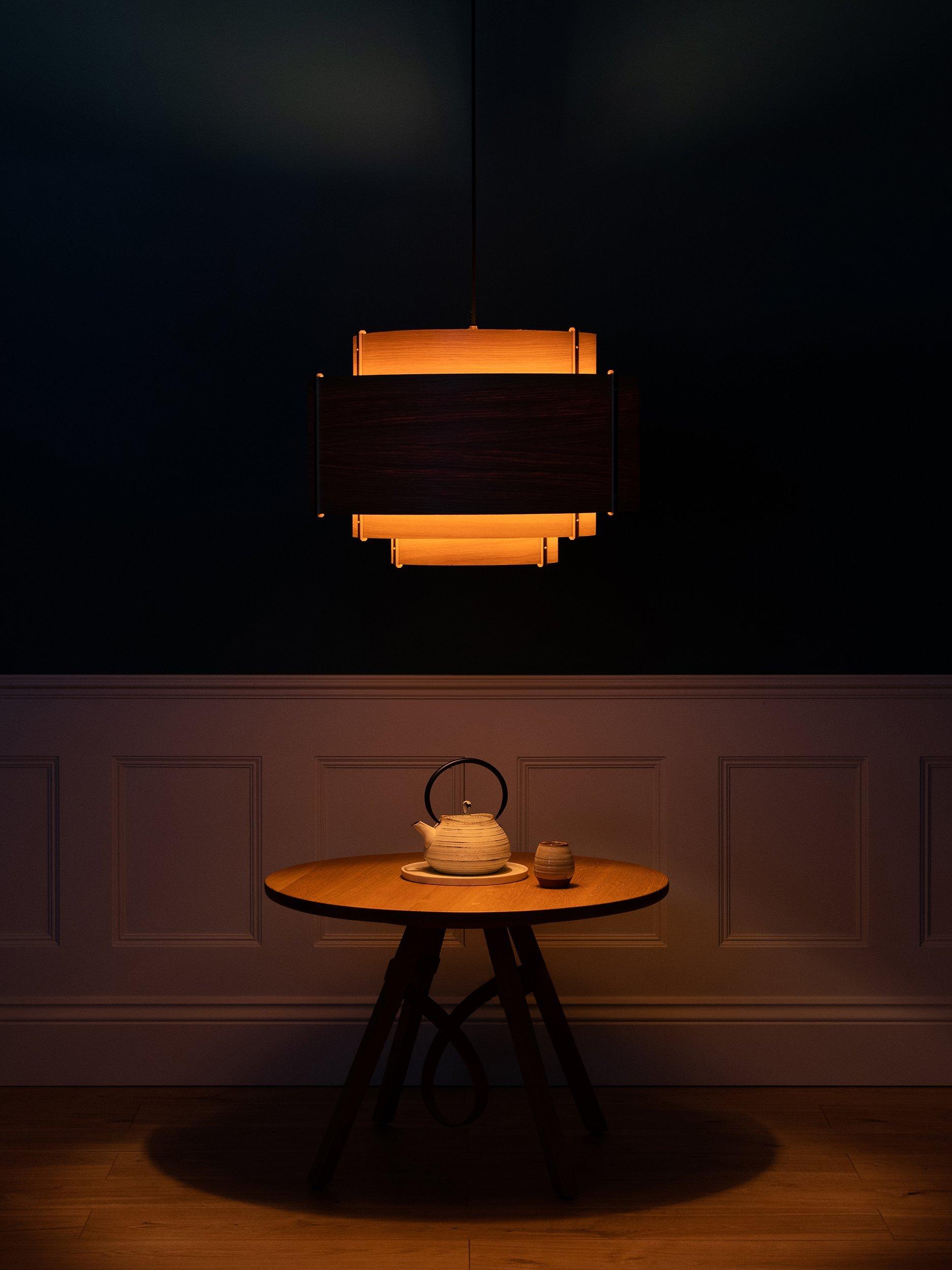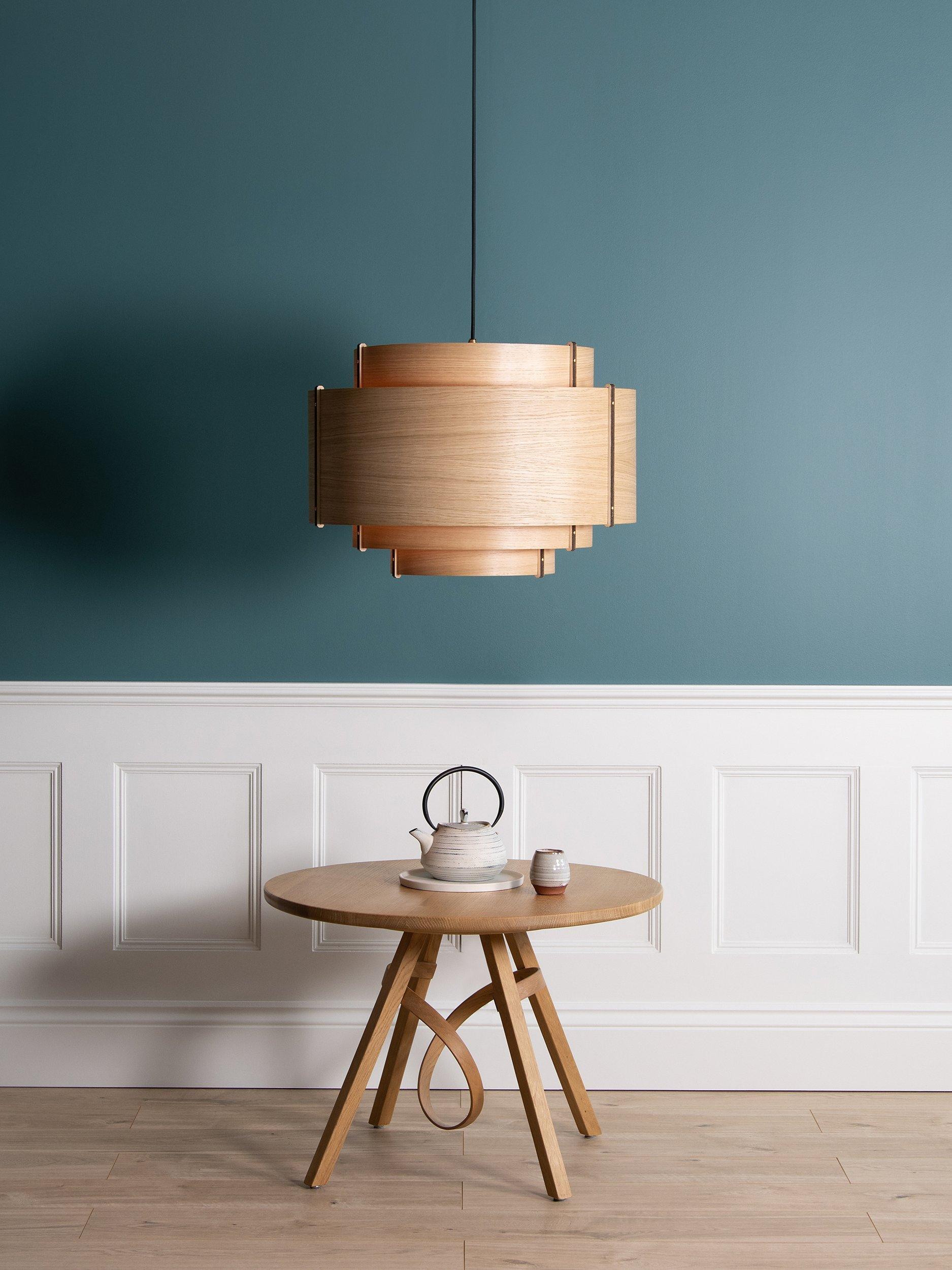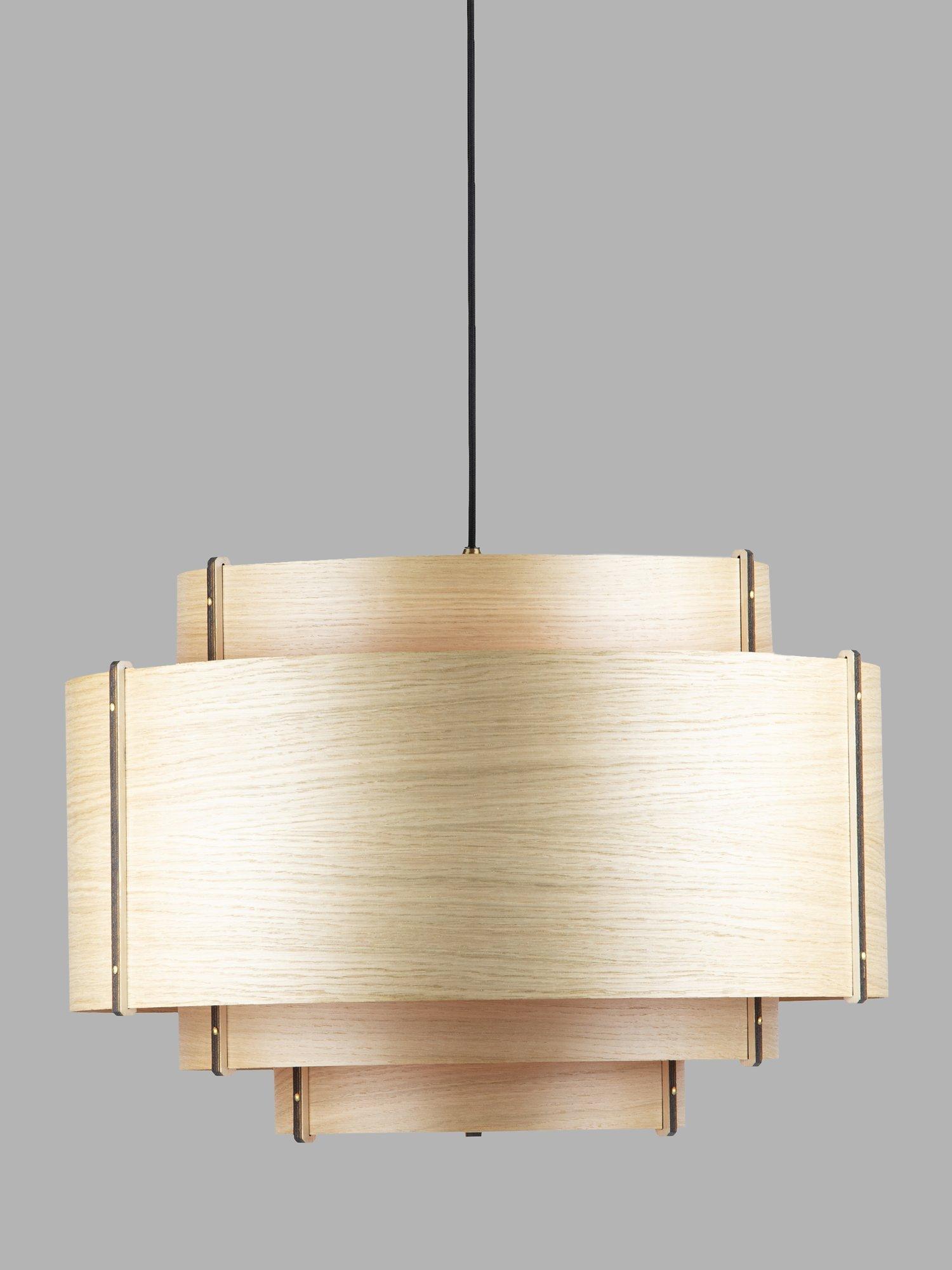 Meaning 'level' in Cornish, this ceiling light is handcrafted using tiers of curving oak or walnut wood that climb a central plywood frame summit. Secured at the seams with brass accented rivets, each taut layer of wood builds a balanced silhouette of careful craftsmanship. This fitting offers a warm and distinctive glow of light and is perfect if you want to introduce a natural style at home.