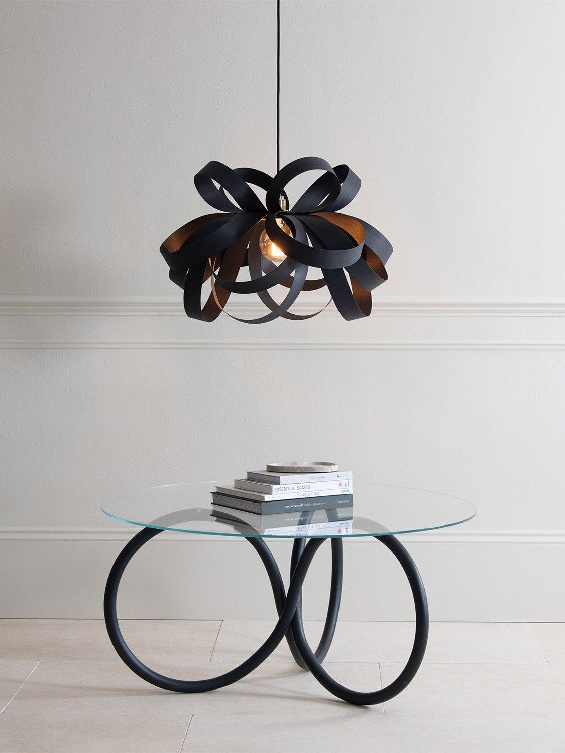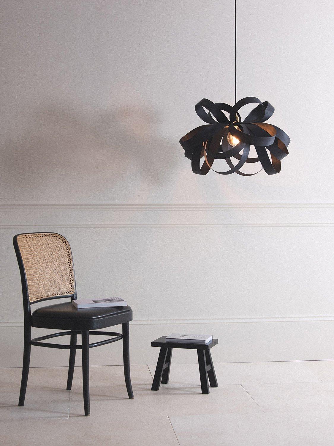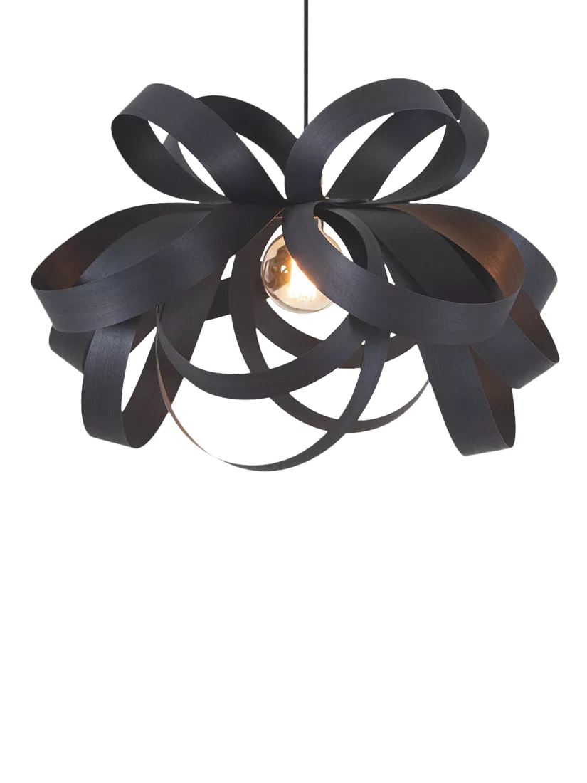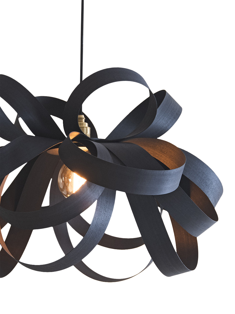 The Noctis Skipper Medium Pendant merges Scandinavian design principles with Tom Raffield's signature curved aesthetic. Crafted from beautifully ebonised wood, this dark pendant features a hand-shaped open structure that radiates light upward and outward.