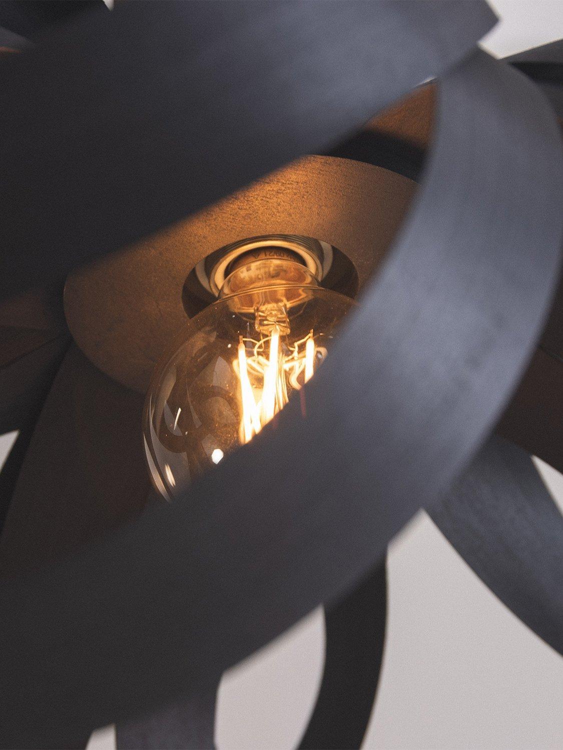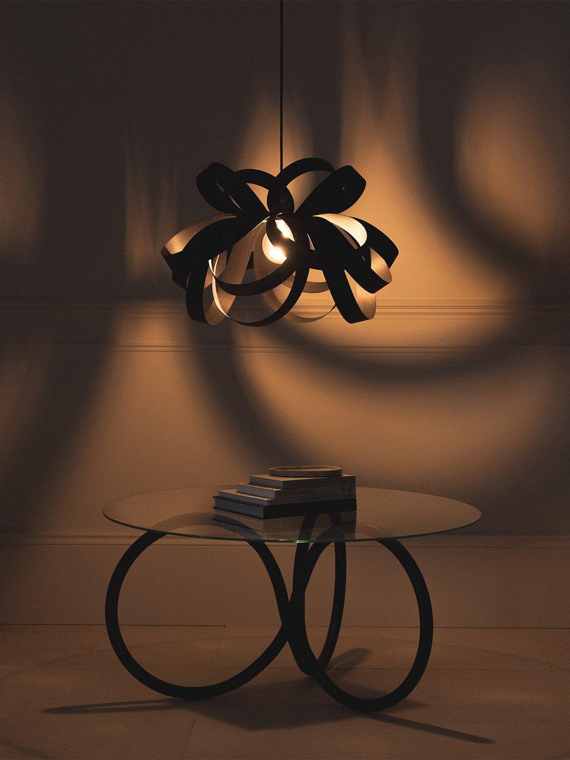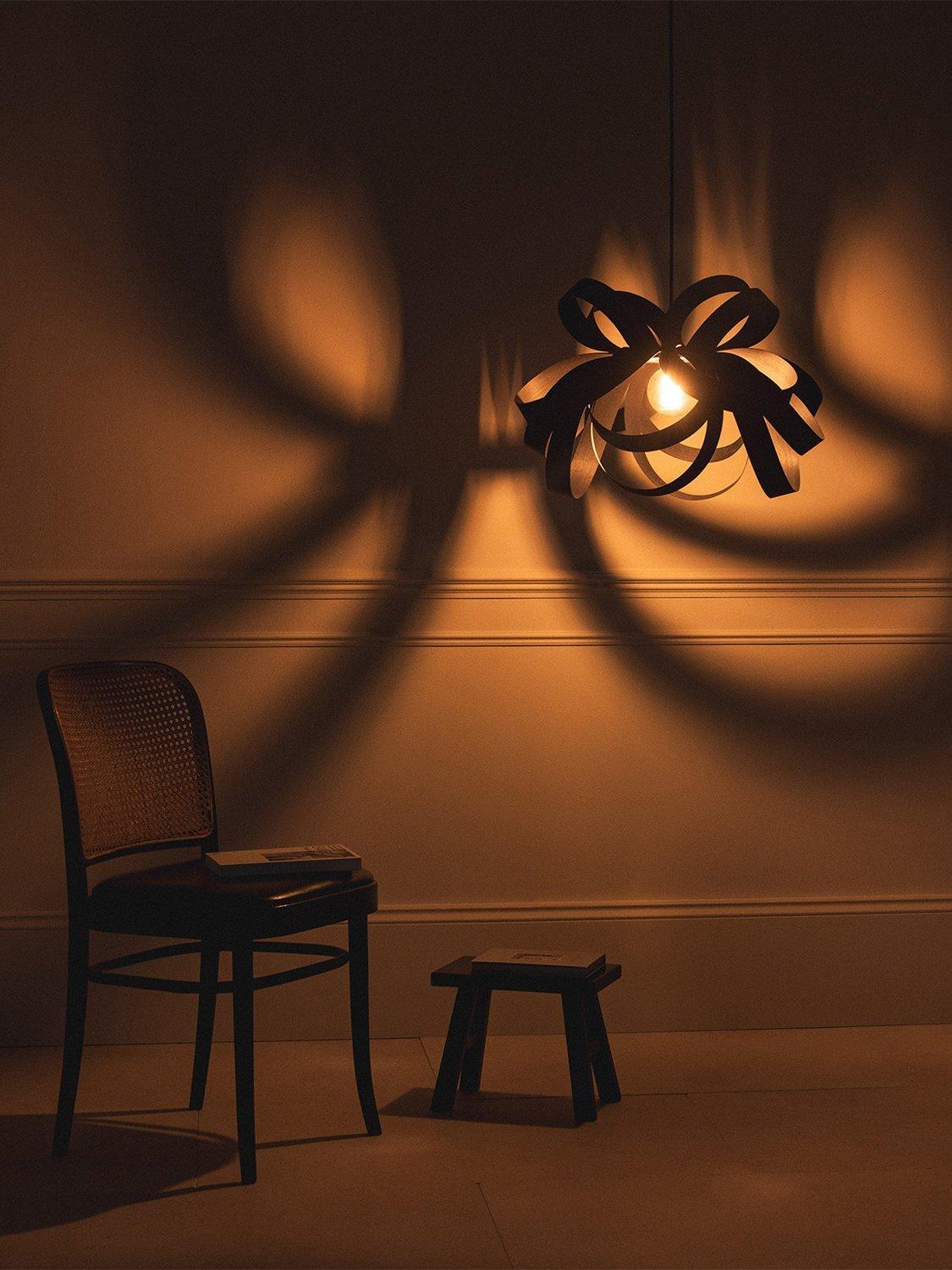 The Noctis Skipper Medium Pendant merges Scandinavian design principles with Tom Raffield's signature curved aesthetic. Crafted from beautifully ebonised wood, this dark pendant features a hand-shaped open structure that radiates light upward and outward.