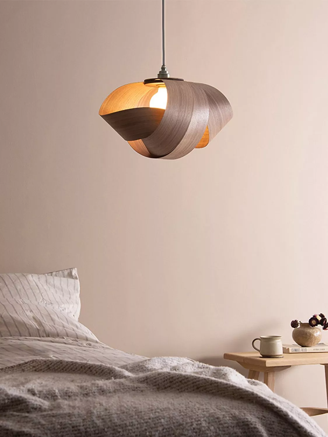 Timber crescents are layered to partially cocoon the bulb, diffusing illumination through each cosy alcove.