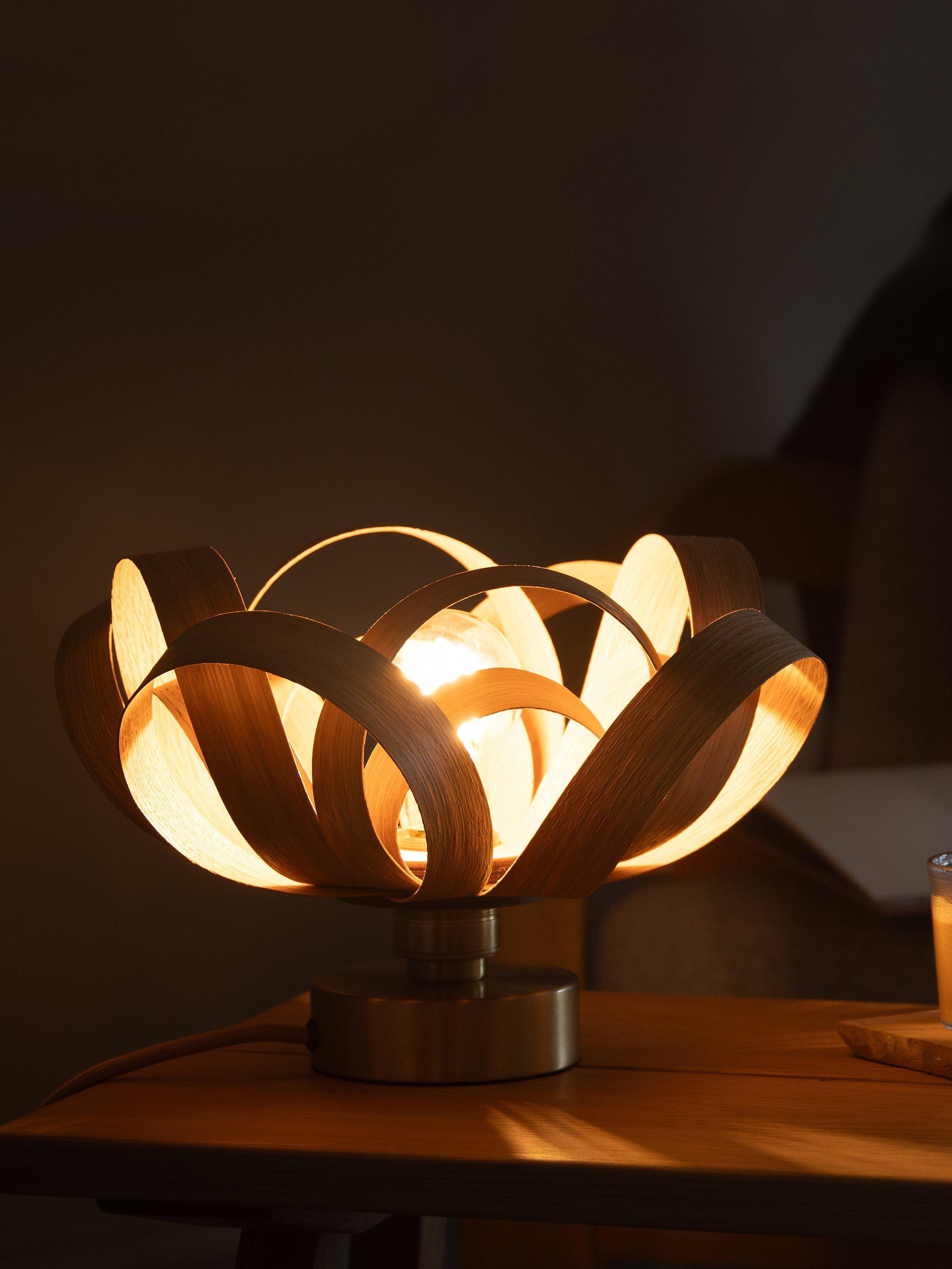Tom Raffield's pared back design meets his signature wooden curves in the Skipper table lamp. Undulating loops of sustainably-soured timber navigate over and around to create an open light that illuminates out and up in a bright, bold contrast of light and shadow. Ideal to use for layering light and creating ambience in specific areas of your living space.