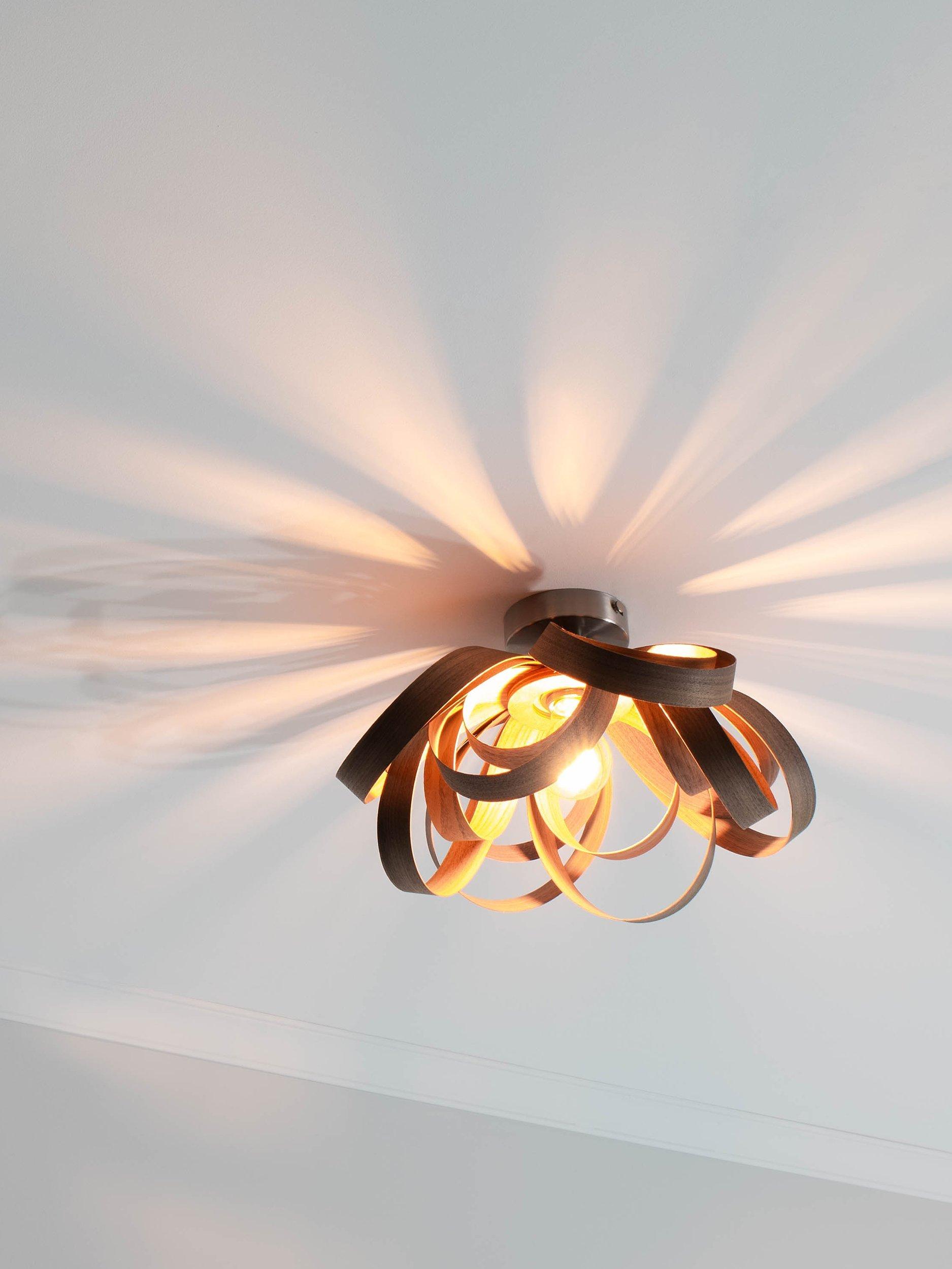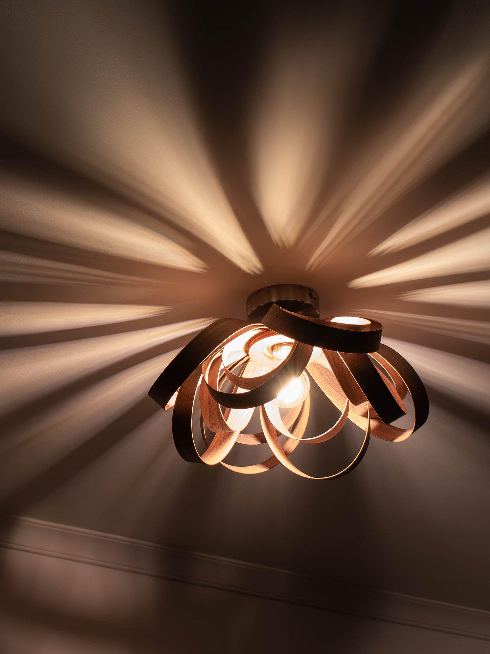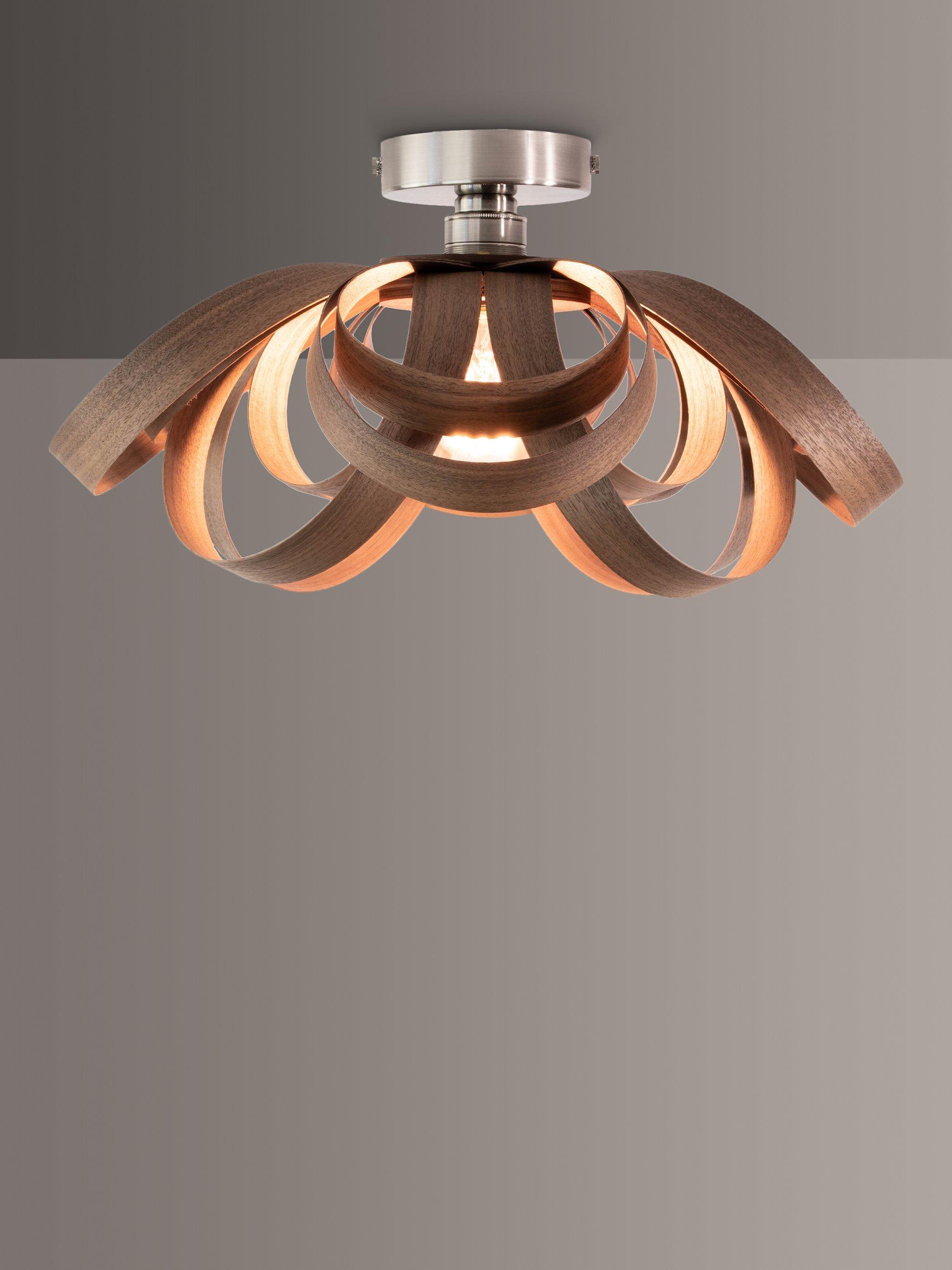 Fusing a Scandinavian-inspired design aesthetic with a modern and natural construction, the Skipper ceiling light from Tom Raffield offers a home lighting solution with statement appeal. With a smart, nickel ceiling rose, this smaller semi-flush fitting is ideal for rooms with low ceilings and it's made from sustainably-sourced oak or walnut wood. Formed into Raffield's signature steam-bent, curved design, light glows from the centre and spills through the gaps in each of the ribbons, casting an eye-catching wash of light on the ceiling and around your room with warm shadows.