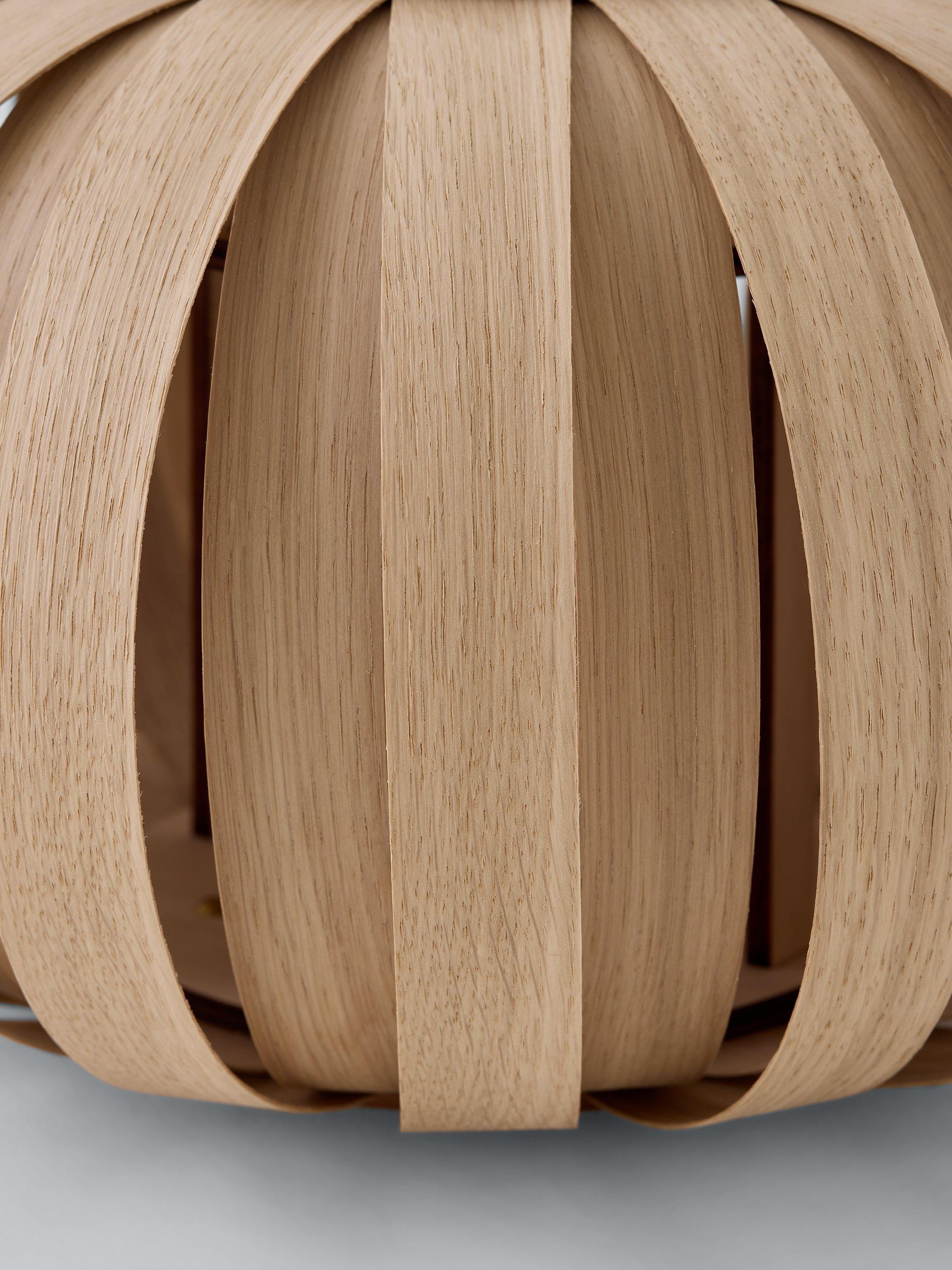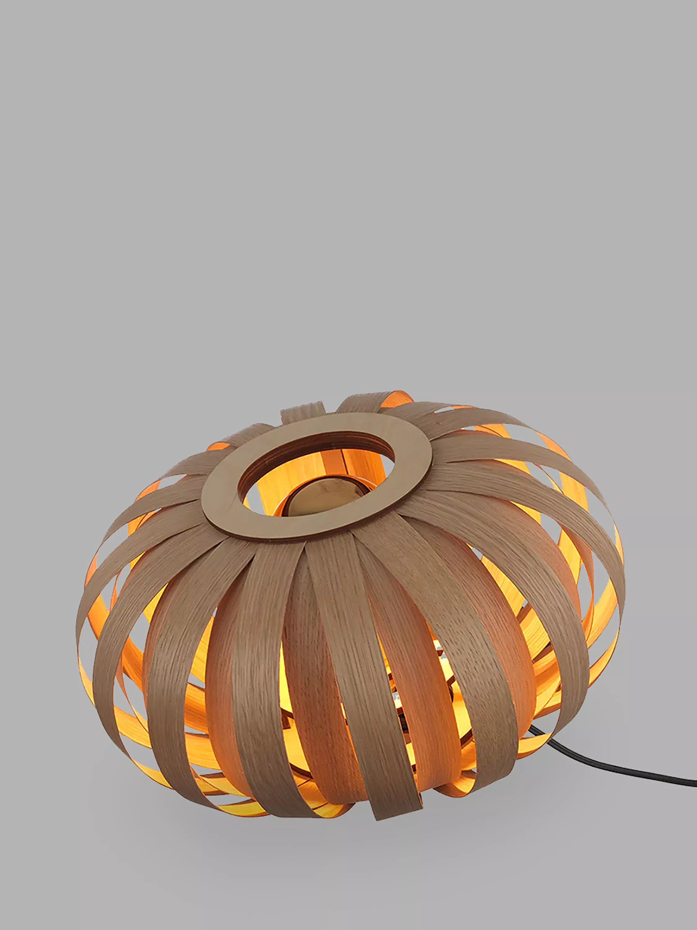 In the Urchin table lamp, 32 taut curves fuse together with laser-cut birch plates, carefully manipulated to conceal the bulb. Sustainable oak or walnut sees light escape through the seams, creating pools of brightness in the dark.