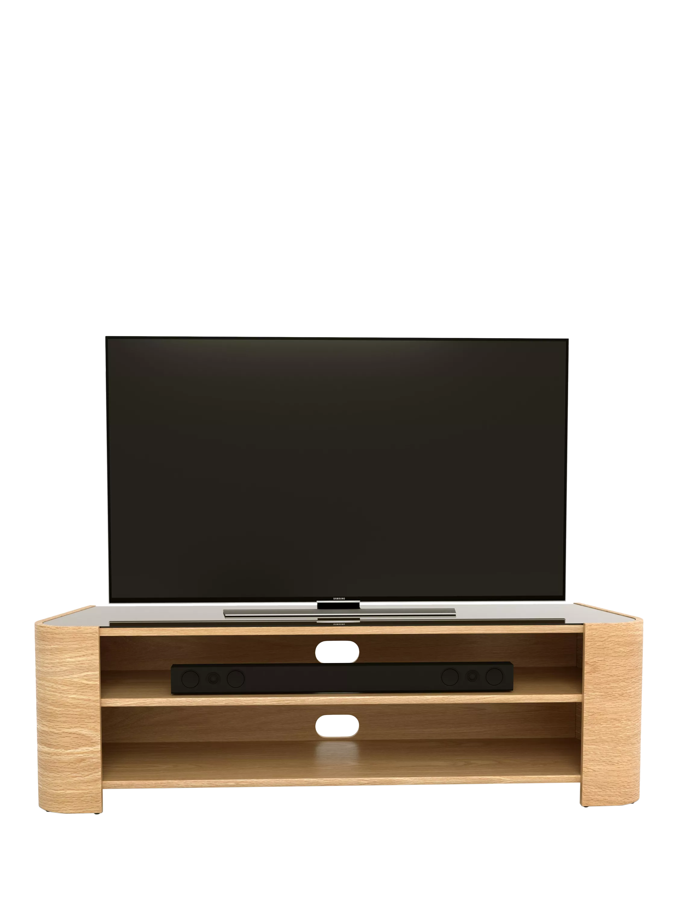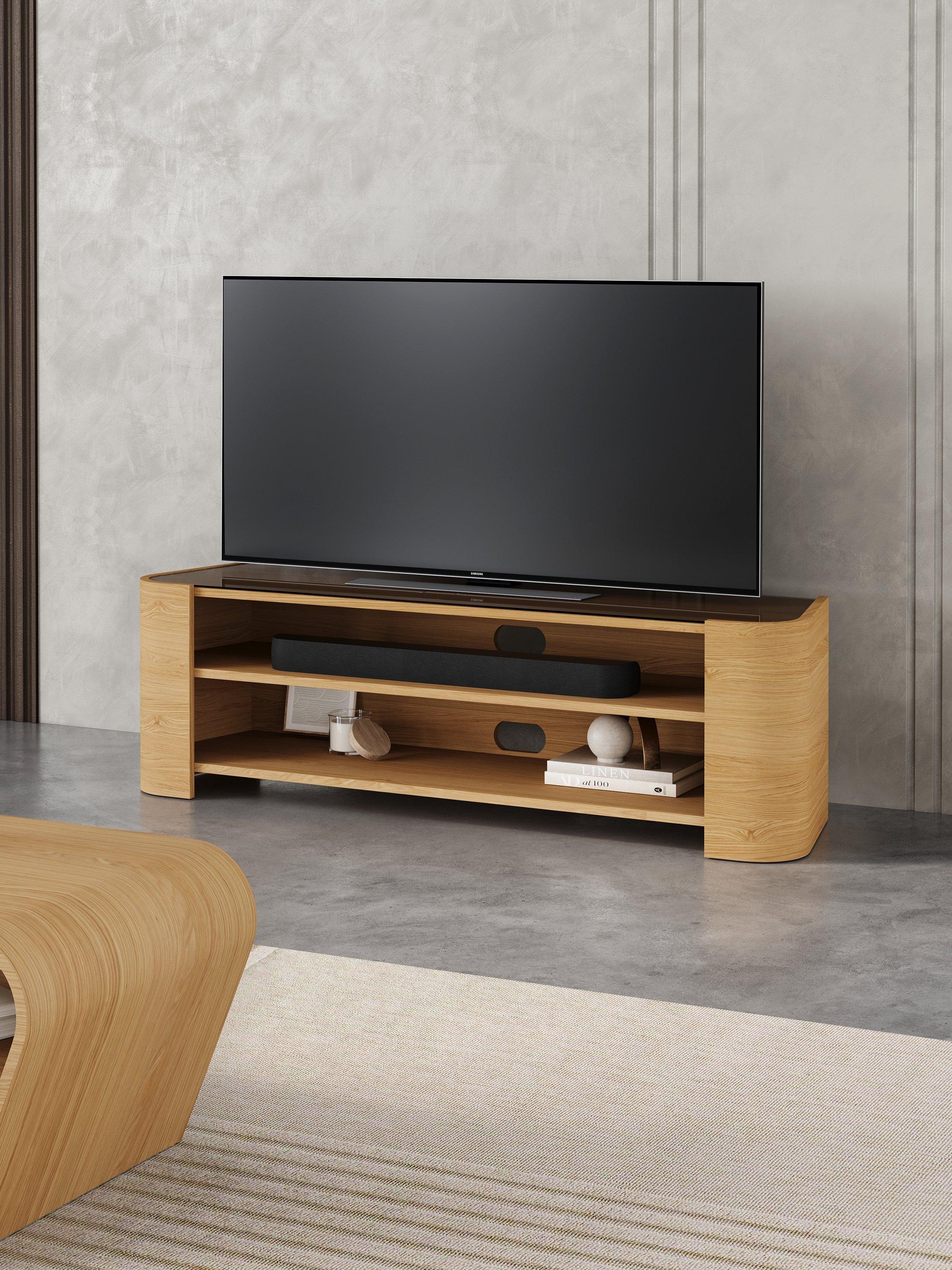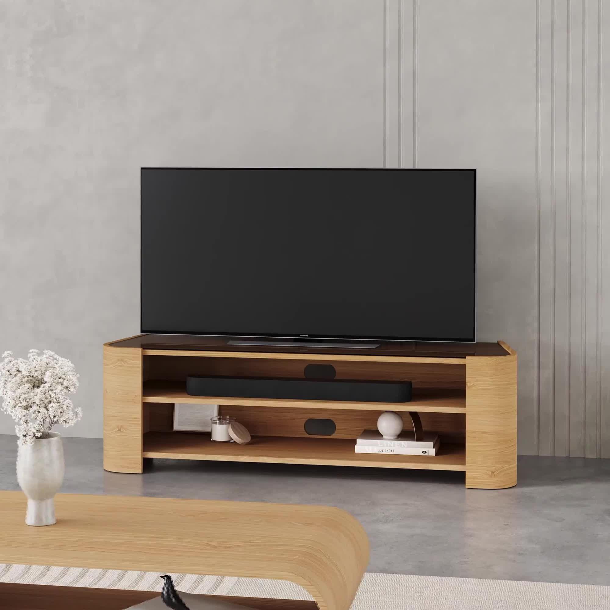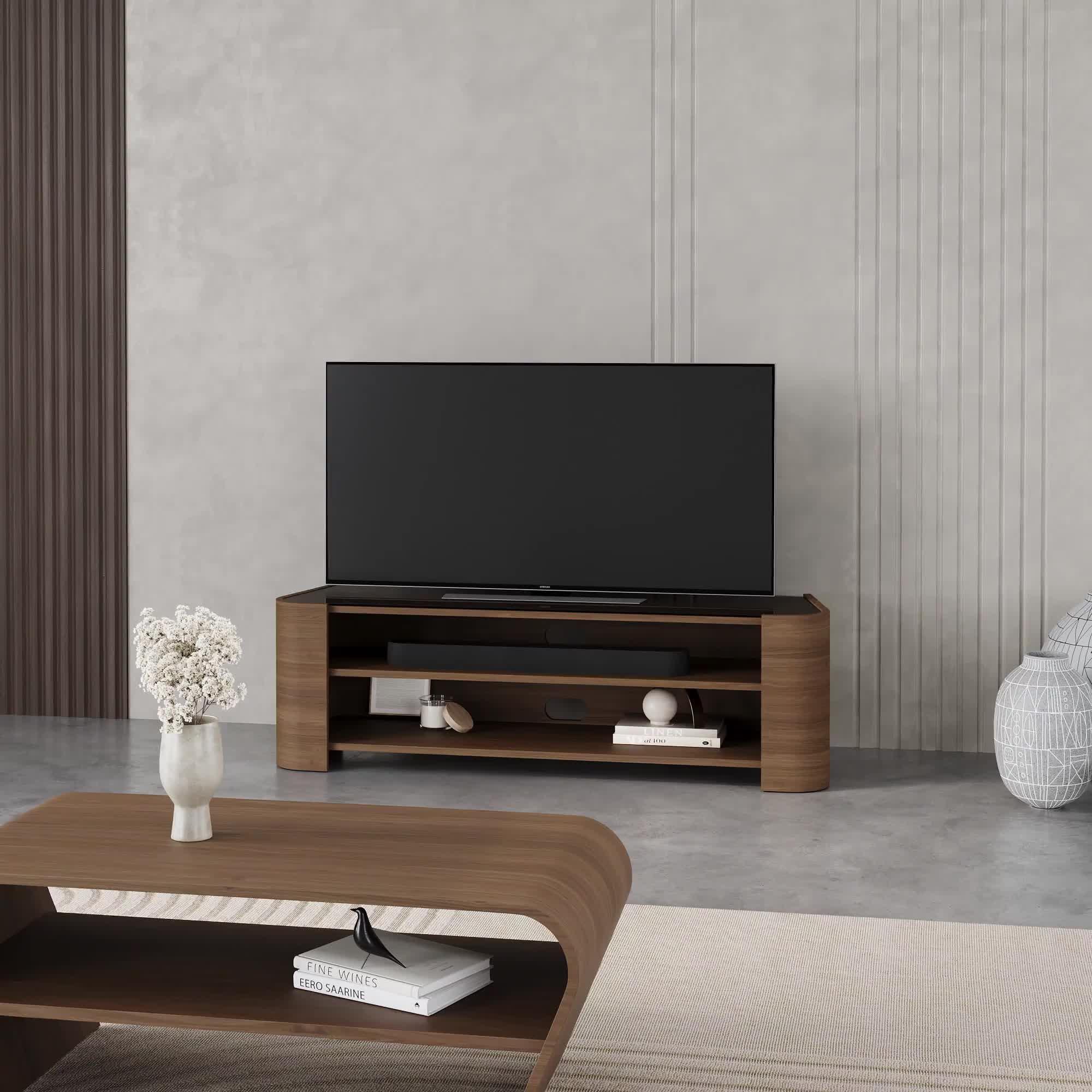 The Cruz media unit combines the functionality of ample storage space for a sound bar and media units with an elegant and contemporary shape. Toughened smoked glass provides the perfect accent to this piece and the tapering design narrows from front to back to make it corner friendly.