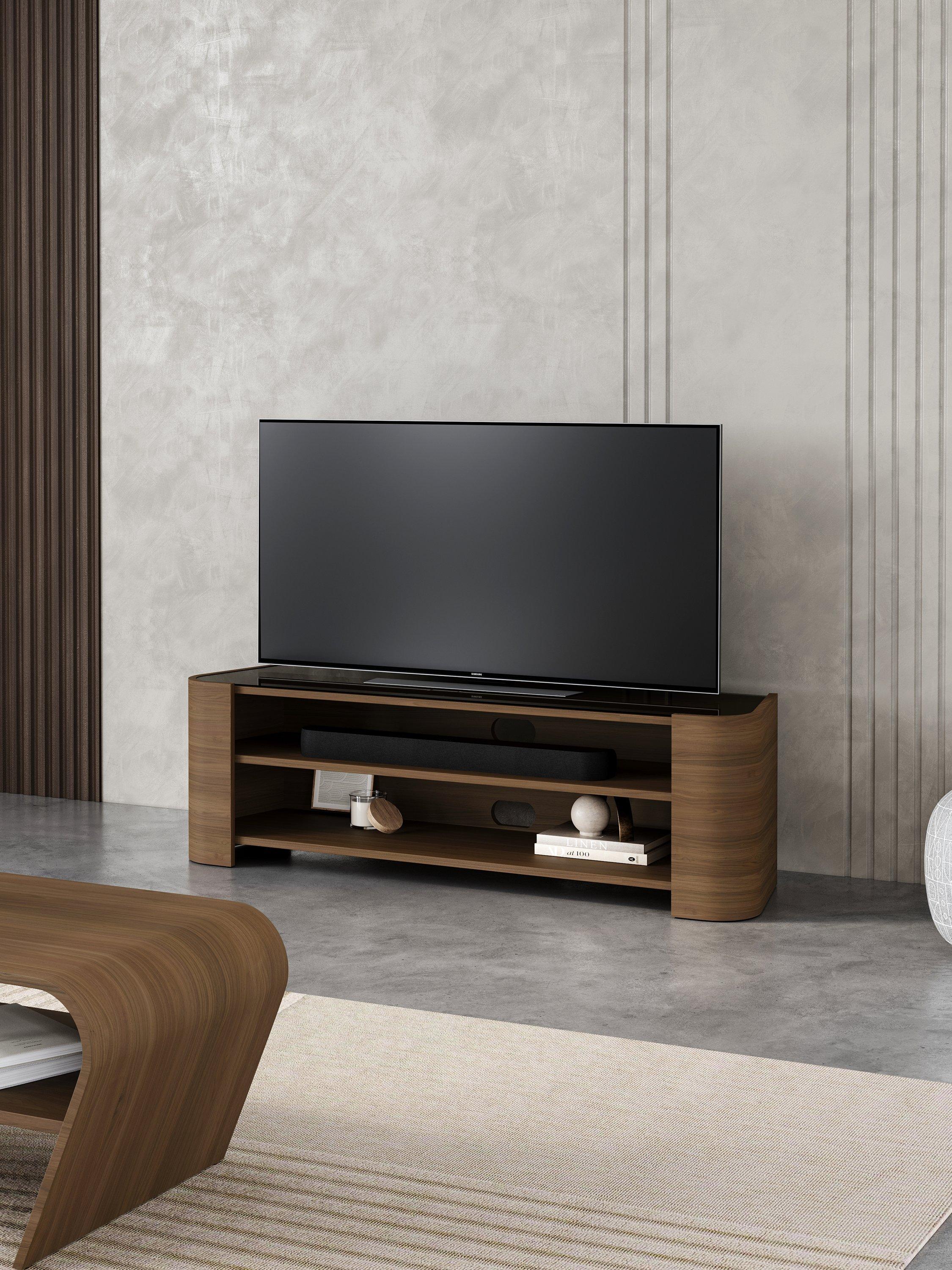 The Cruz media unit combines the functionality of ample storage space for a sound bar and media units with an elegant and contemporary shape. Toughened smoked glass provides the perfect accent to this piece and the tapering design narrows from front to back to make it corner friendly.