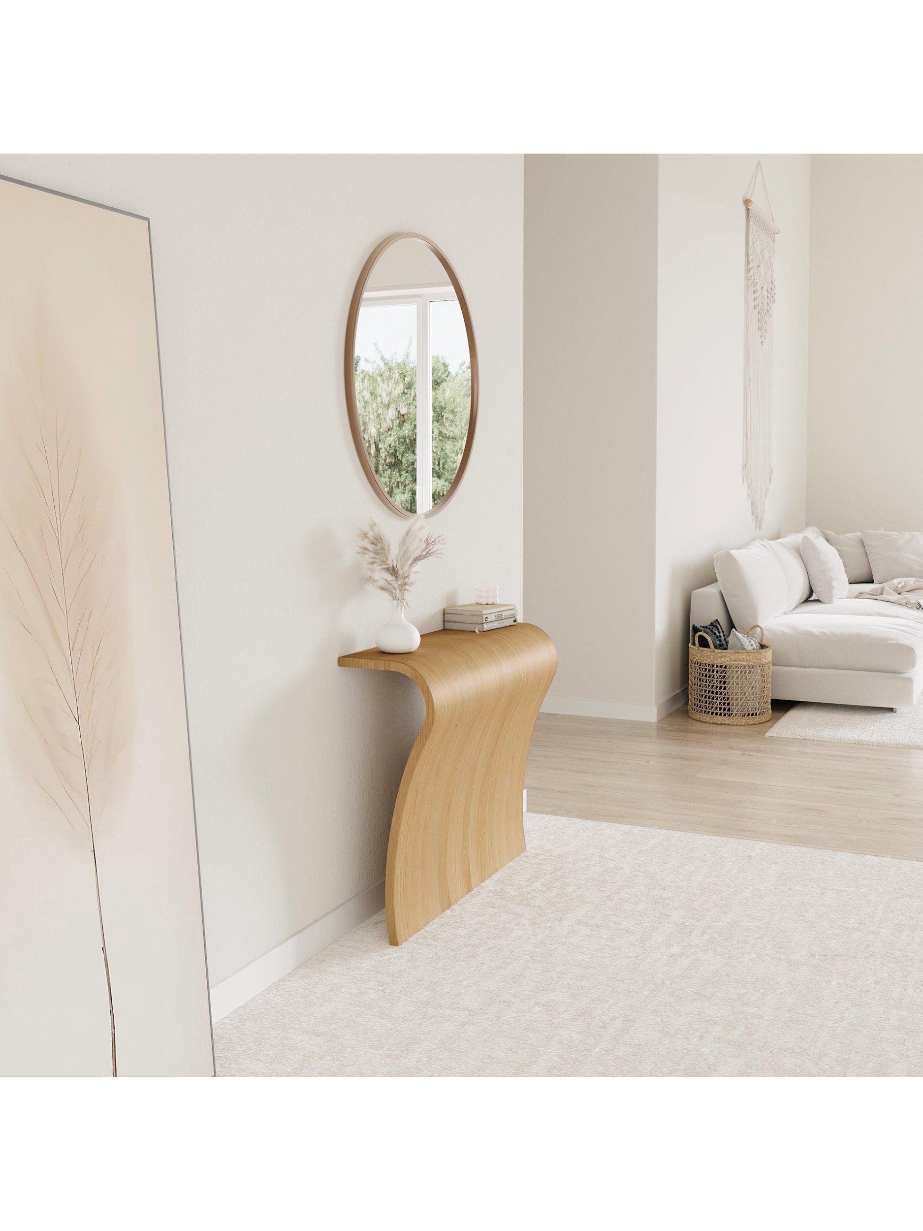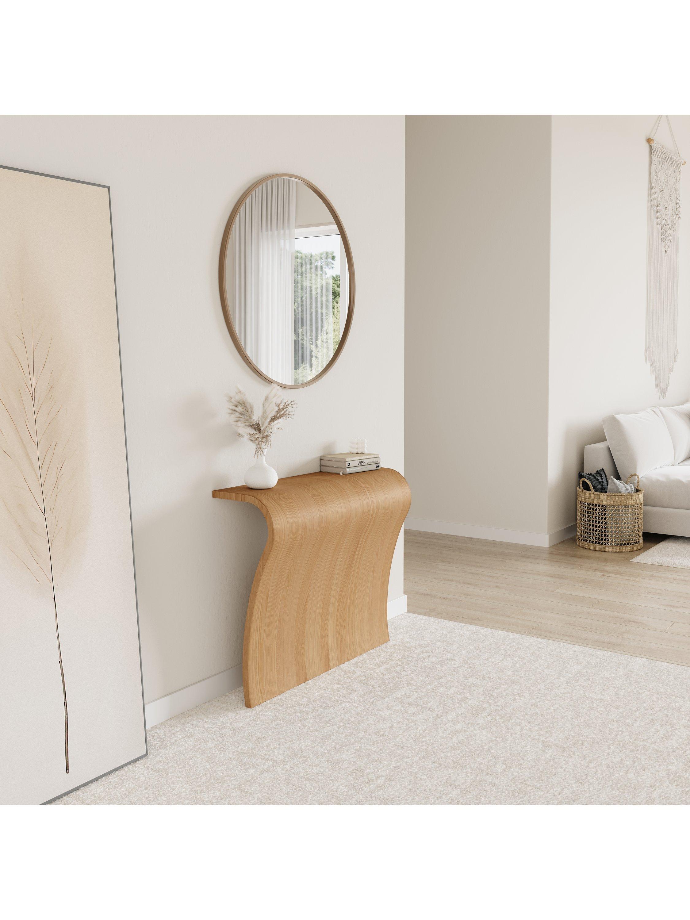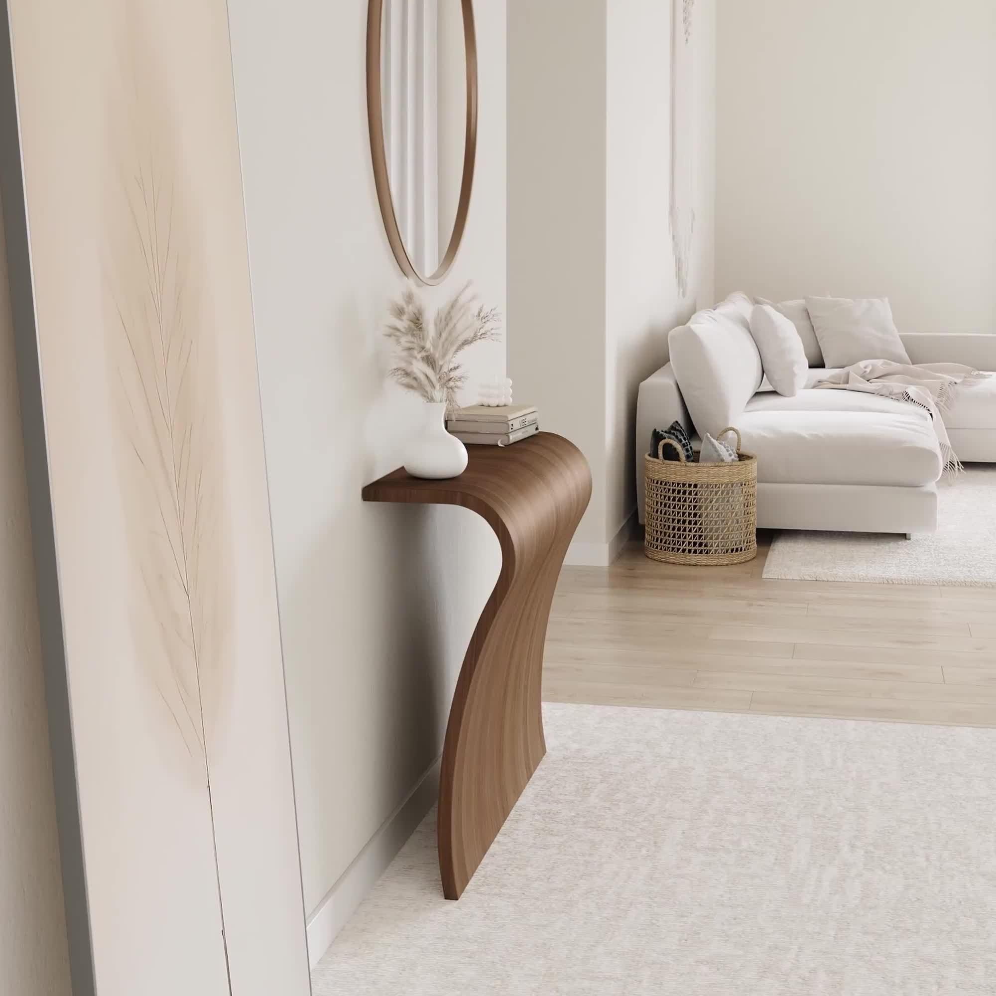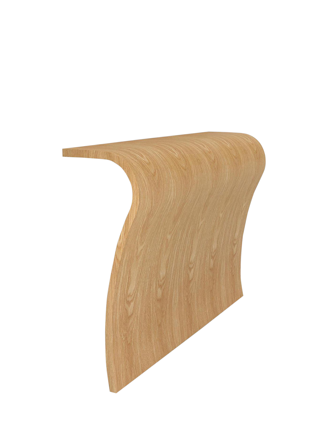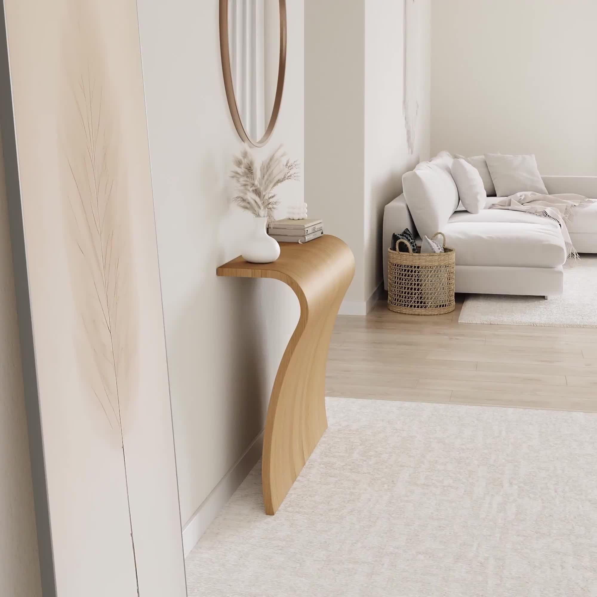 The Elle console features an elegant sculpted sheet of wood that is instantly alluring. Designed to lean against a wall, this item is cleverly weighted allowing it to stand without wall fixings.