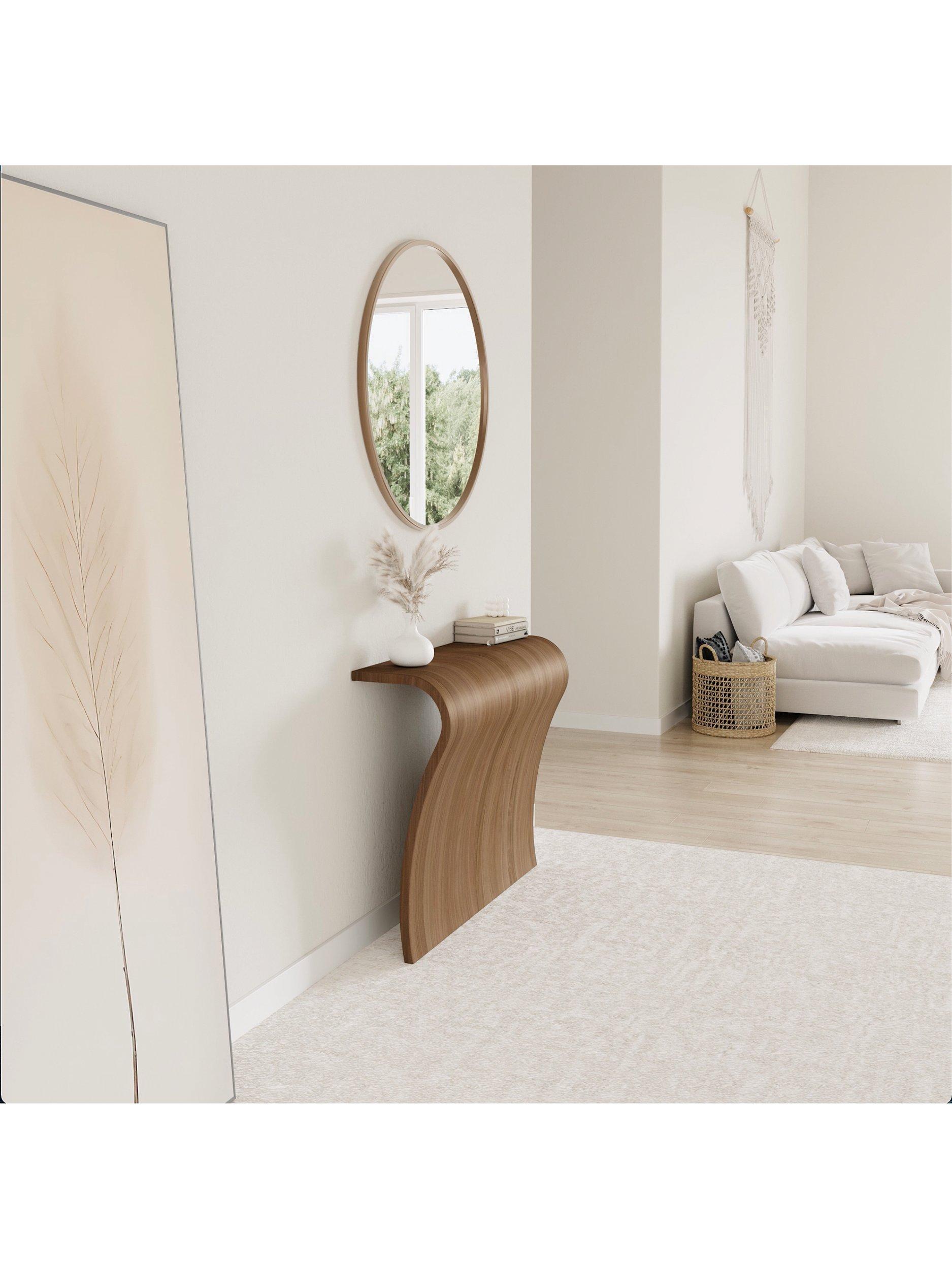 The Elle console features an elegant sculpted sheet of wood that is instantly alluring. Designed to lean against a wall, this item is cleverly weighted allowing it to stand without wall fixings.