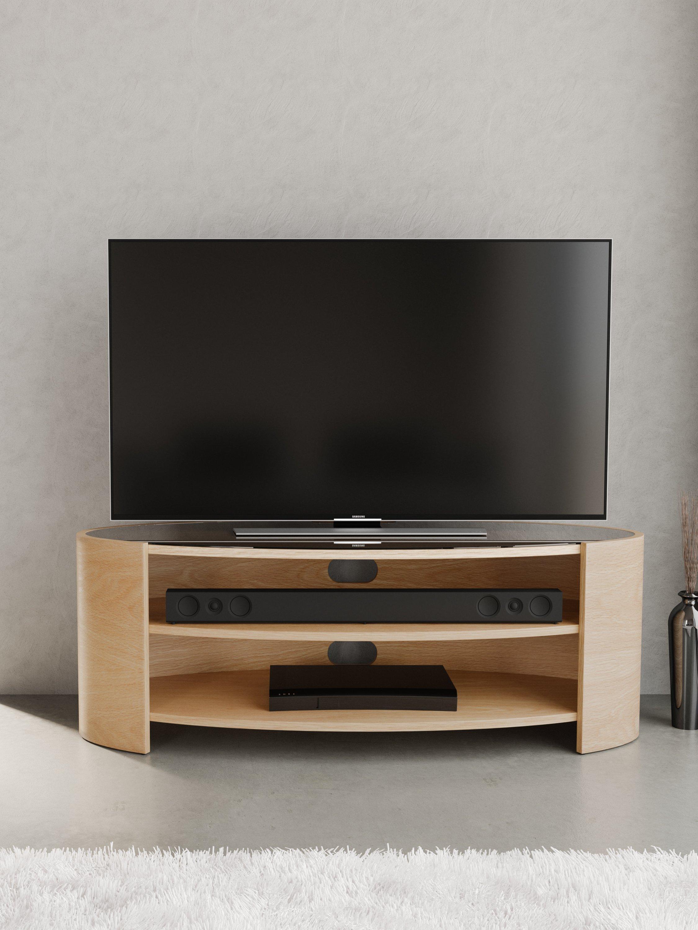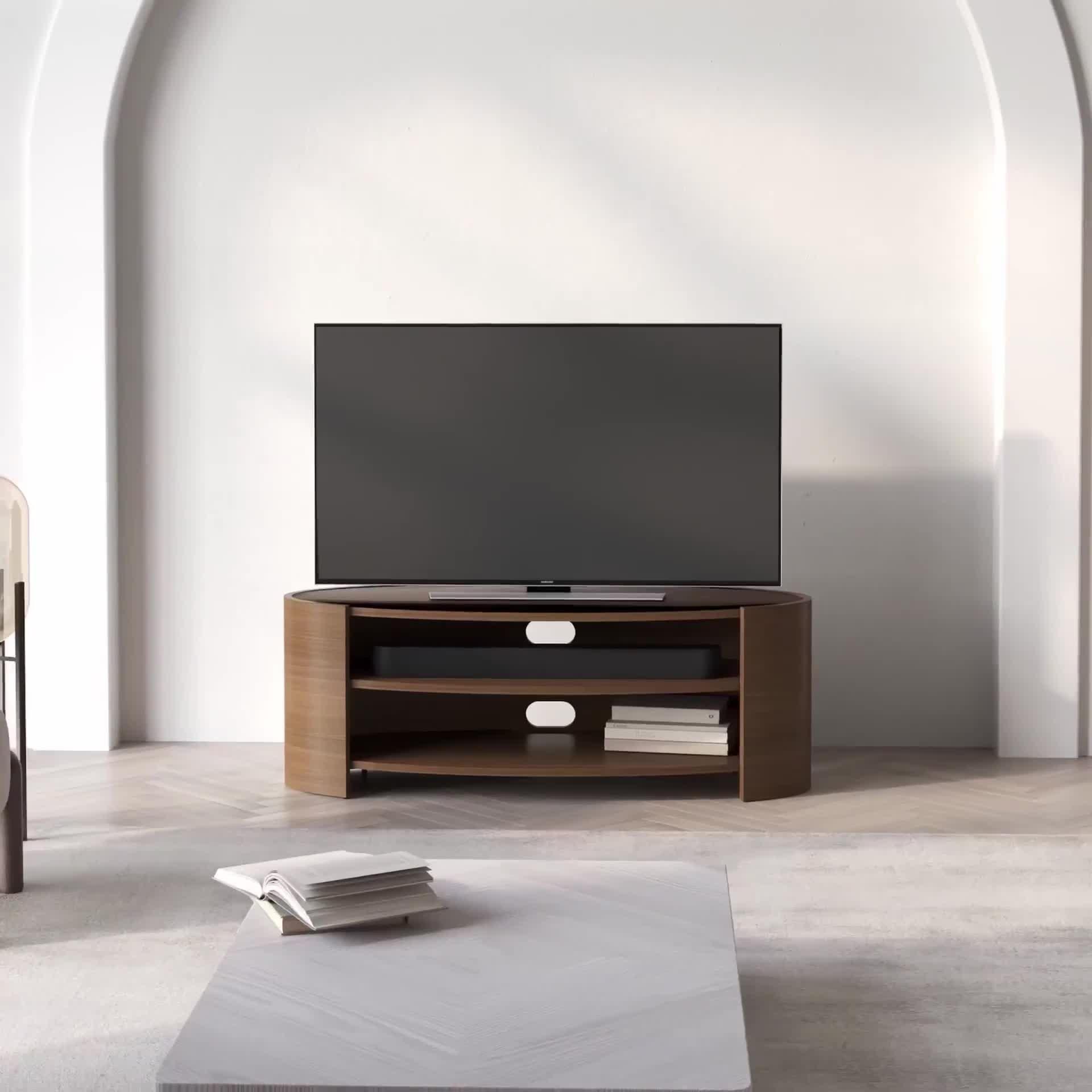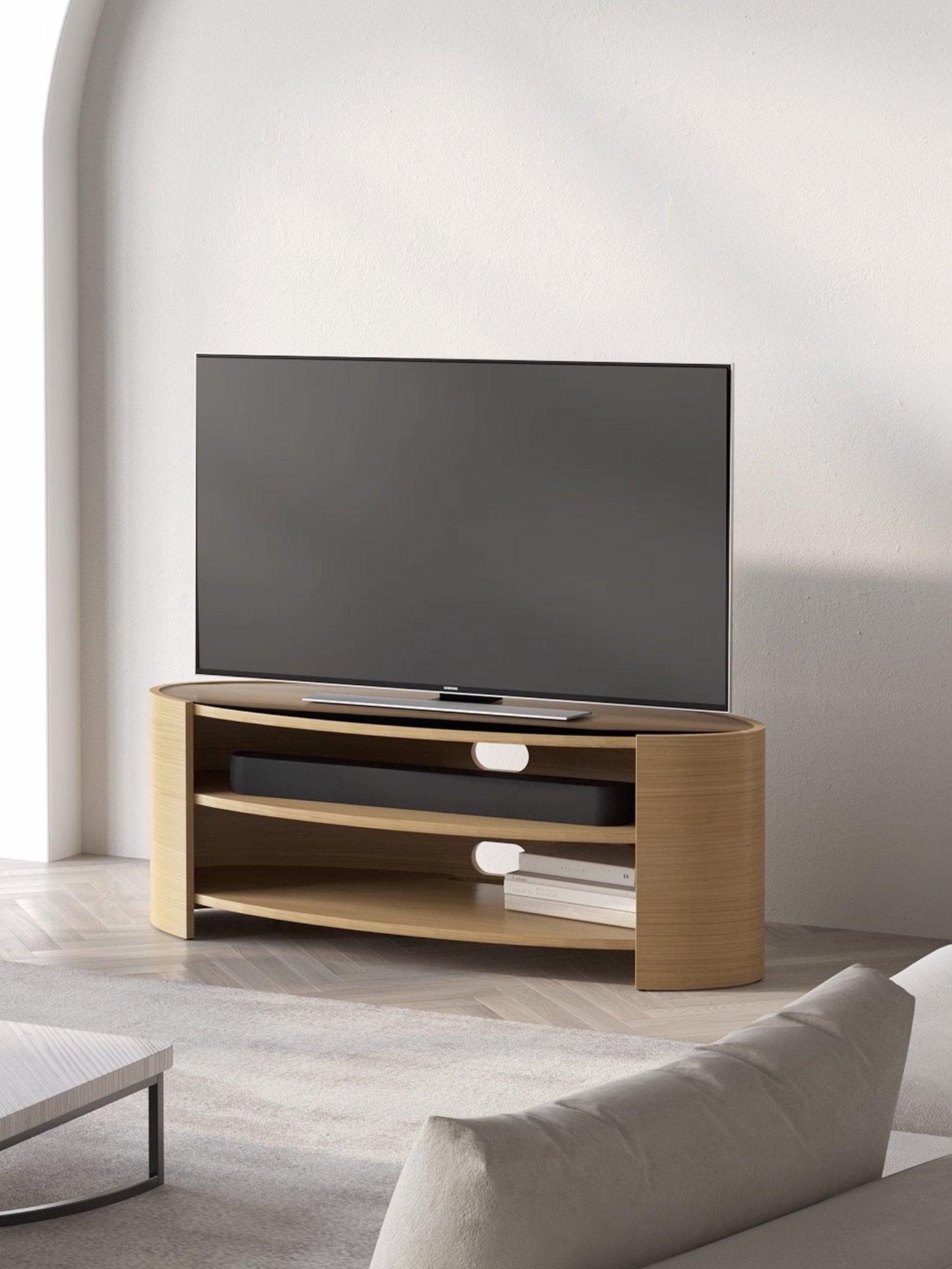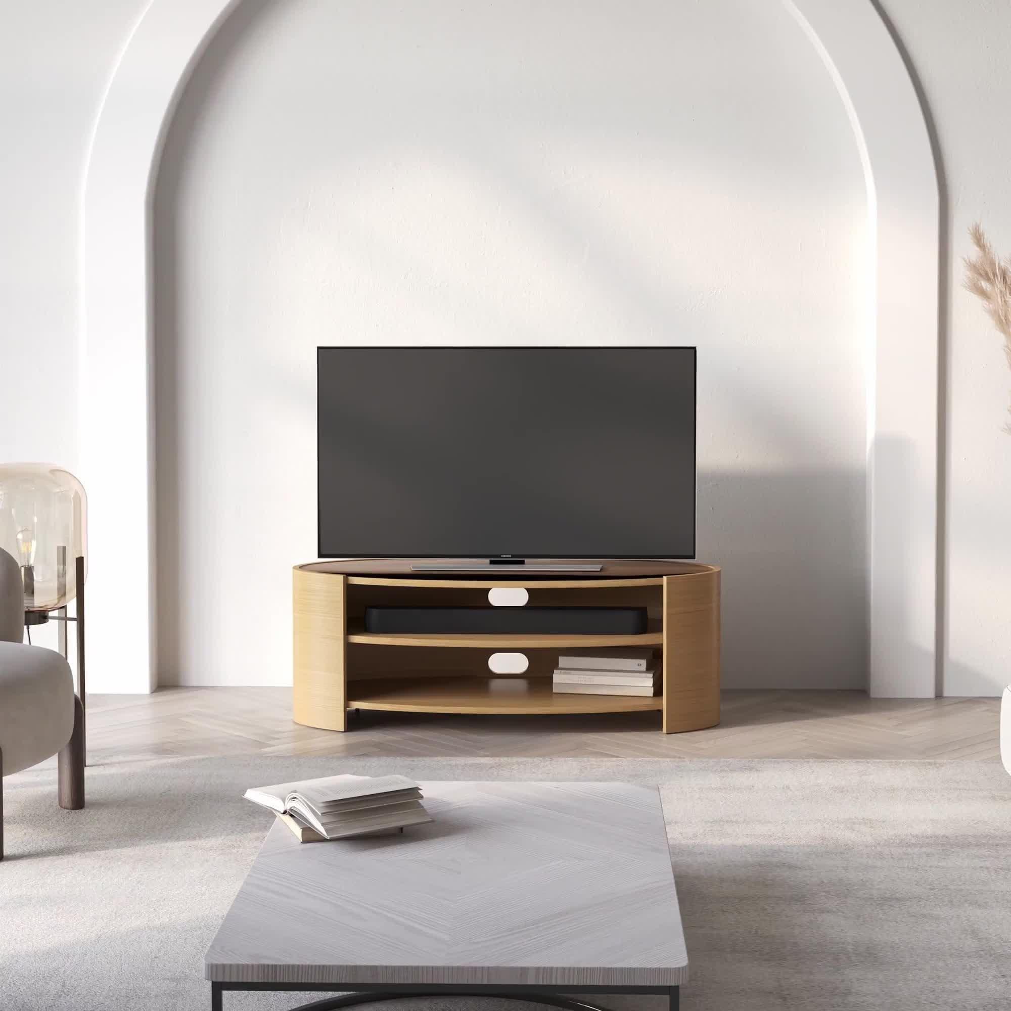 The Elliptic Deluxe media unit, with its elegantly curvaceous, open elliptical form, offers a striking organic contrast to the linear design of modern televisions. This media unit's toughened glass top complements the sophisticated silhouette, while integrated cable management, built-in ventilation, and sound bar space ensure seamless functionality.