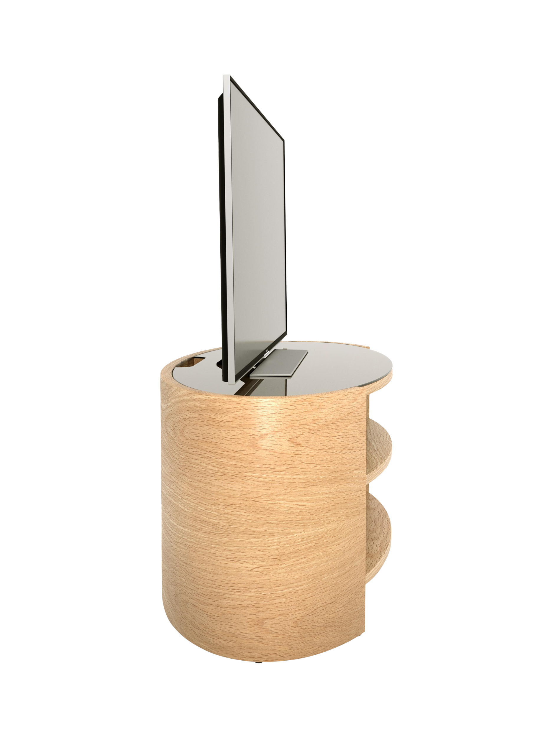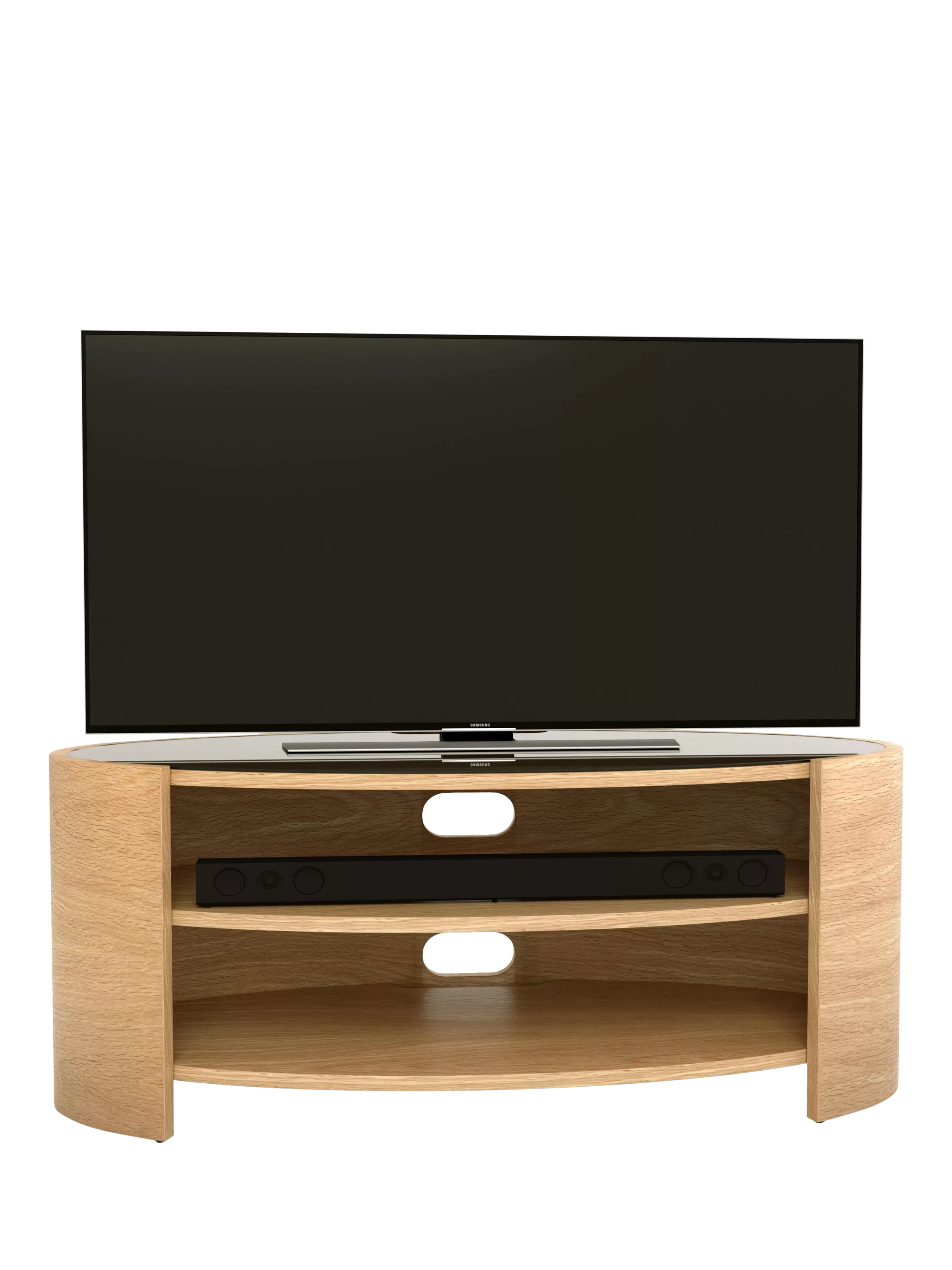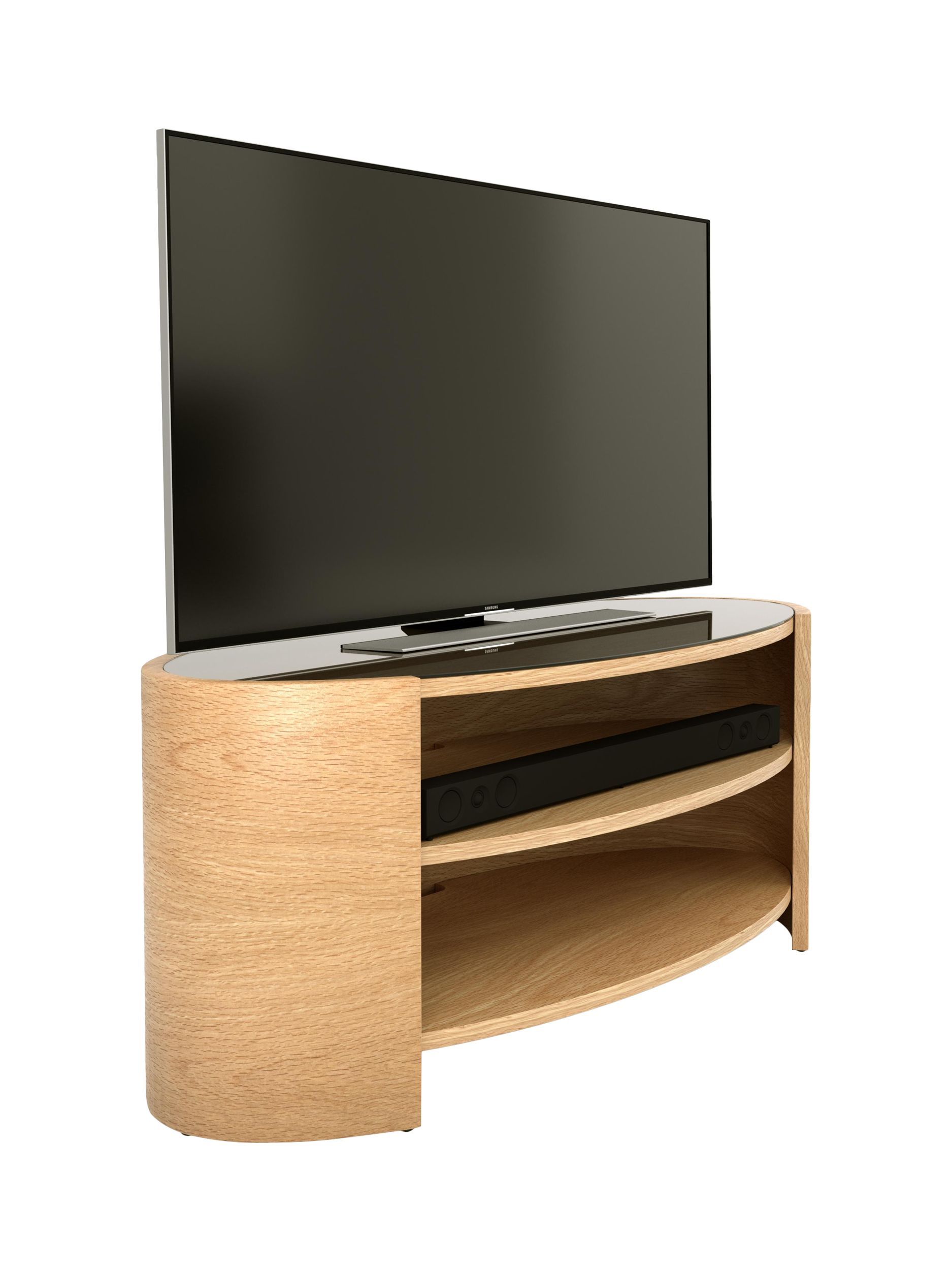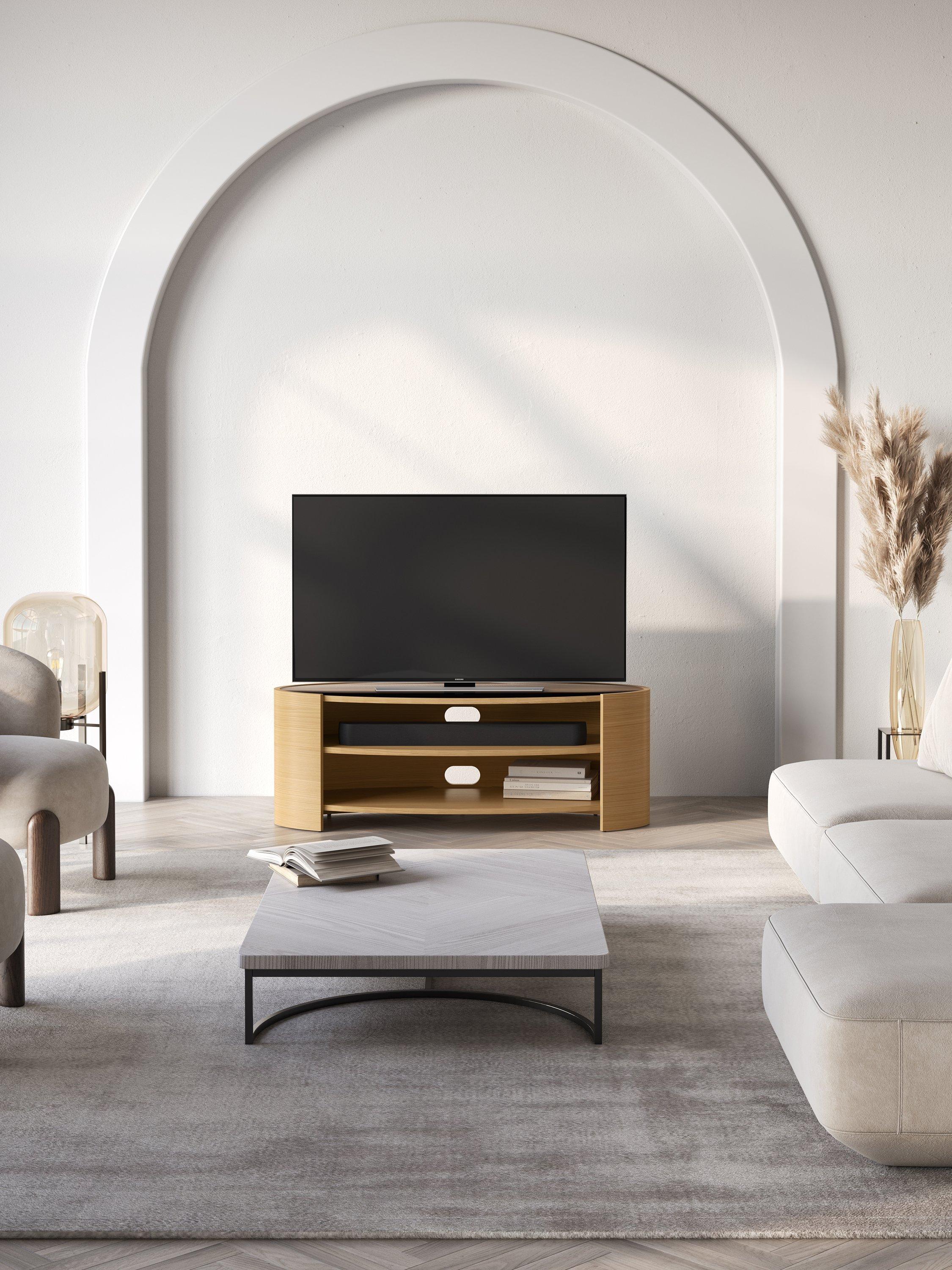 The Elliptic Deluxe media unit, with its elegantly curvaceous, open elliptical form, offers a striking organic contrast to the linear design of modern televisions. This media unit's toughened glass top complements the sophisticated silhouette, while integrated cable management, built-in ventilation, and sound bar space ensure seamless functionality.