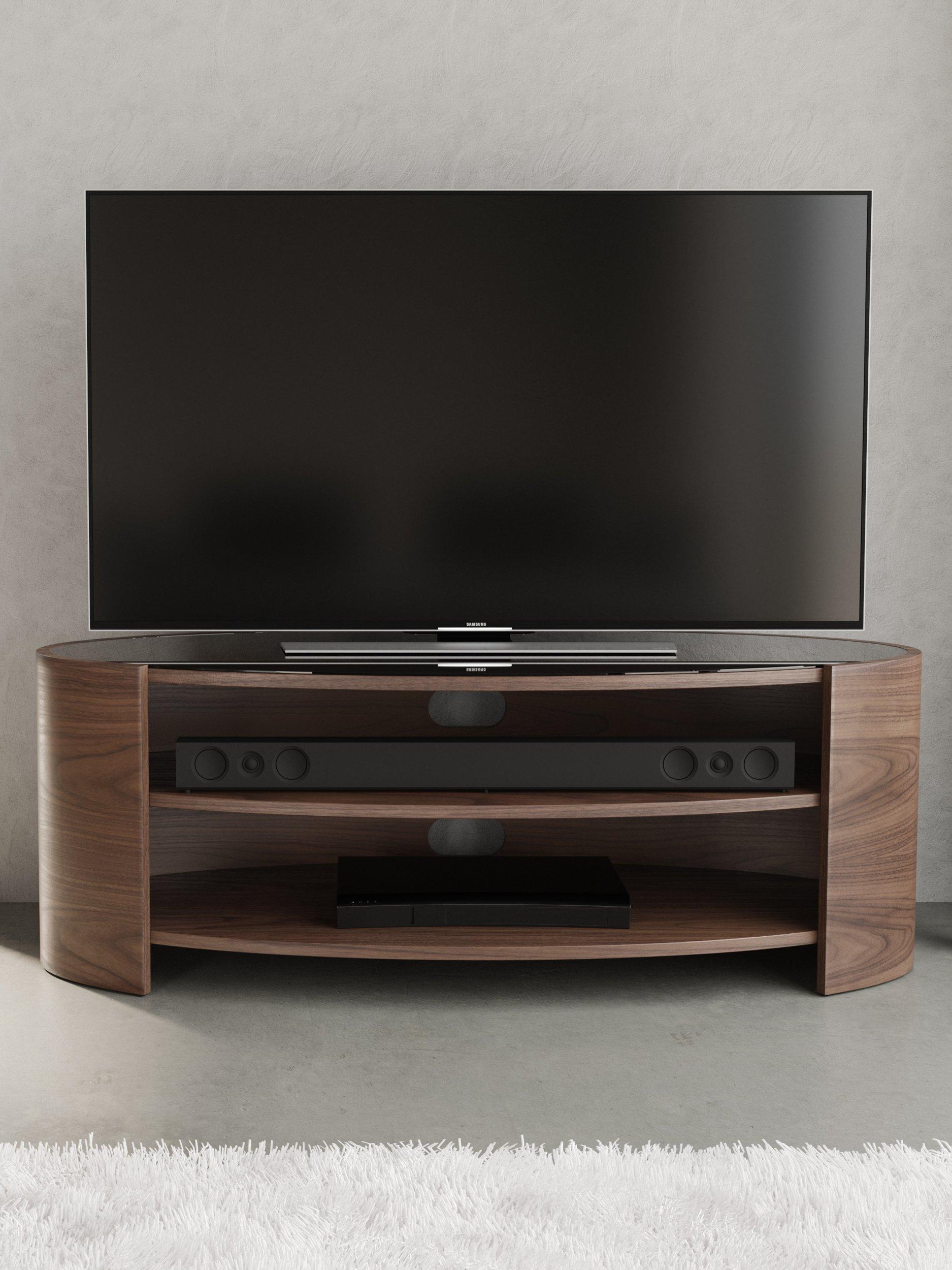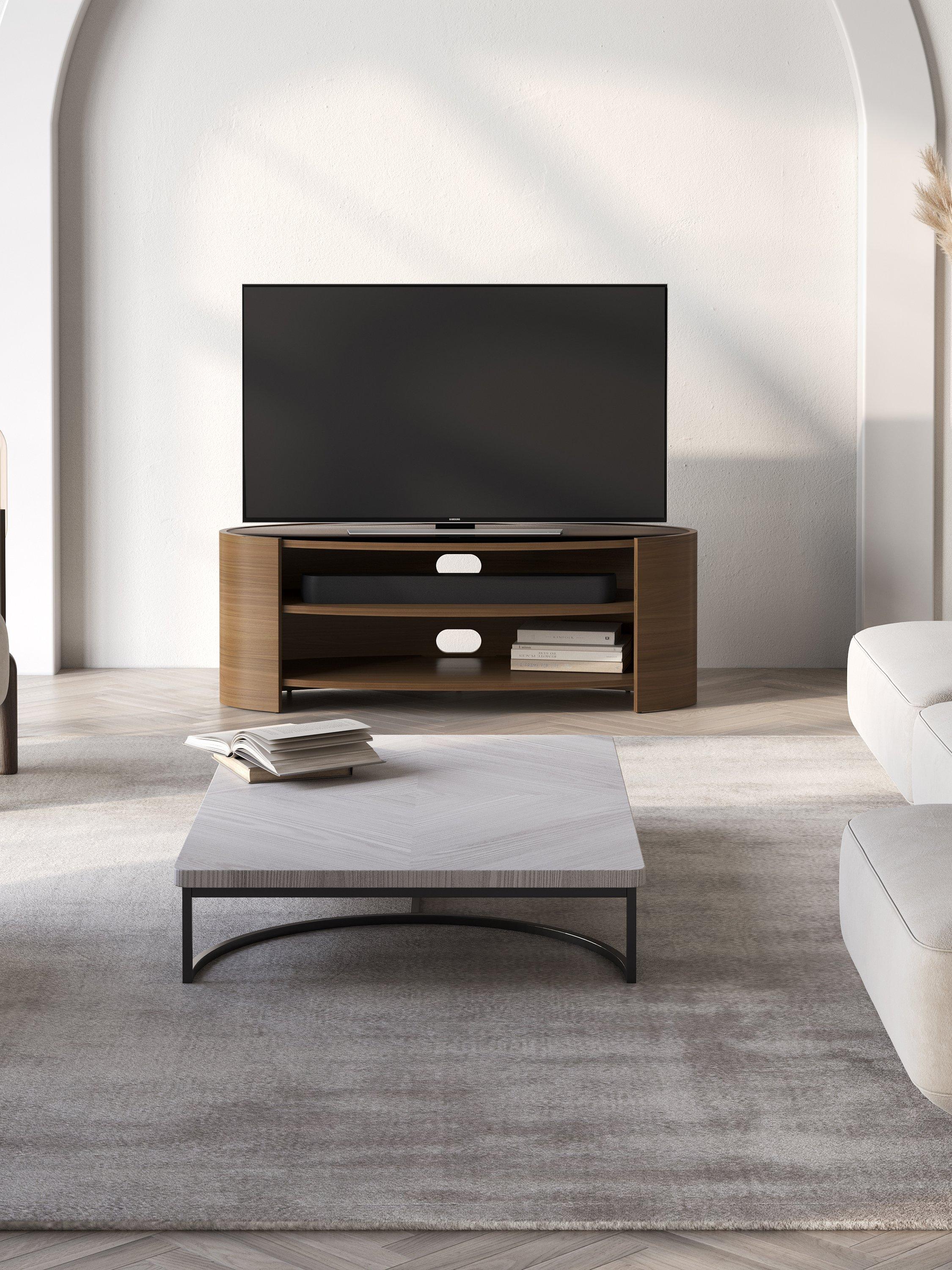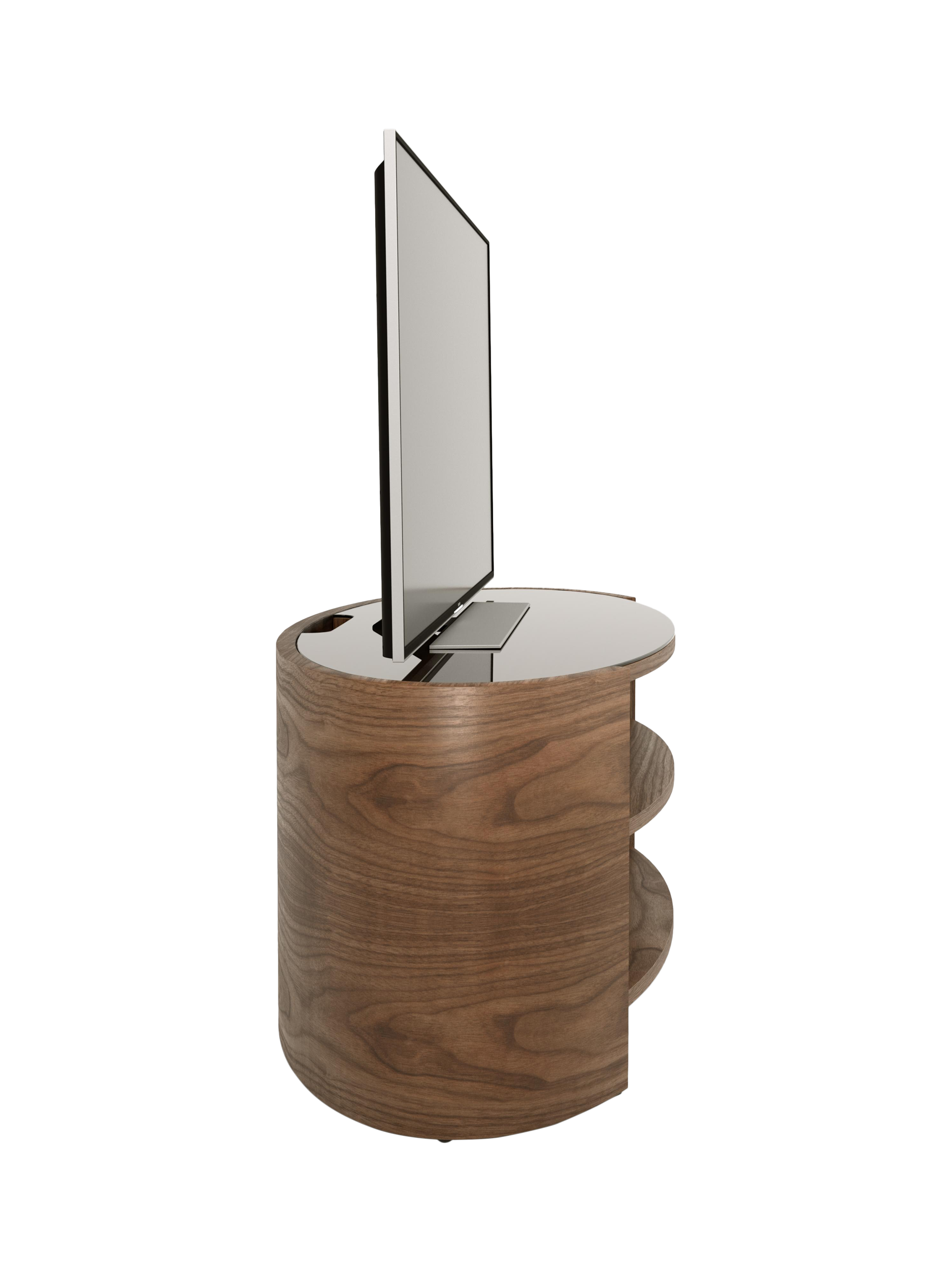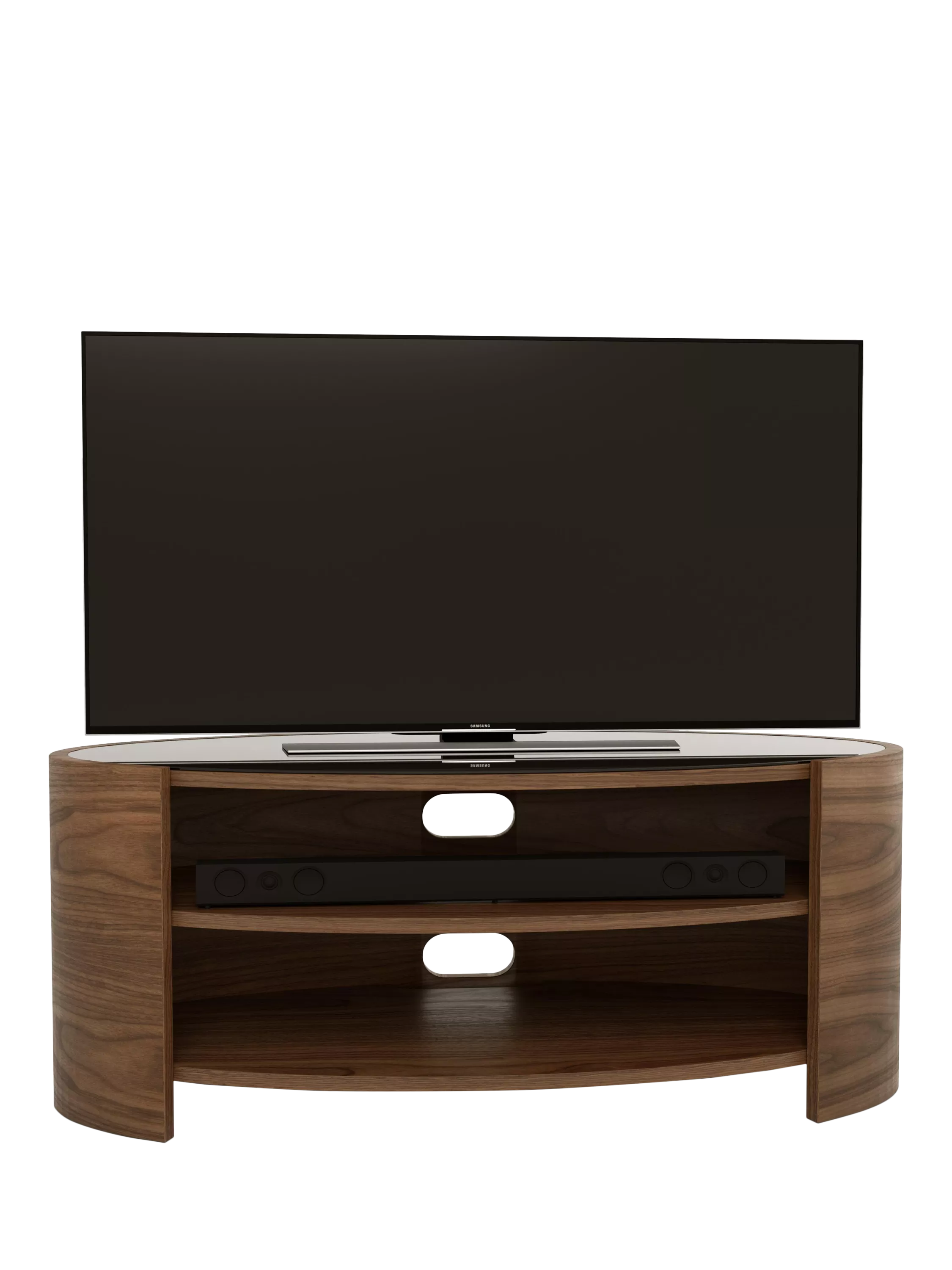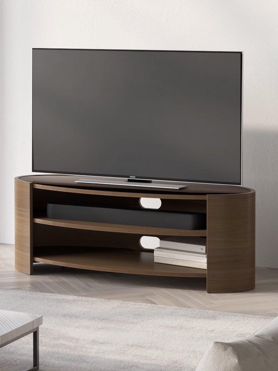 The Elliptic Deluxe media unit, with its elegantly curvaceous, open elliptical form, offers a striking organic contrast to the linear design of modern televisions. This media unit's toughened glass top complements the sophisticated silhouette, while integrated cable management, built-in ventilation, and sound bar space ensure seamless functionality.