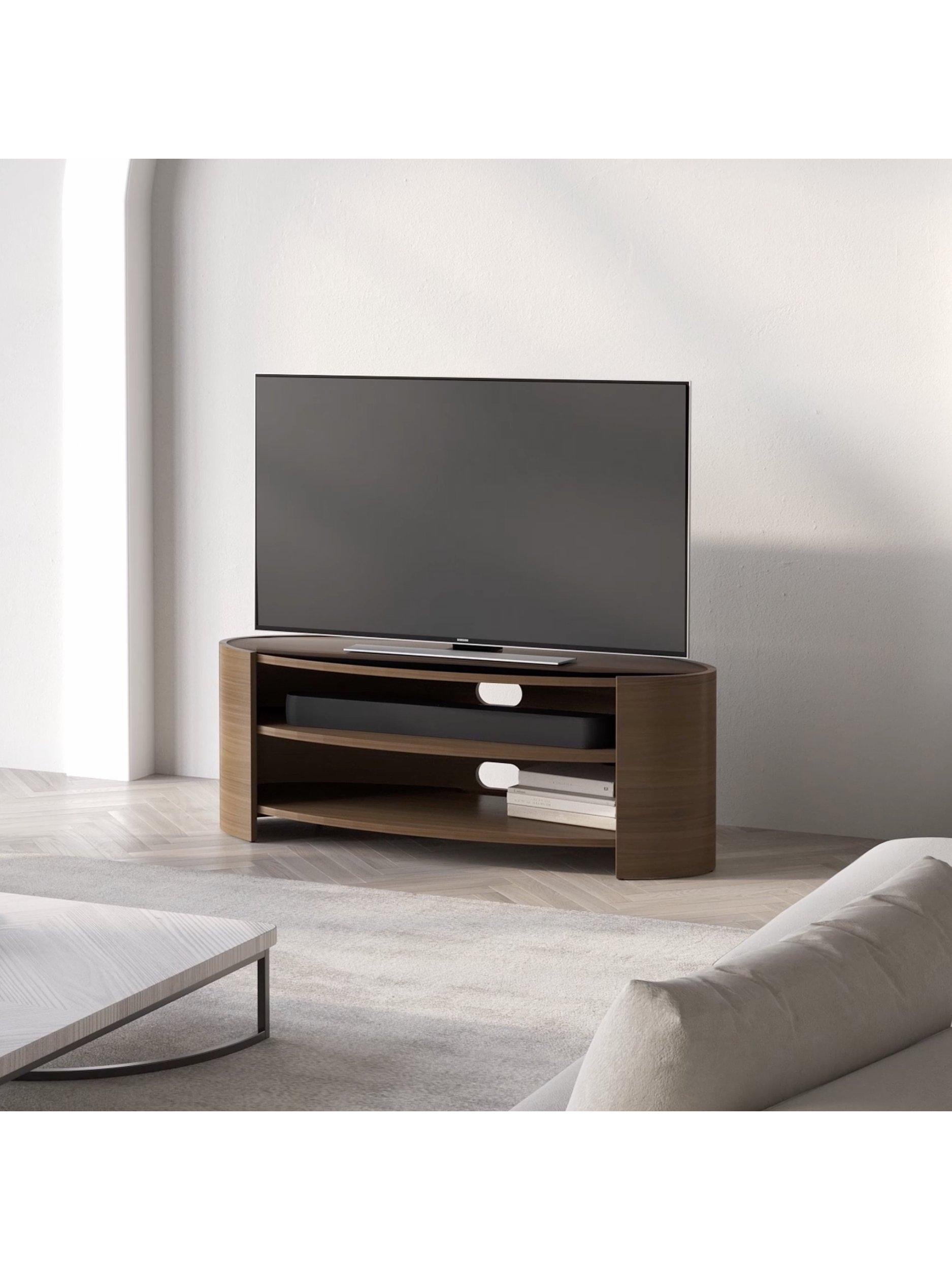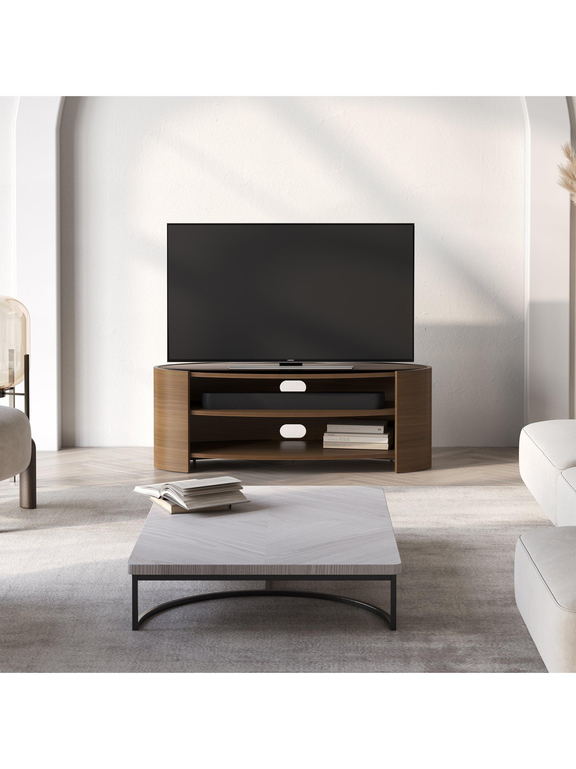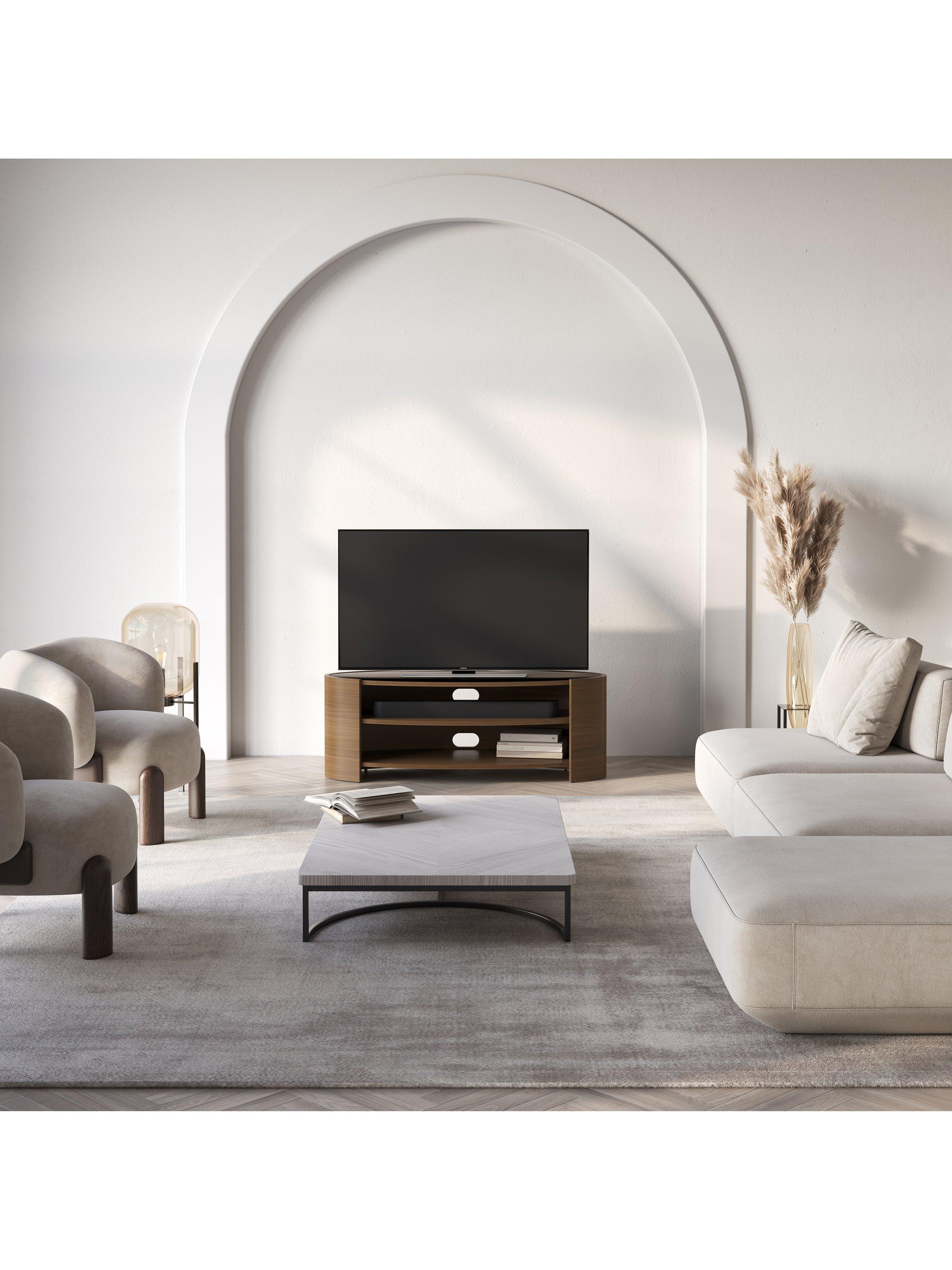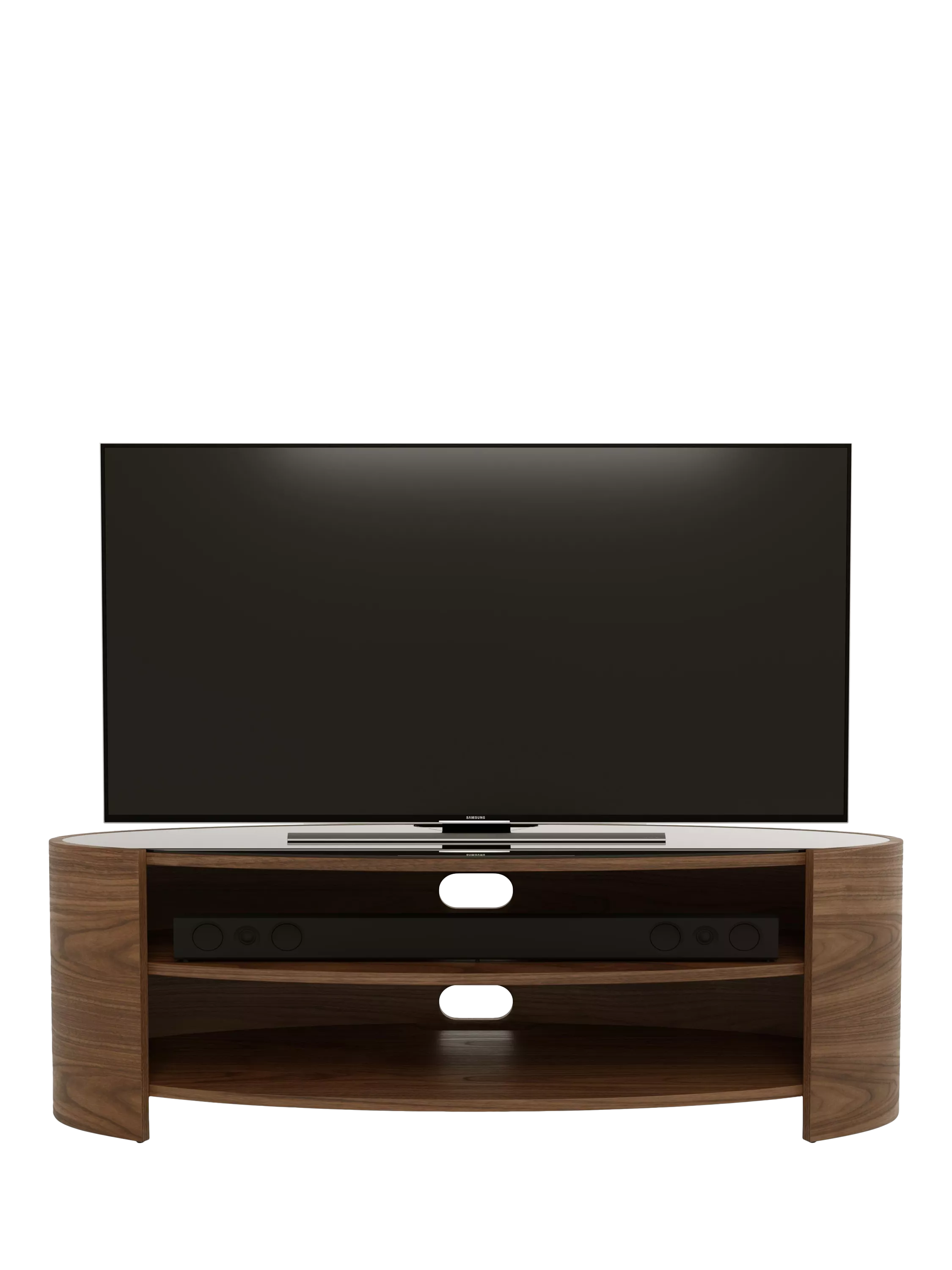 The Elliptic Deluxe media unit, with its elegantly curvaceous, open elliptical form, offers a striking organic contrast to the linear design of modern televisions. This media unit's toughened glass top complements the sophisticated silhouette, while integrated cable management, built-in ventilation, and sound bar space ensure seamless functionality.