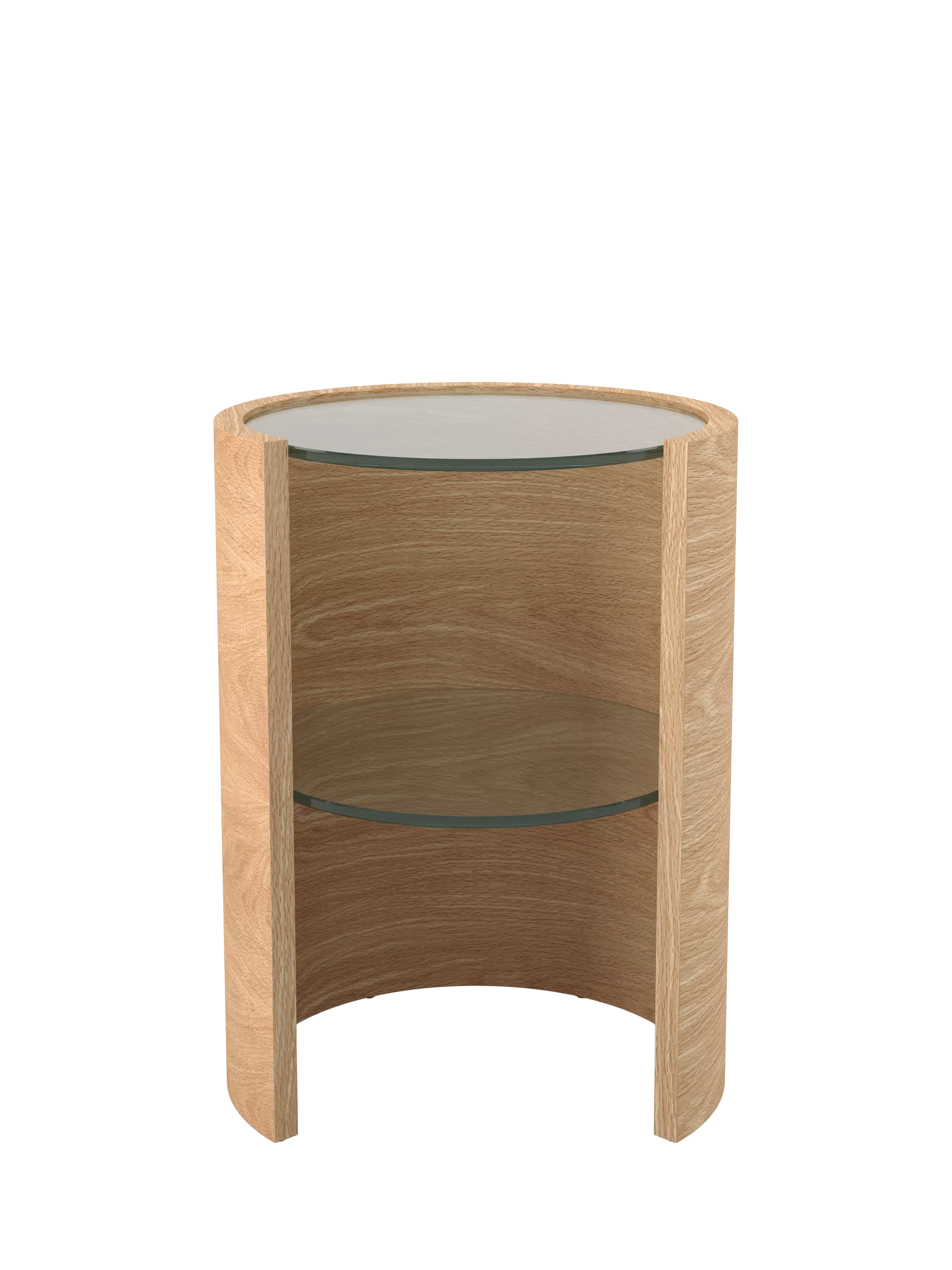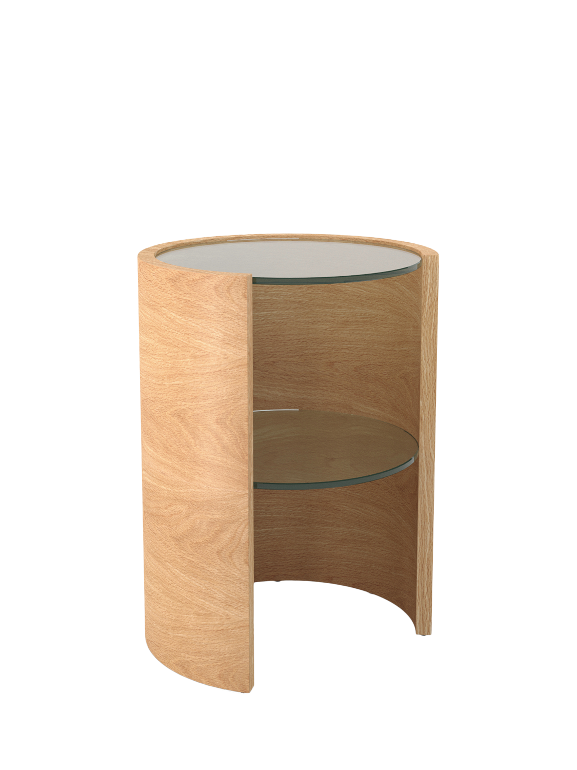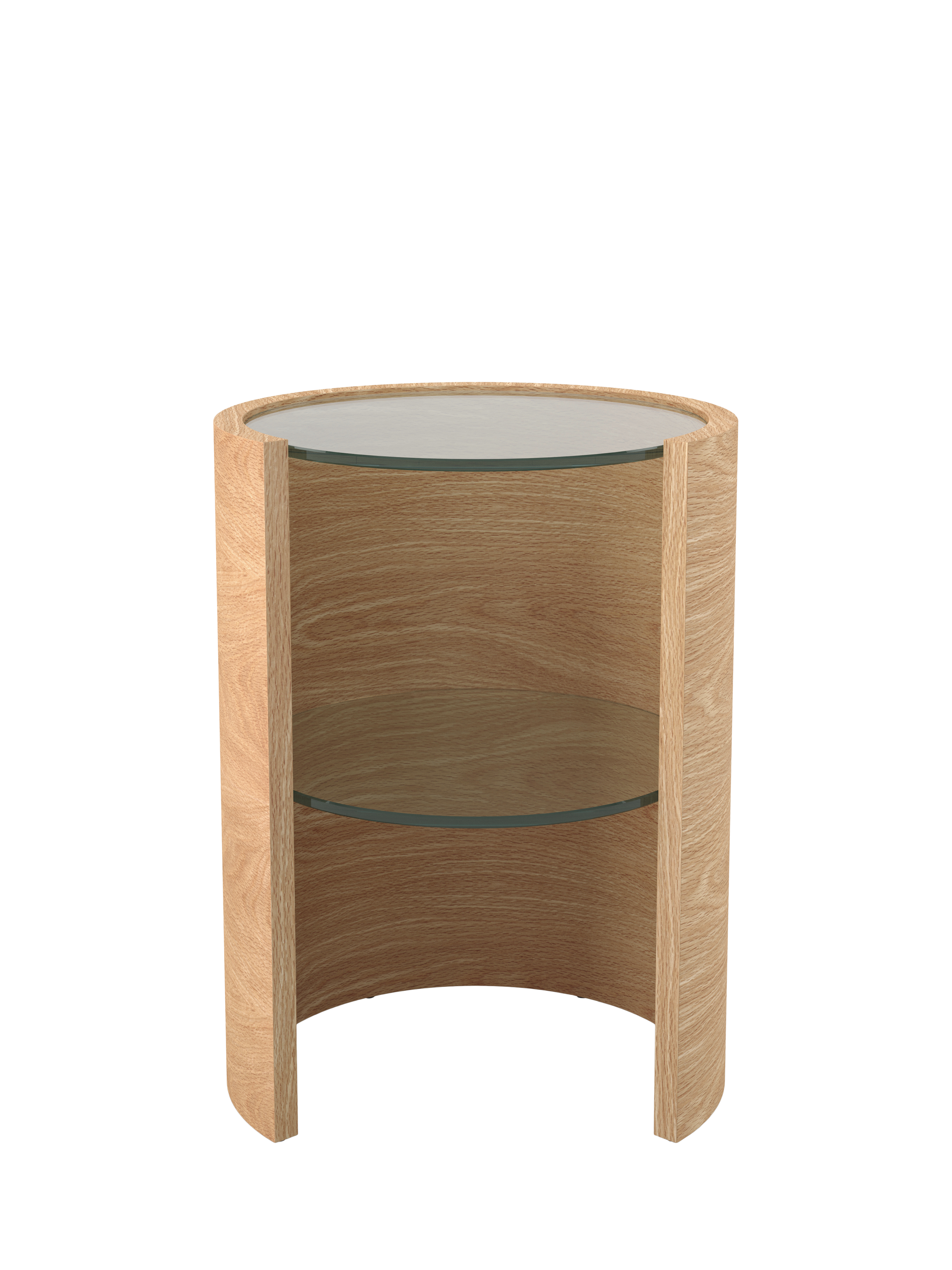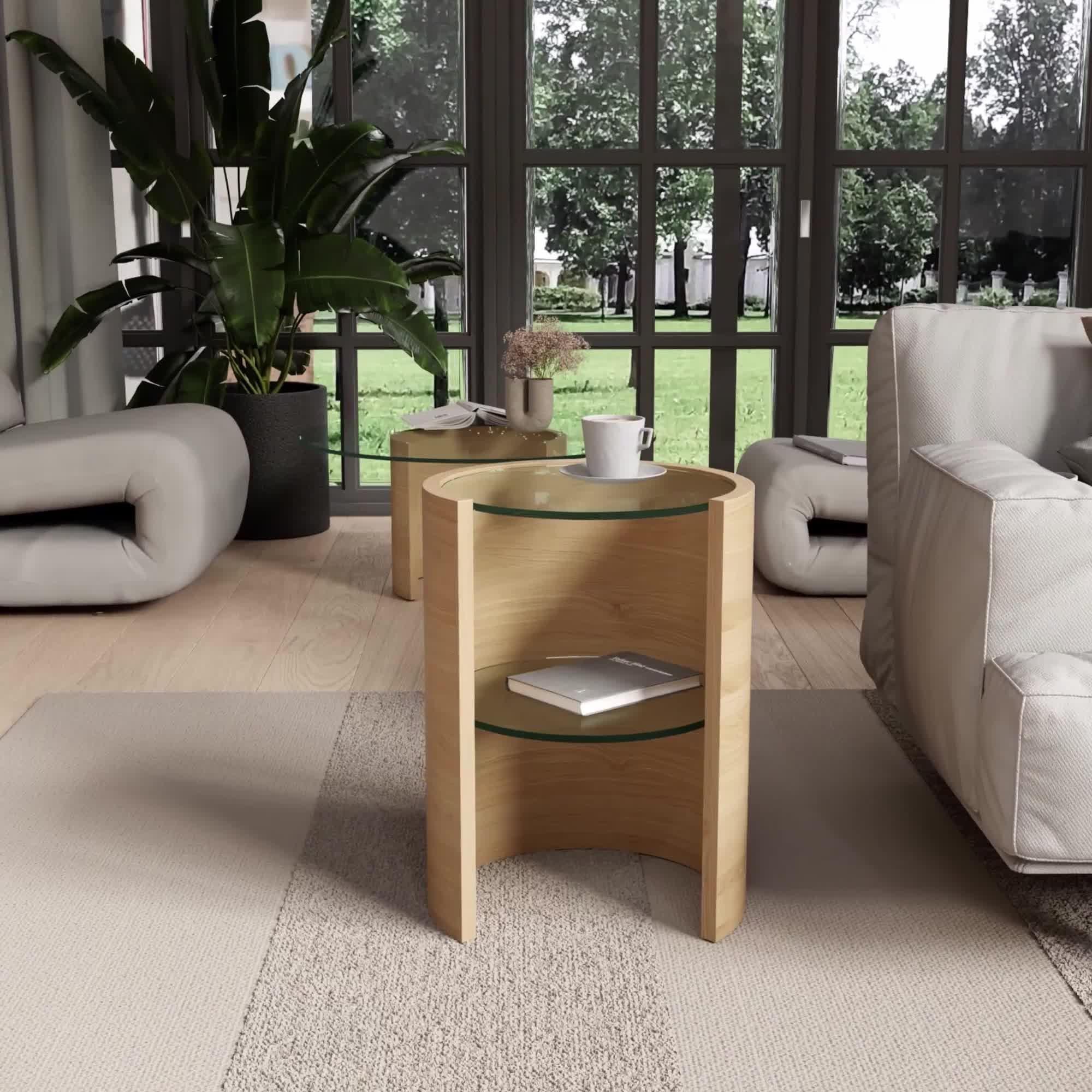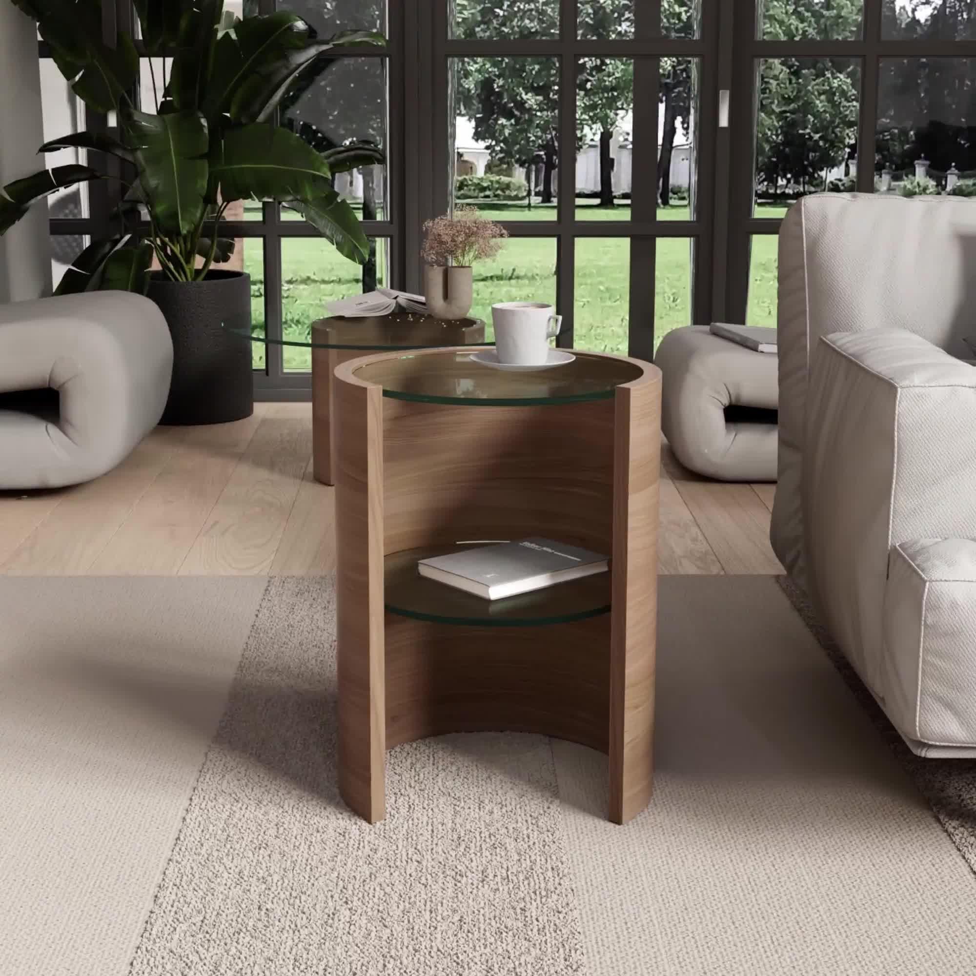 This uniquely formed lamp table, with a cylindrical wooden frame, is complemented by an inset glass top and shelf. Providing the space and durability to hold a bold lamp and your decorative accessories, this slender unit will add elegance to any room.