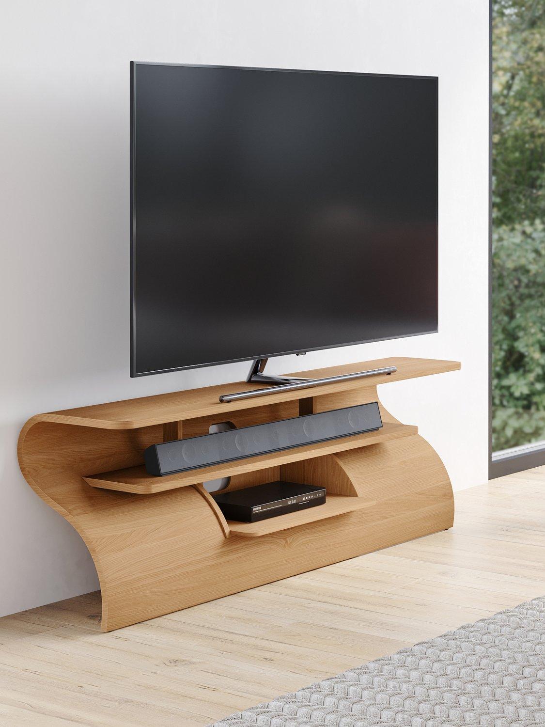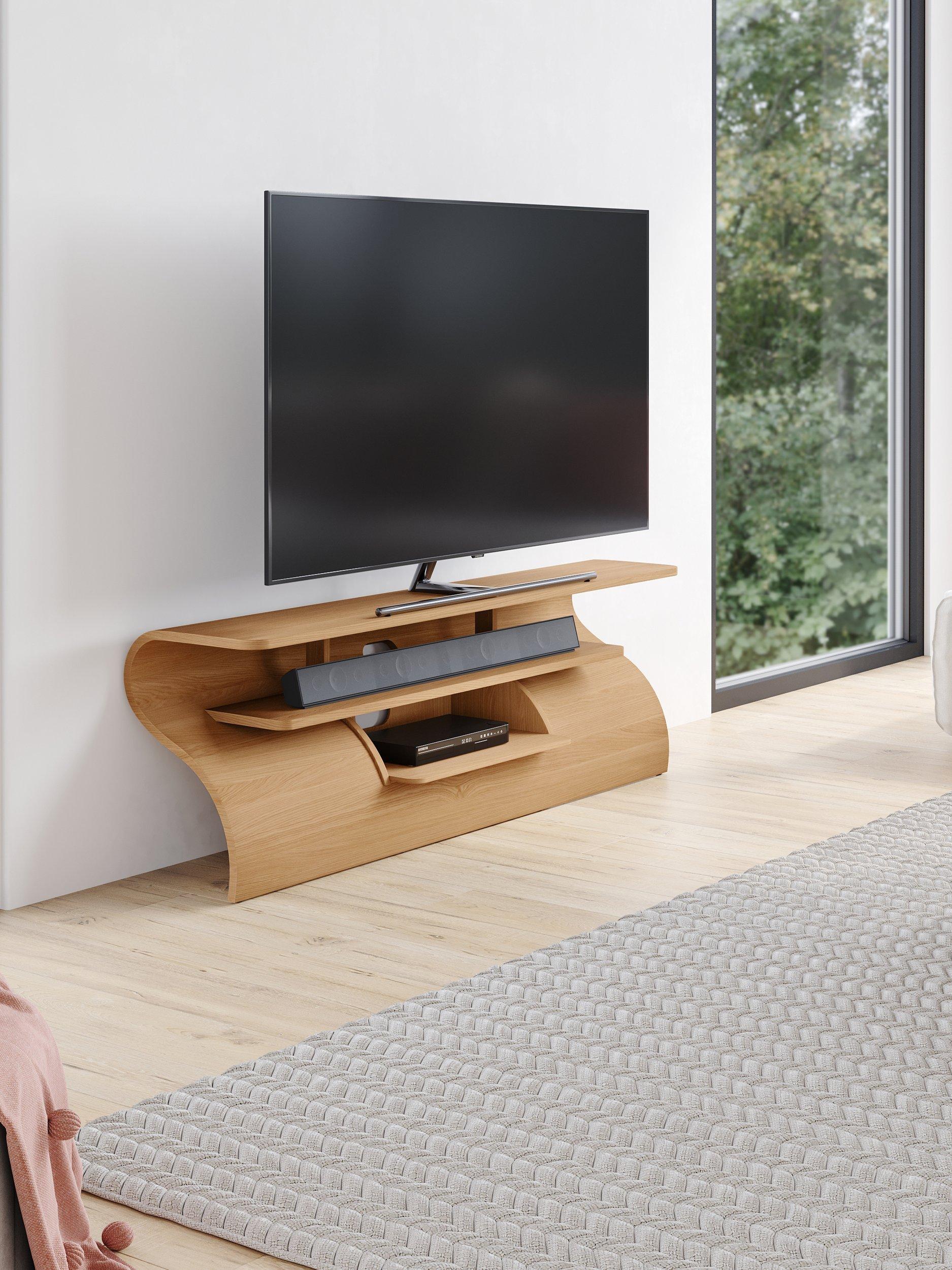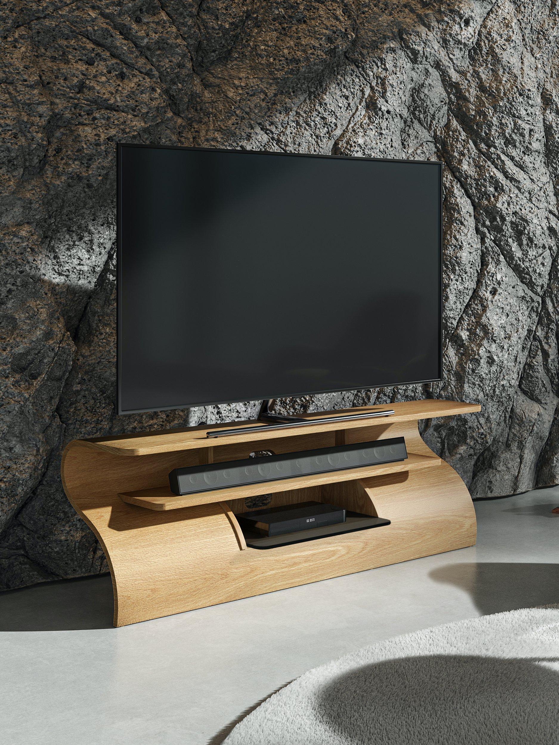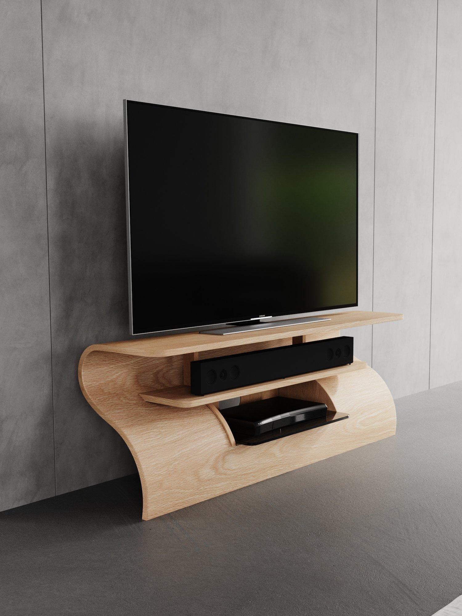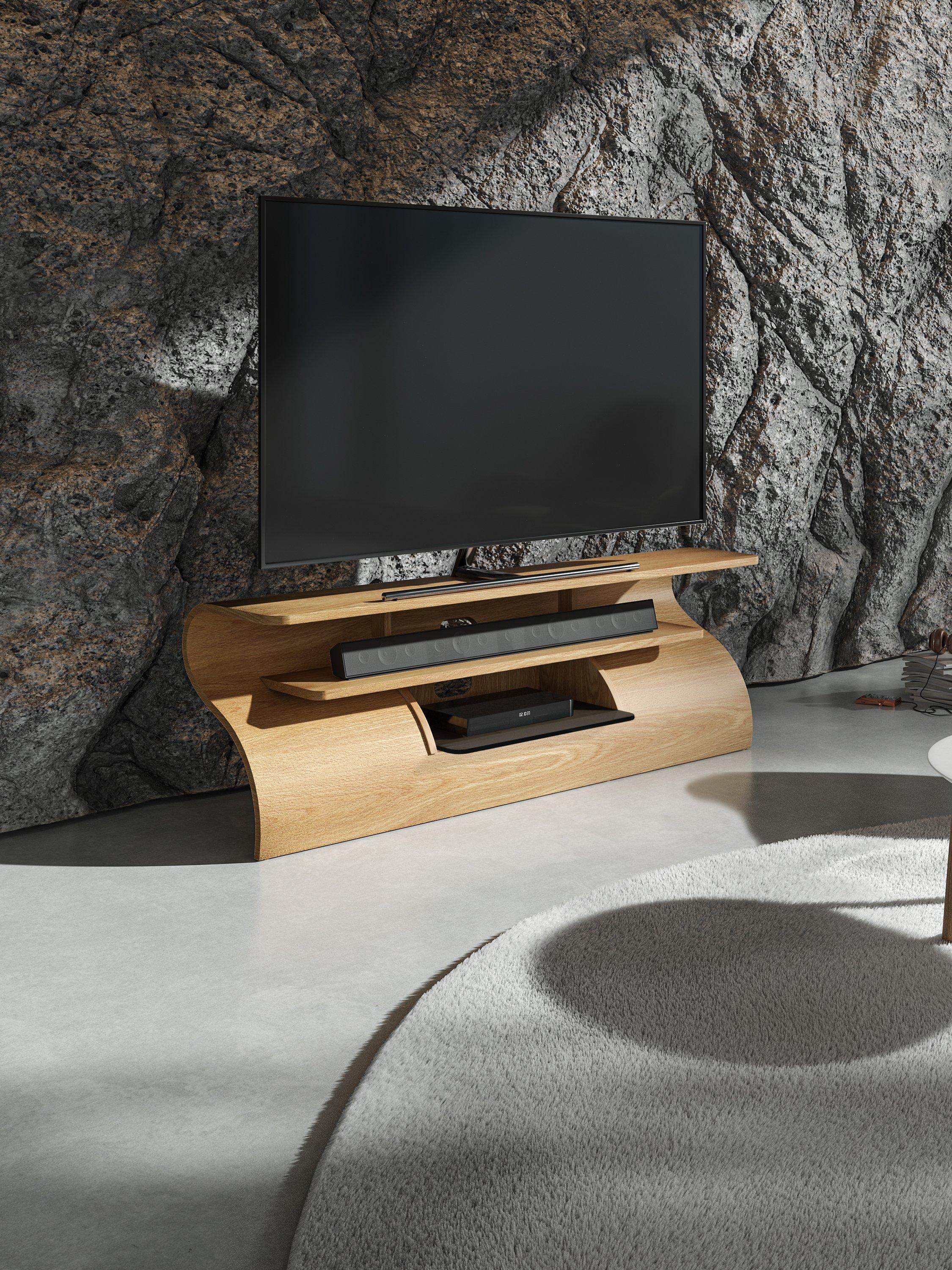 The Surge media unit, inspired by a cresting wave, offers a stunning, dynamic design. With a dedicated sound bar shelf and media box storage, this media unit's slender form is stabilised by hidden cable management. Adjustable feet ensure level placement on any floor, combining style with practicality.