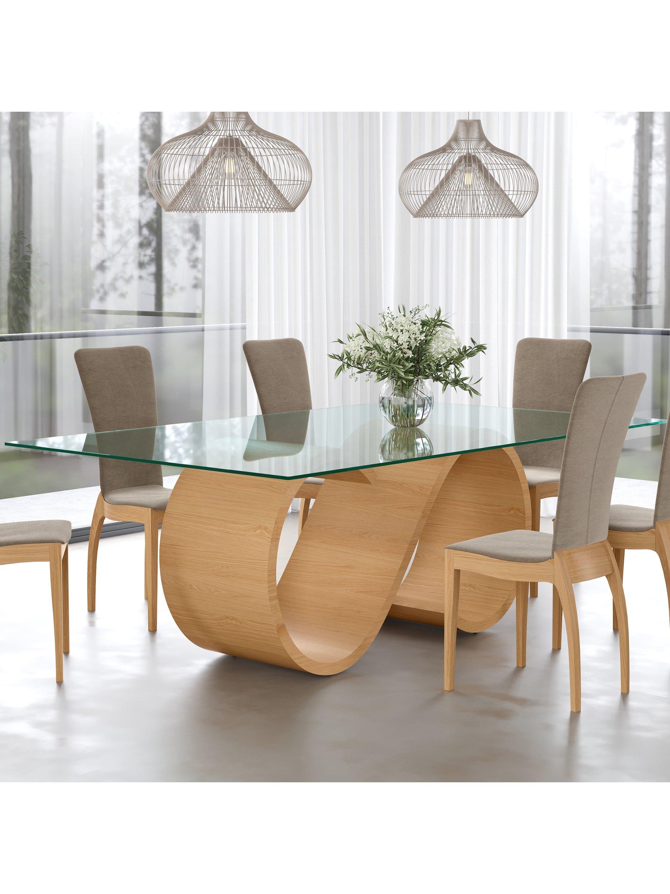 This aesthetically striking glass top table, with its rolling curves, shows off the natural beauty of the wood on this simple, uncluttered design.