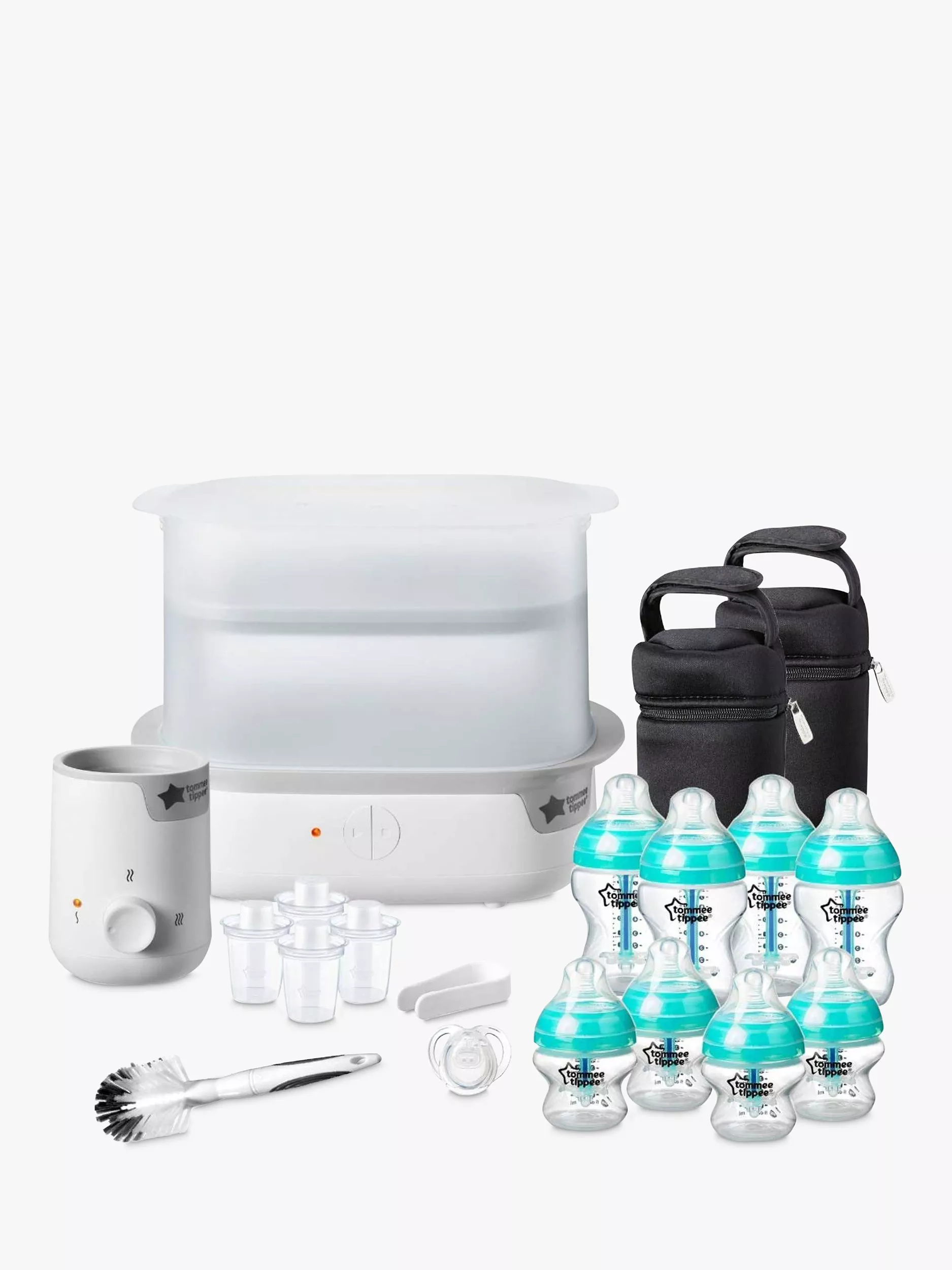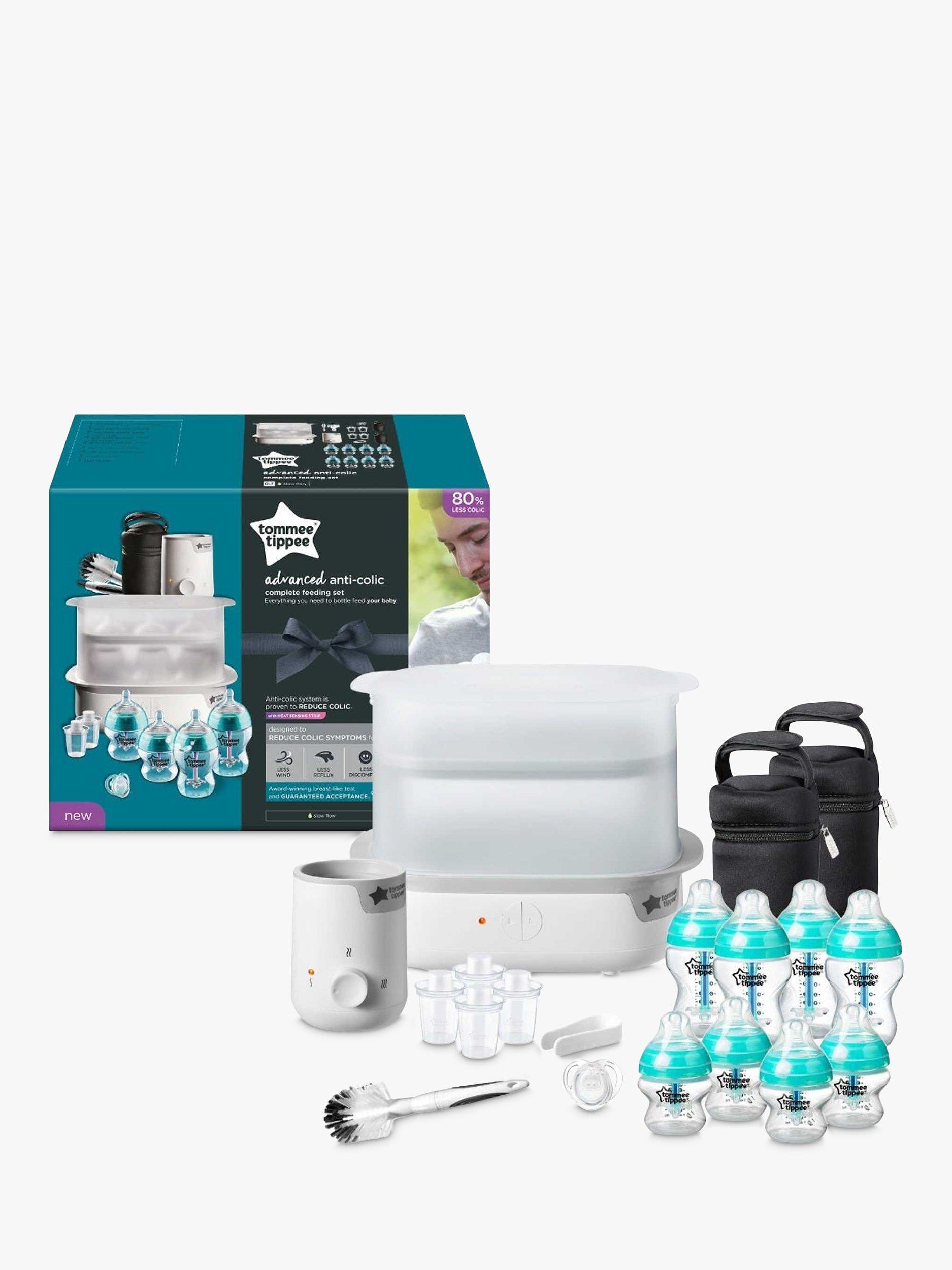 Tommee TippeeAdvanced Anti-Colic bottles are specially designed to prevent colic by reducing air bubbles in the milk, meaning they'll reduce colic symptoms such as wind, reflux and fussing by as much as 80%. The kit includes the Advanced SteamSteriliser which can sterilise up to 6 bottles in just 5 minutes, killing 99.9% of germs that may linger in bottles, teats, breast pumps and other baby feeding accessories.