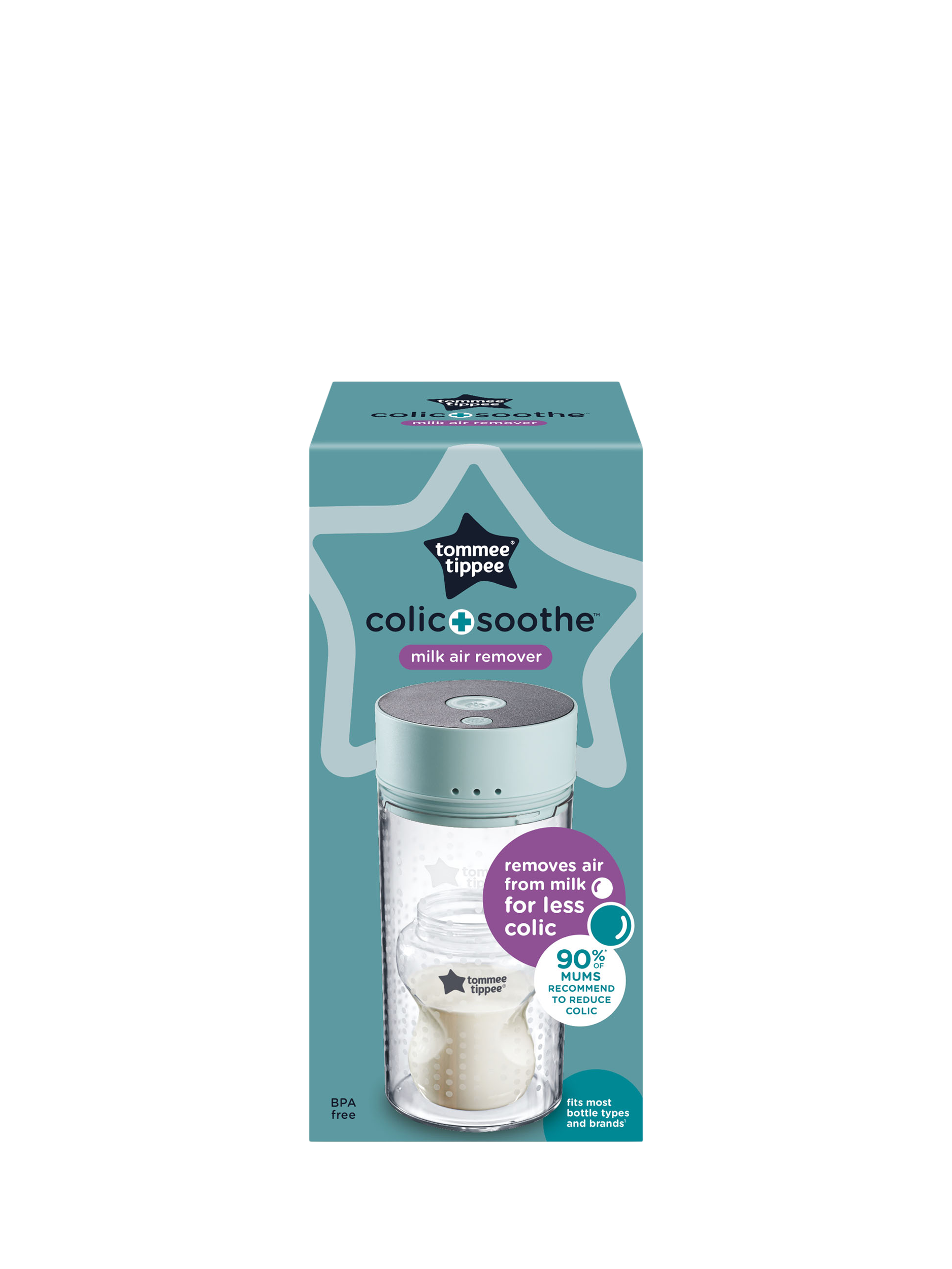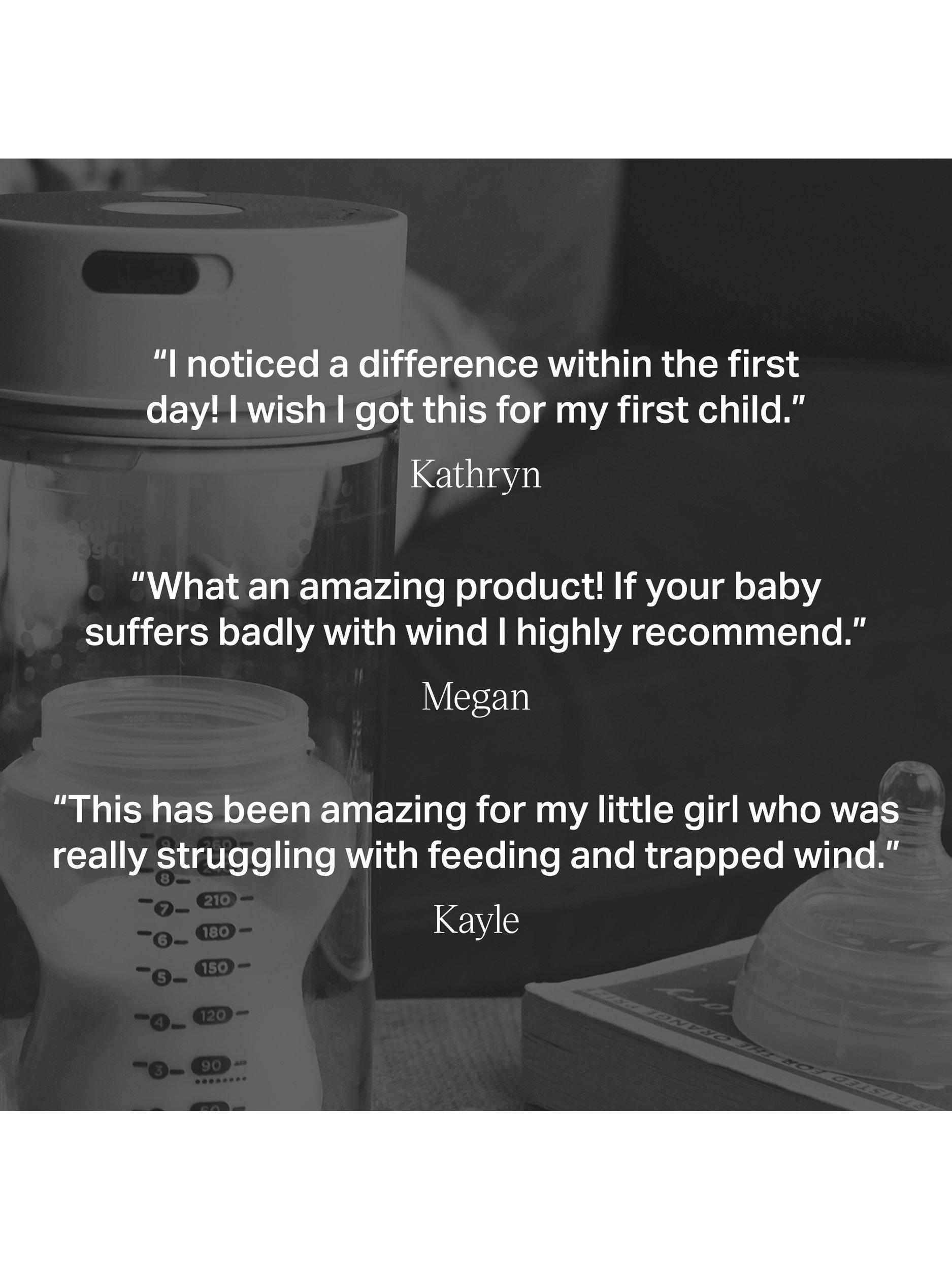 When prepping baby’s bottle to make up their feed, air bubbles can get into their milk. This air can lead to gas and bloating, which can cause colic. With one press, Colicsoothe vacuums the air out of your baby’s milk and away from their tummy, helping to ease the discomfort of gas, colic and reflux. 9/10 parents spoken to said Colicsoothe helped their babies to feel better*.