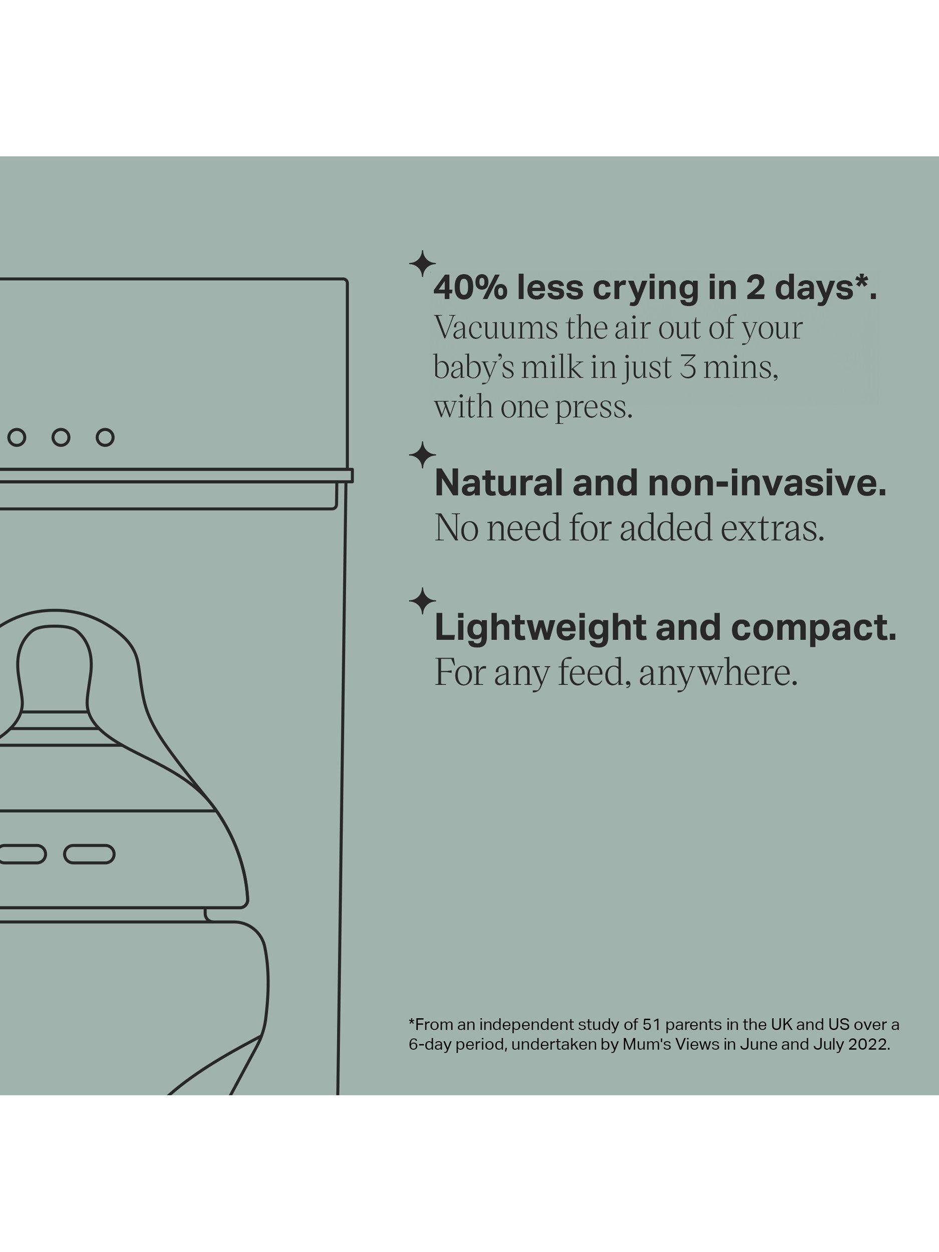 Colicsoothe is a completely natural, non-invasive way to soothe the discomfort of colic, with no need for drops or anything extra. In fact, 7/10 parents said it reduced the symptoms of colic more than other anti-colic solutions*. Simple to use, the Colicsoothe vacuum chamber is compatible with most bottle types and brands, so you can keep on using the bottle your baby’s used to. Because every parent’s every day is different, the Colicsoothe vacuum pump is lightweight, compact and USB rechargeable, so you can use it for every feed, wherever you are.