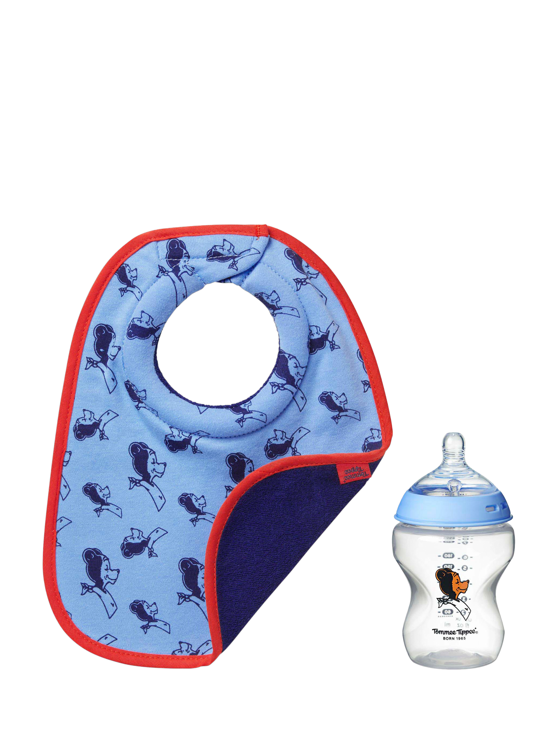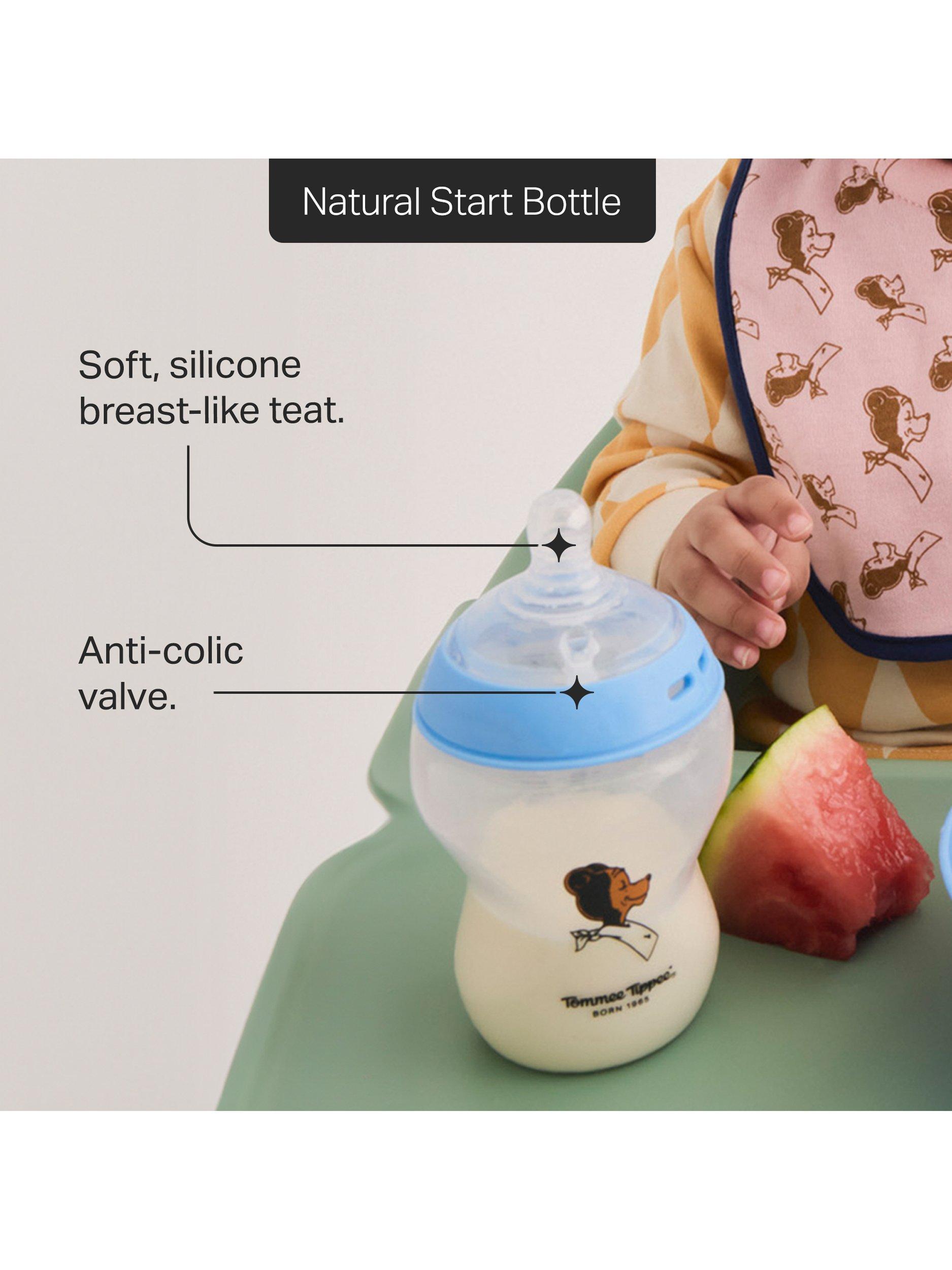 The Natural Start bottle has a soft, silicone teat that flexes and stretches like a breast to make switching from breast to bottle and back easy. Plus the anti-colic valve keeps gas away from baby’s tummy. No need to cry over split milk, it's 100% leakproof (even when upside-down), sterilises in the microwave in just 3 minutes and is BPA-free. Like the bib it features Tommee Tippee's original, reimagined logo.