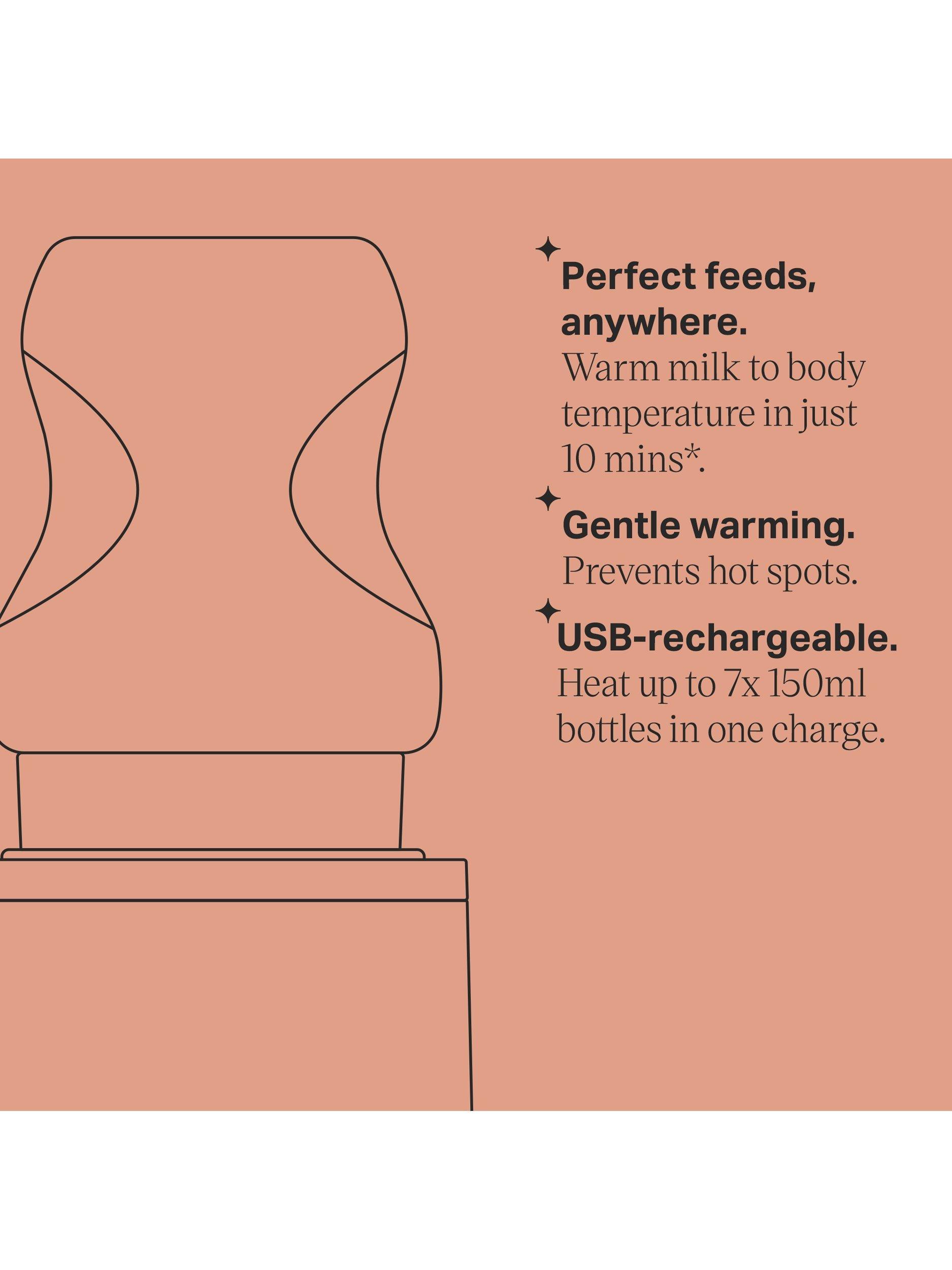Perfect for on-the-go feeding, the lightweight and compact unit fits neatly in your handbag or changing bag. It’s powered by a USB-rechargeable base unit that can warm up to seven 150ml or four 260ml bottles from a single charge*.