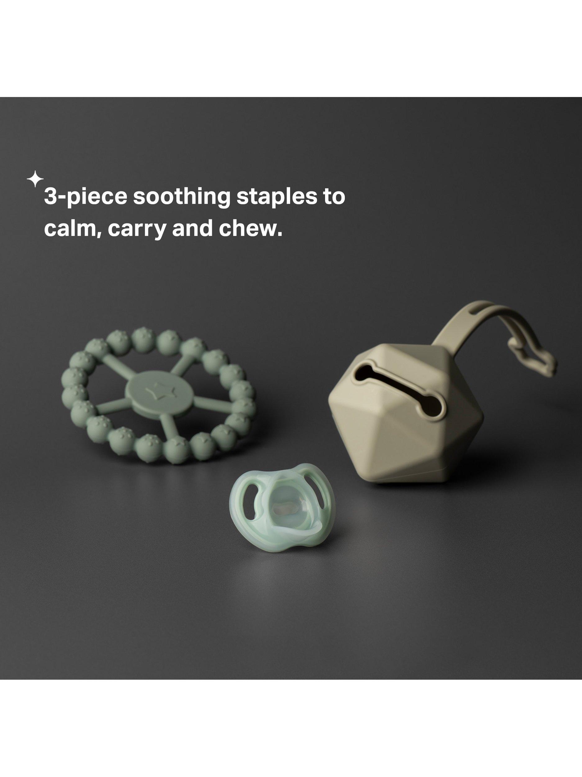 Three 3 stylish soothing staples to calm, carry and chew: This original Ultra-light soother, matching soother carry case, and teething ring makes a perfect gift for a new parent (and their baby).