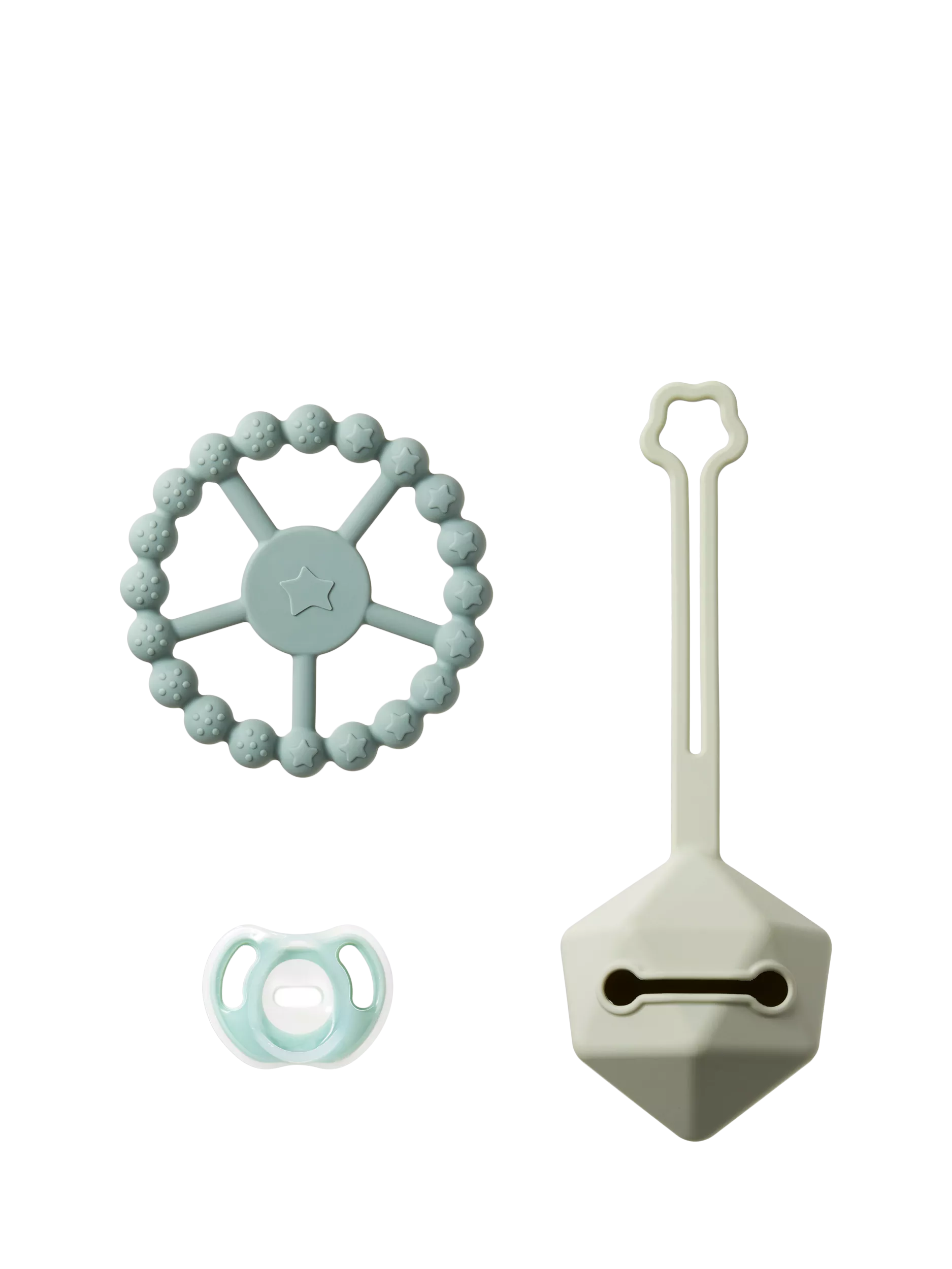 Three 3 stylish soothing staples to calm, carry and chew: This original Ultra-light soother, matching soother carry case, and teething ring makes a perfect gift for a new parent (and their baby).