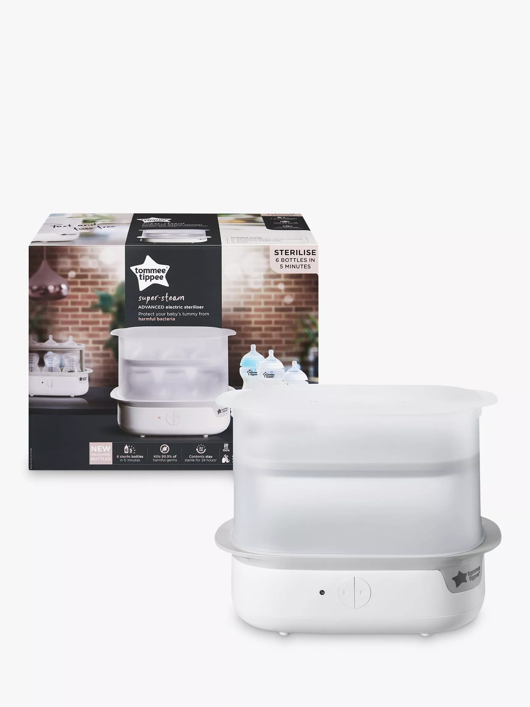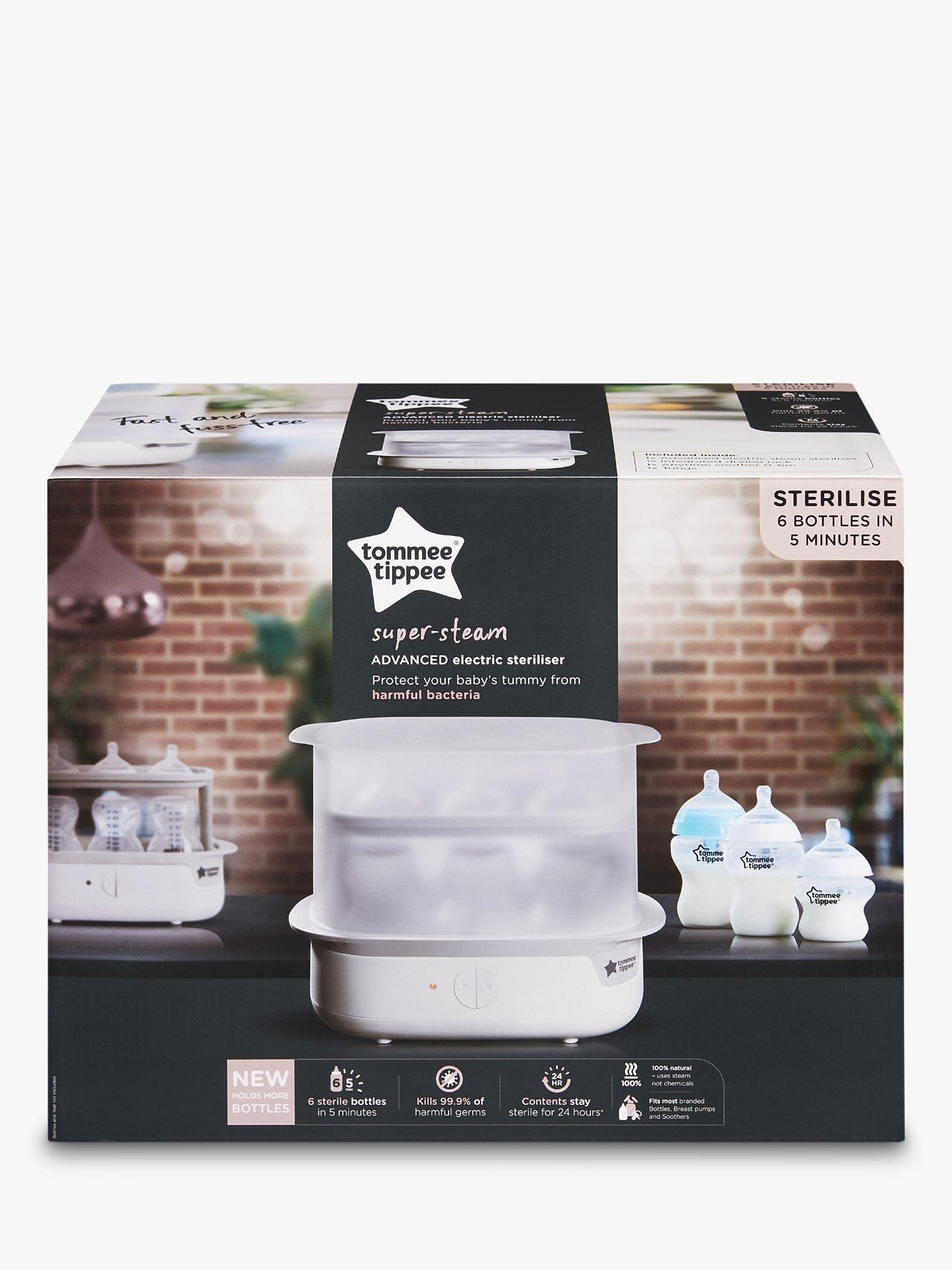 Having clean, sterilised bottles ready for every feed is an essential part of caring for your baby. With the Tommee Tippee Advanced Steam Steriliser, you can sterilise up to 6 bottles in just 5 minutes, and the new design means it holds more bottles at a time, too.
