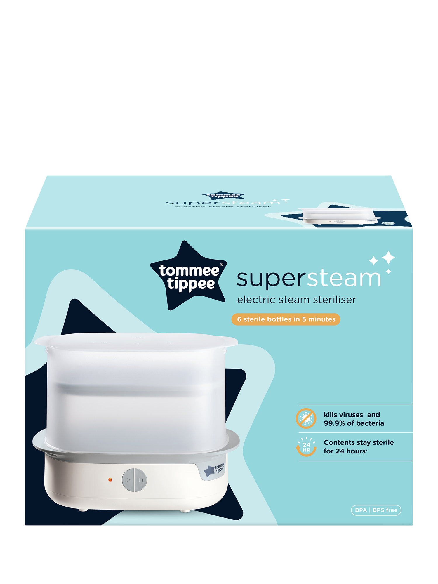 Having clean, sterilised bottles ready for every feed is an essential part of caring for your baby. With enough space to fit a wide range of baby bottles, soothers, breast pumps, teethers, and other baby accessories, it’s the quick and easy way to protect your baby's tiny tummy from harmful bacteria. The Tommee Tippee Super-Steam Advanced Electric Steriliser is fast and fuss-free, meaning you can sterilise up to 6 bottles in just 5 minutes. Chemical-free, using only natural steam to envelop every surface, this electric steam steriliser kills 99.9% of harmful germs that may linger in bottles after washing.