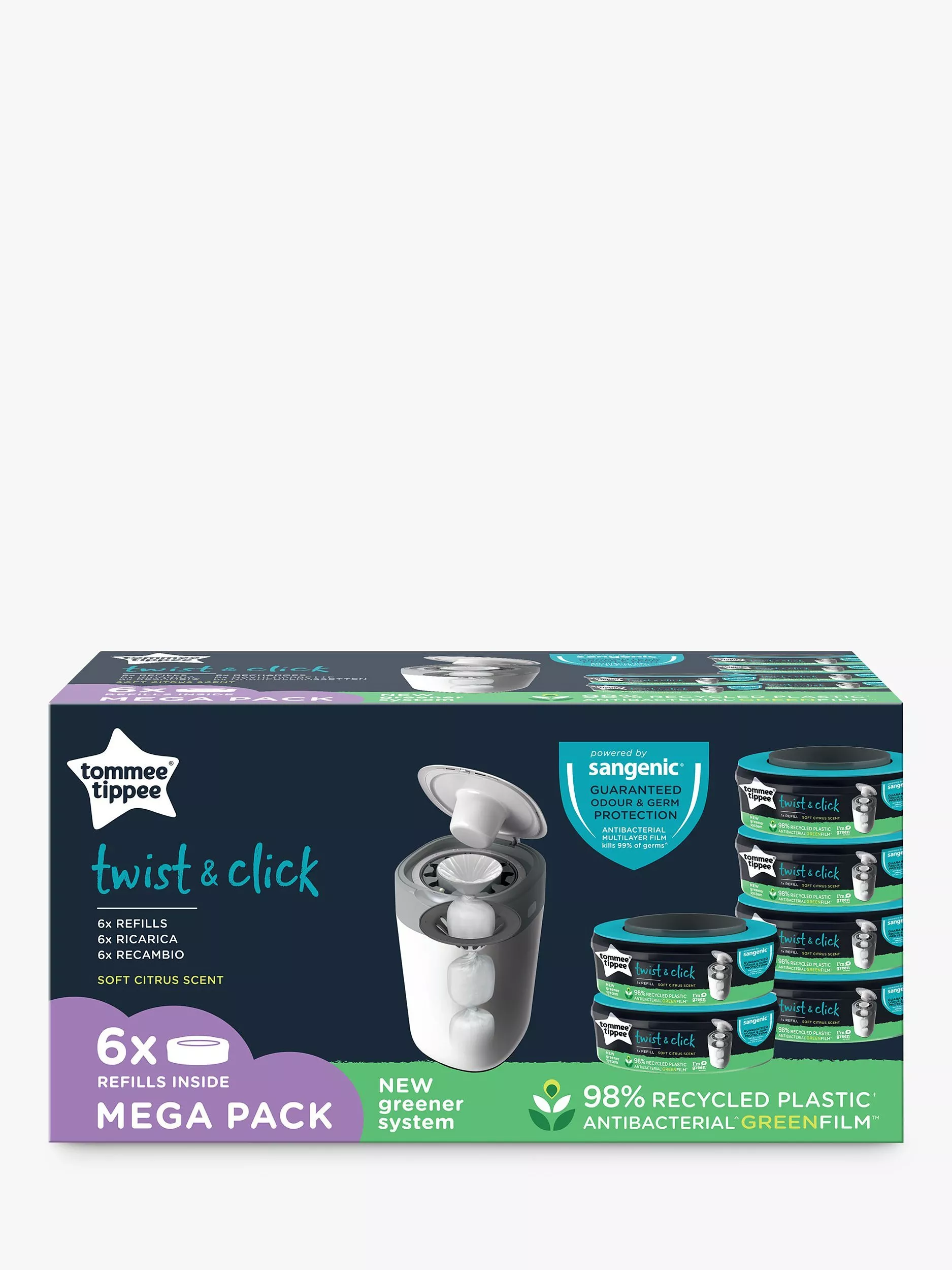 The Tommee Tippee Twist & Click nappy bin refills are compatible with all Tommee Tippee nappy disposal systems which twist – Twist & Click and Sangenic TEC. Each refill provides enough anti-bacterial film to wrap up to 1 month’s worth* of nappies depending on the size and number you use.