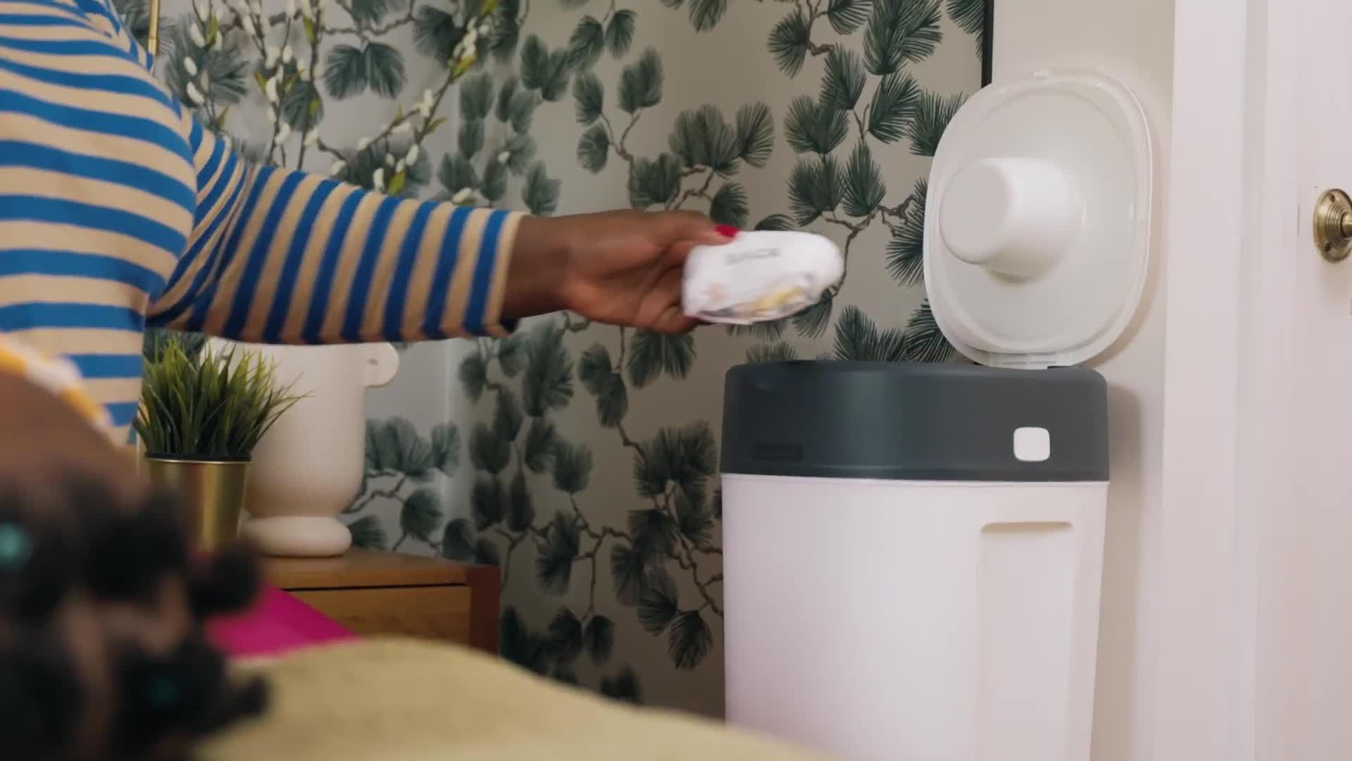 - Inbuilt plunger pushes nappies deep into the bin, keeping your hands clean.