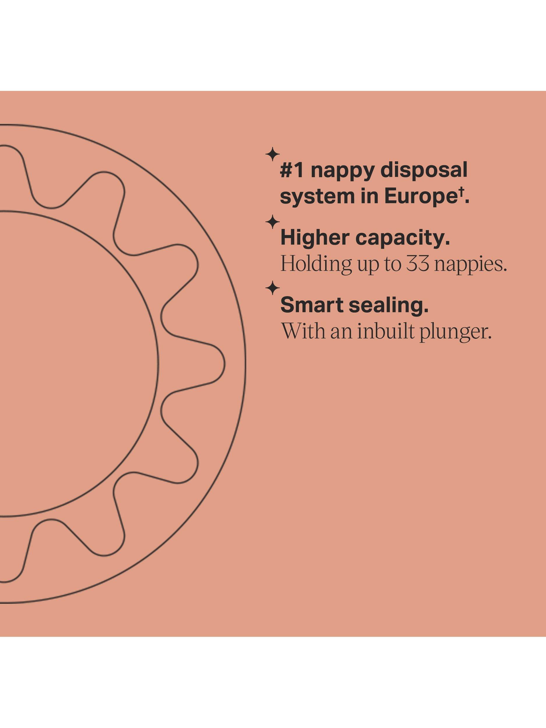 - Inbuilt plunger pushes nappies deep into the bin, keeping your hands clean