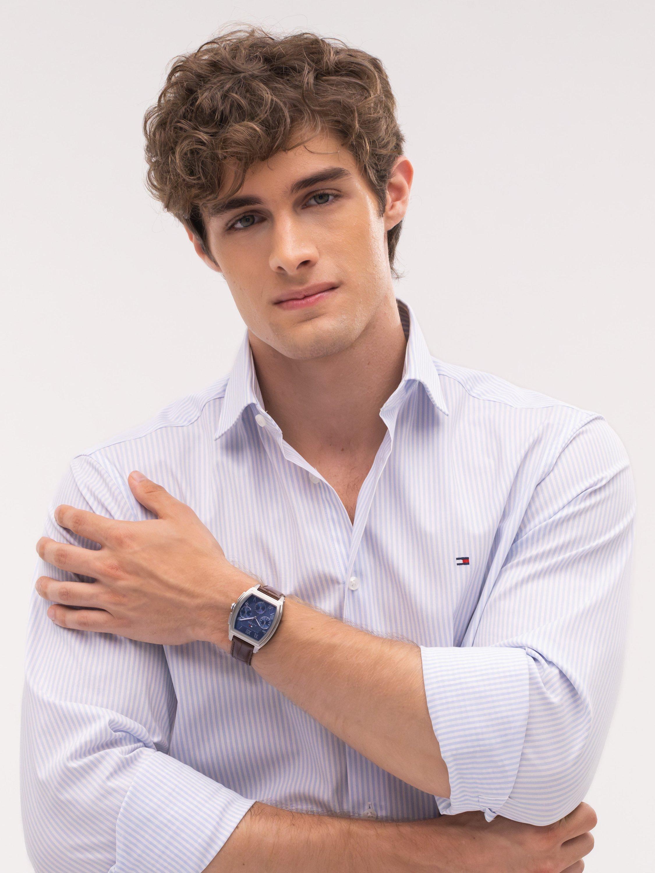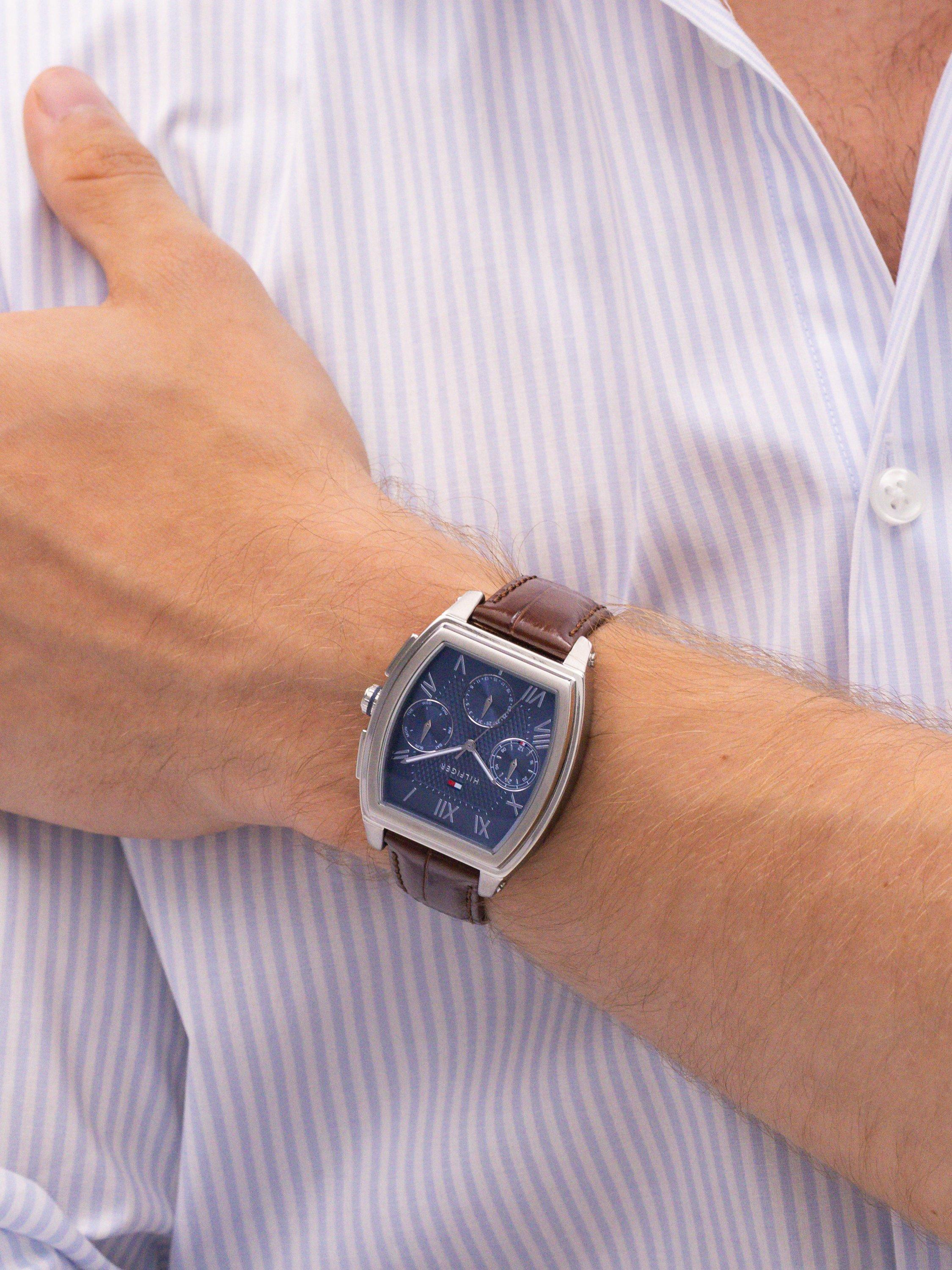 Offering unparalleled precision, this watch from Tommy Hilfiger is set within a 36mm rectangular stainless steel case with a navy blue textured sunray dial and a day and date window for functionality. Complete with a pure leather strap.
