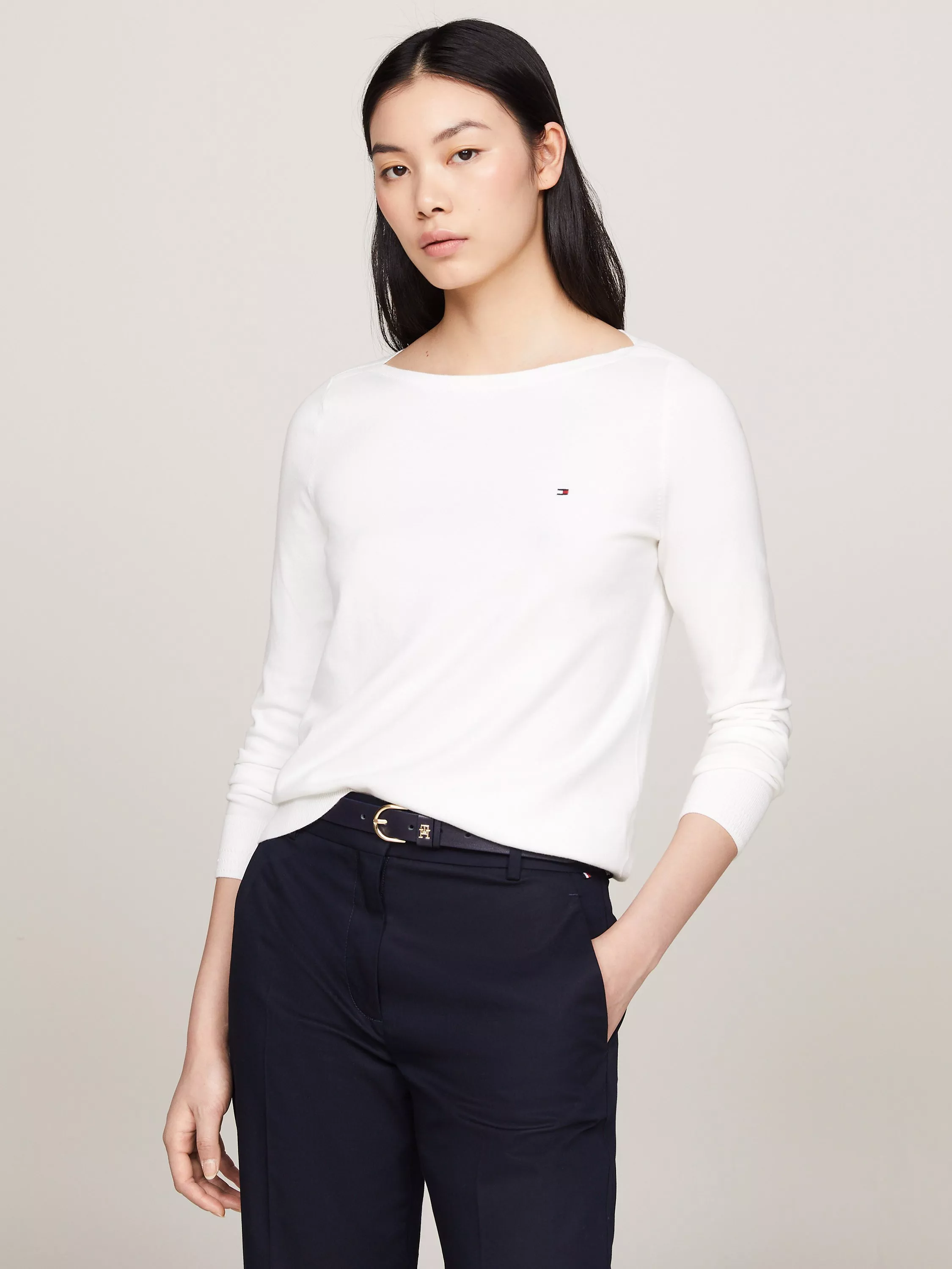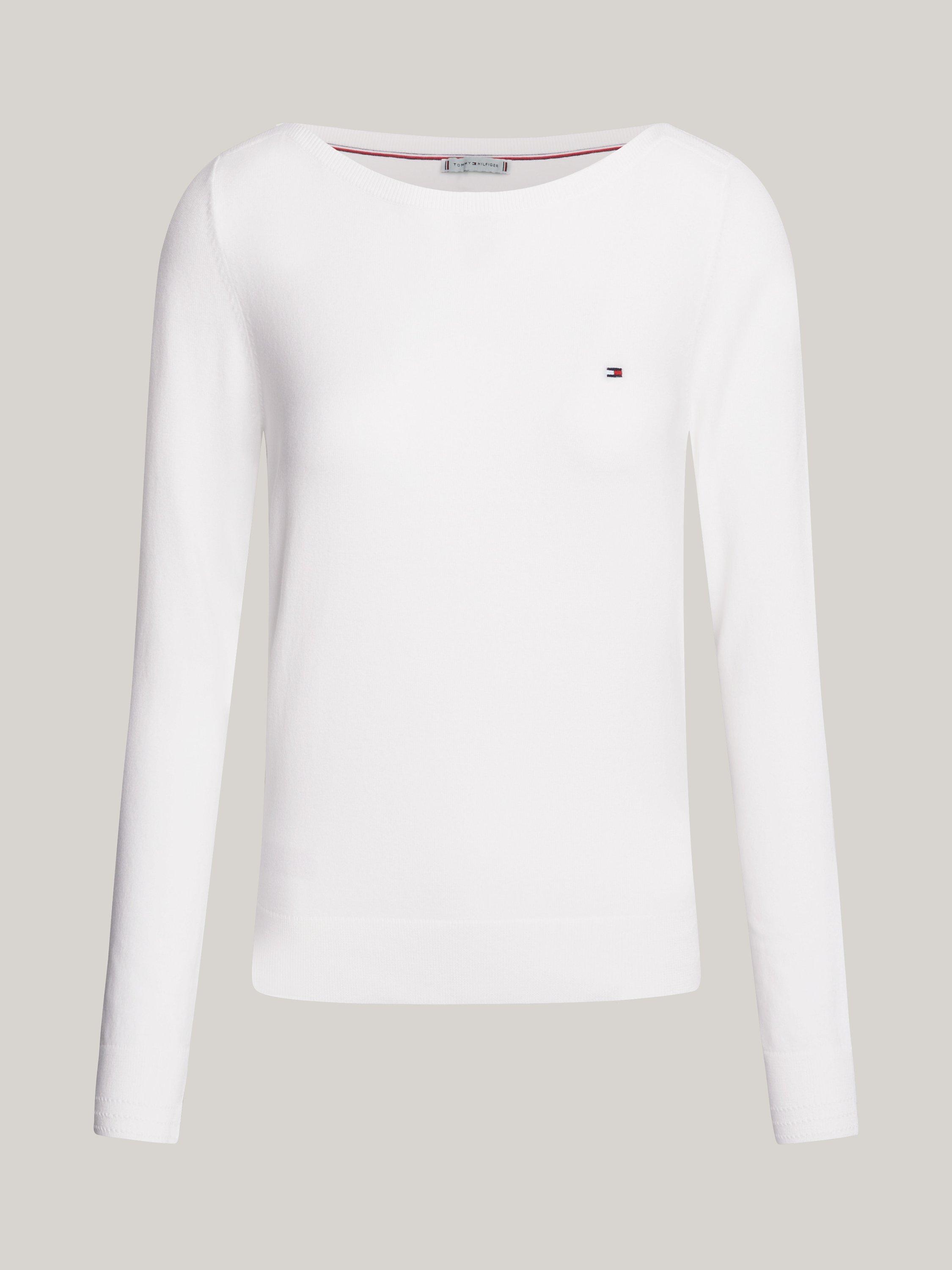 Simple and stylish with a boat neckline, this lightweight jumper by Tommy Hilfiger is blended with cotton to enhance breathability.