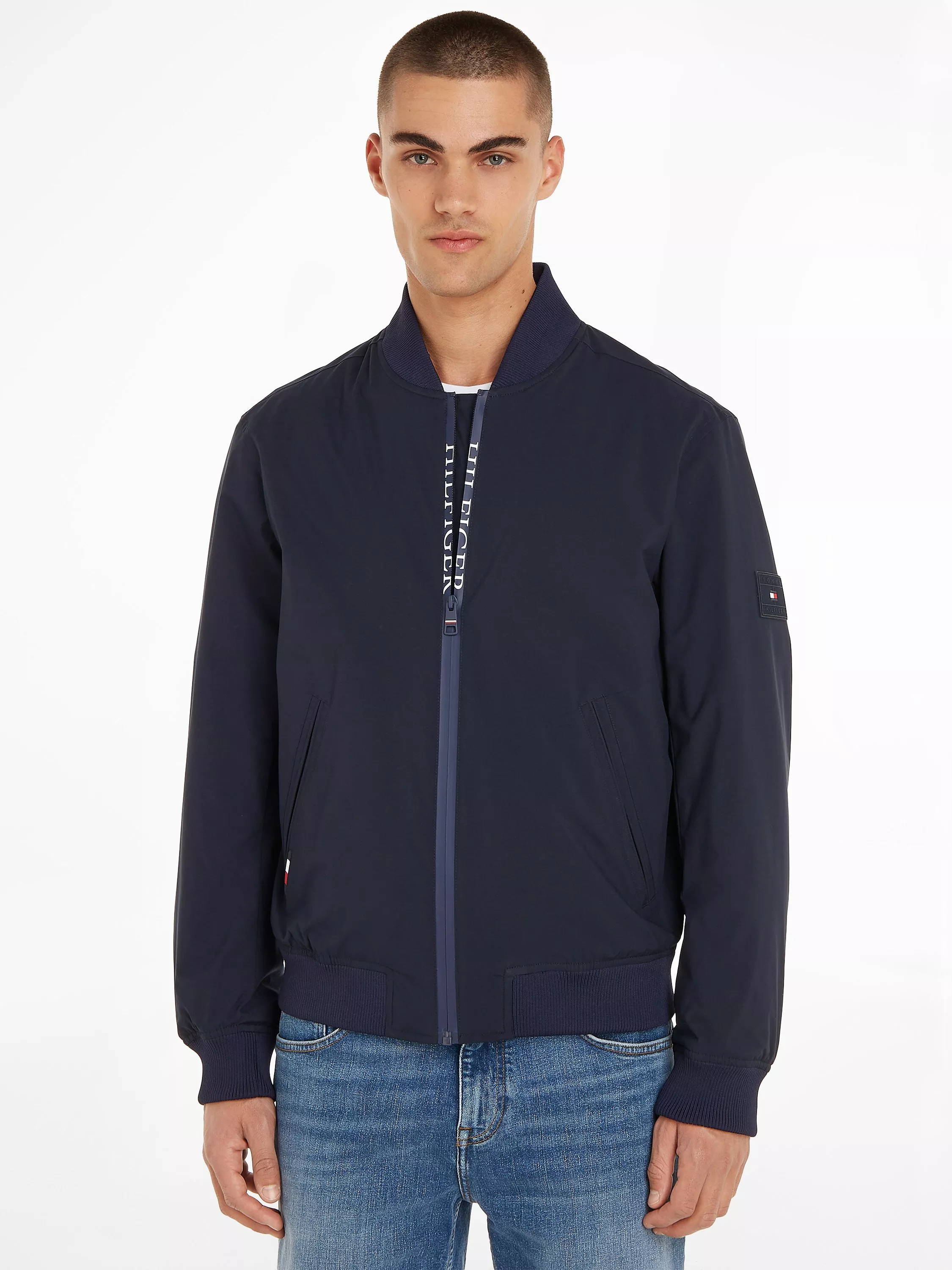 With a finessed athleisure aesthetic that will never go out of style, this bomber jacket from Tommy Hilfiger's TH Protect range is made from recycled materials and features a high neck with global stripe detailing.