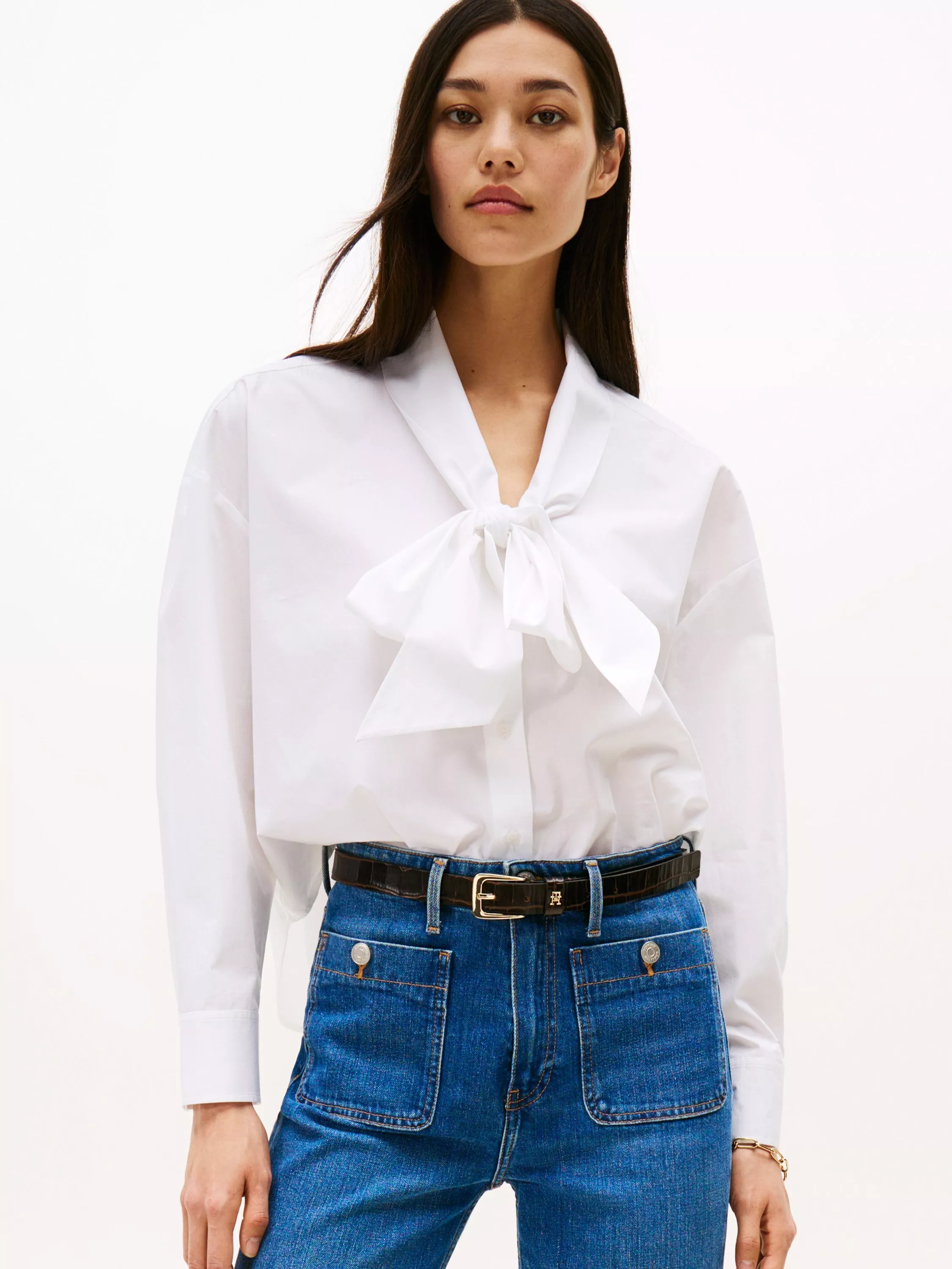 A fresh, feminine take on a classic style, this pure cotton poplin shirt features an oversized fit and a playful bow-tie collar.