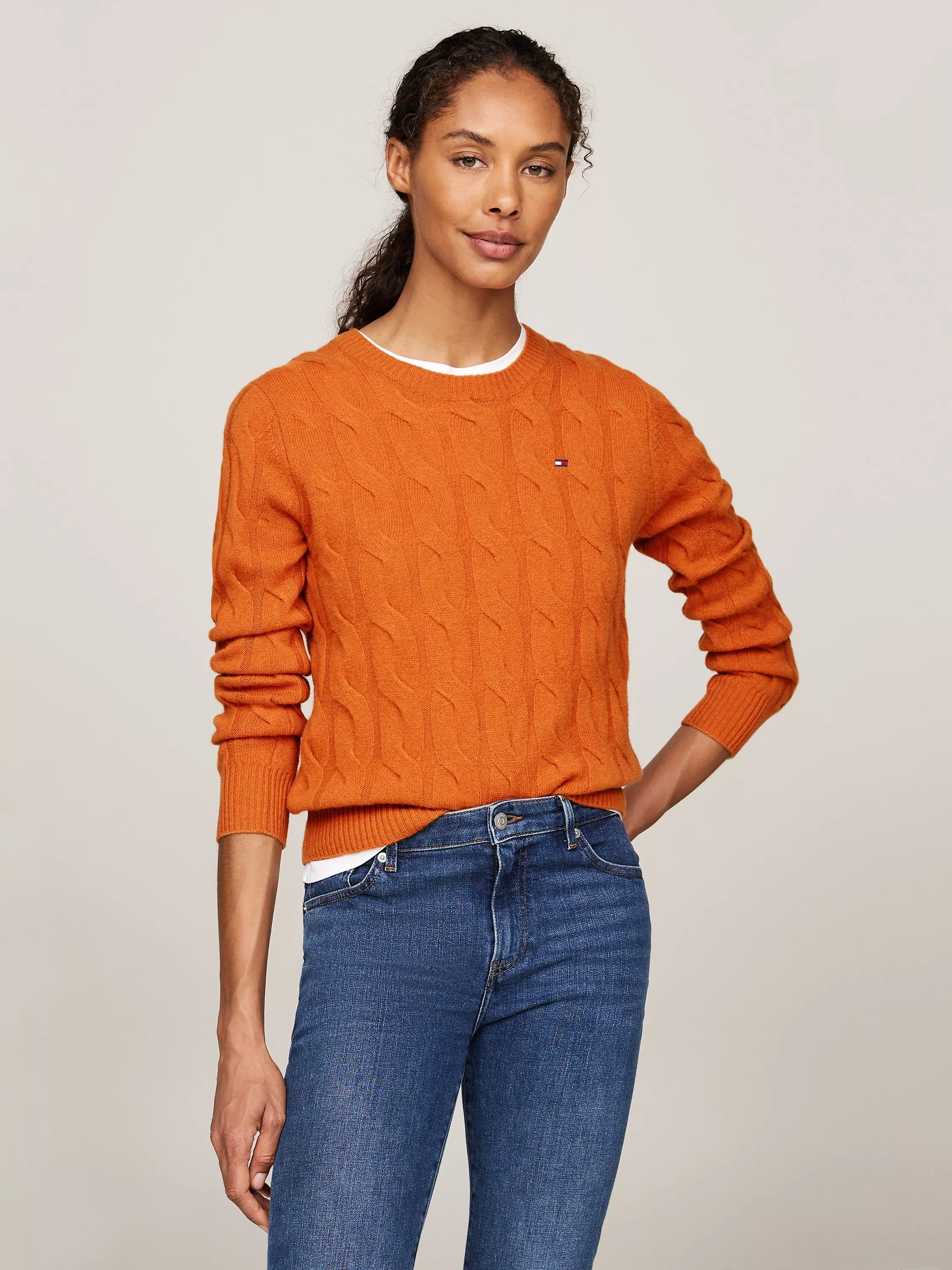 Simple yet sleek with a crew neckline, this lightweight cable knit jumper from Tommy Hilfiger is warm and cosy in pure wool.