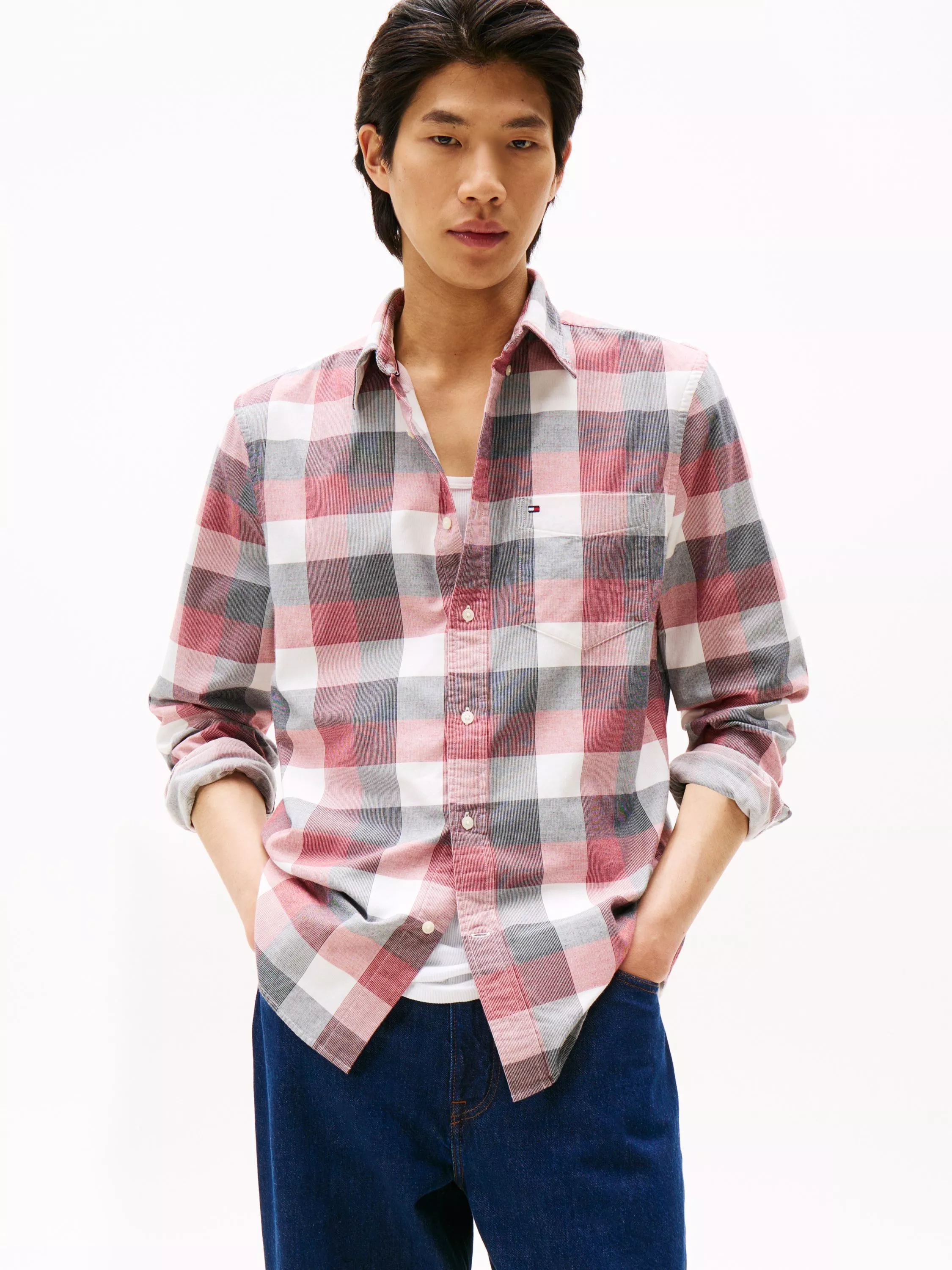 A tonal check design and soft corduroy texture give this button-down collar shirt an eye-catching and tactile finish.