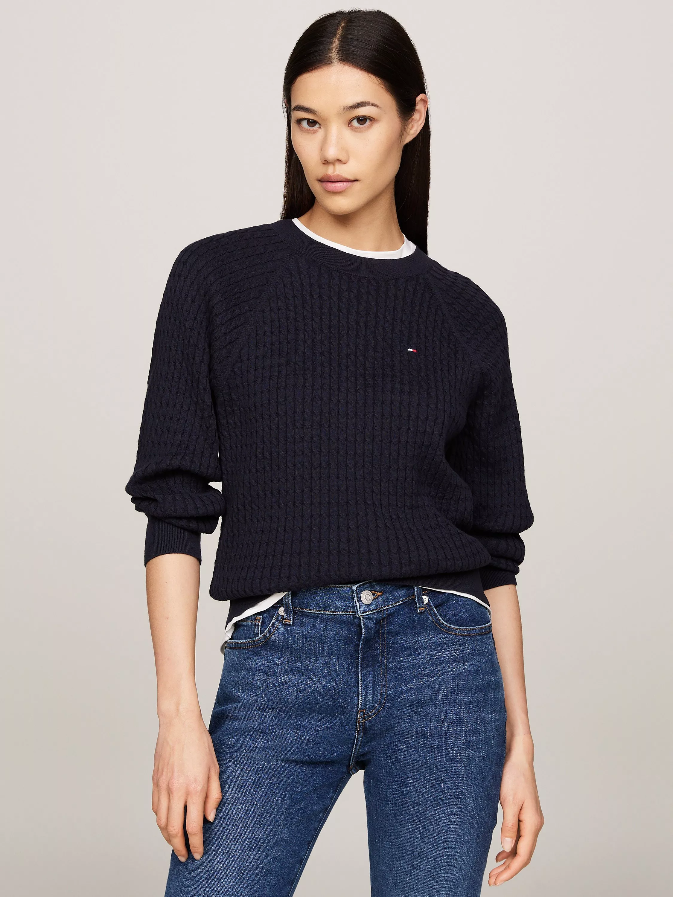 Framed with a sleek crew neck, this jumper by Tommy Hilfiger is stitched together from organic cotton for comfortable wear.
