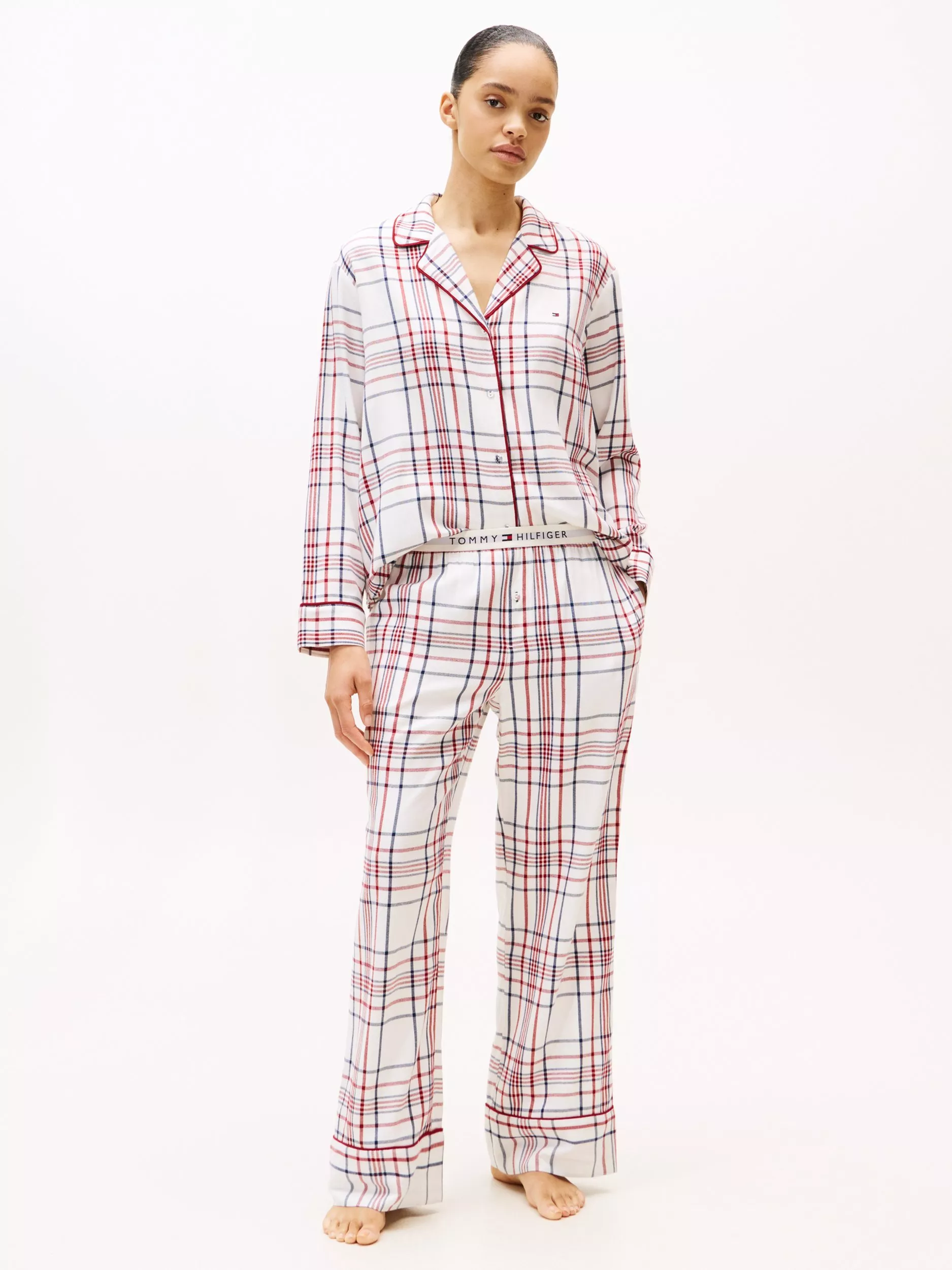 A three-piece pyjama set, crafted from flannel for a cosy feel and presented in a branded gift box. The shirt features notched lapels, cuffed sleeves and a rounded hem. The bottoms have a faux button fly, and the slippers are fleece-lined. Tommy Hilfiger branding features on all pieces.