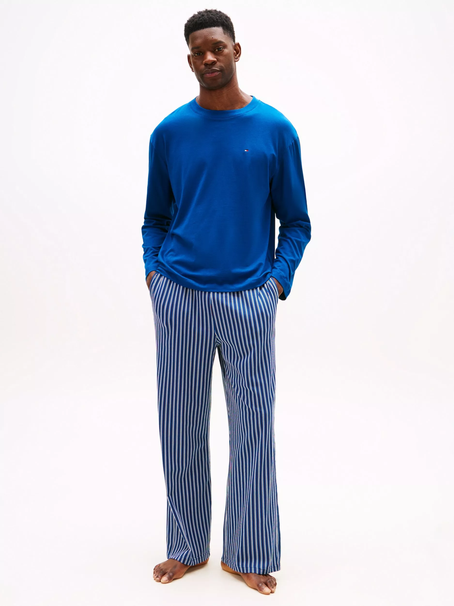 Crafted from a comfortable stretch cotton jersey, this pyjama set is an ideal choice for bedtime. It includes a long-sleeved crew-neck top, subtly branded with an embroidered logo, and a pair of bottoms with a bold all-over stripe and an elasticated waistband featuring Tommy Hilfiger's logo.