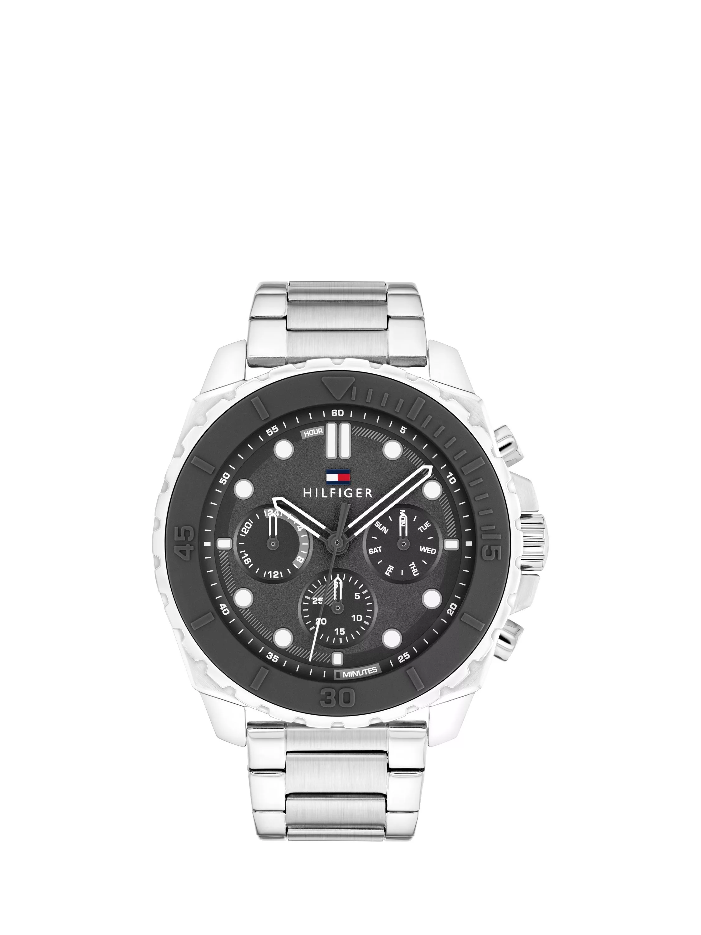 Gift-boxed Tommy Hilfiger multi-function men's watch. Features a stainless steel case and bracelet strap with a sporty dark grey dial.