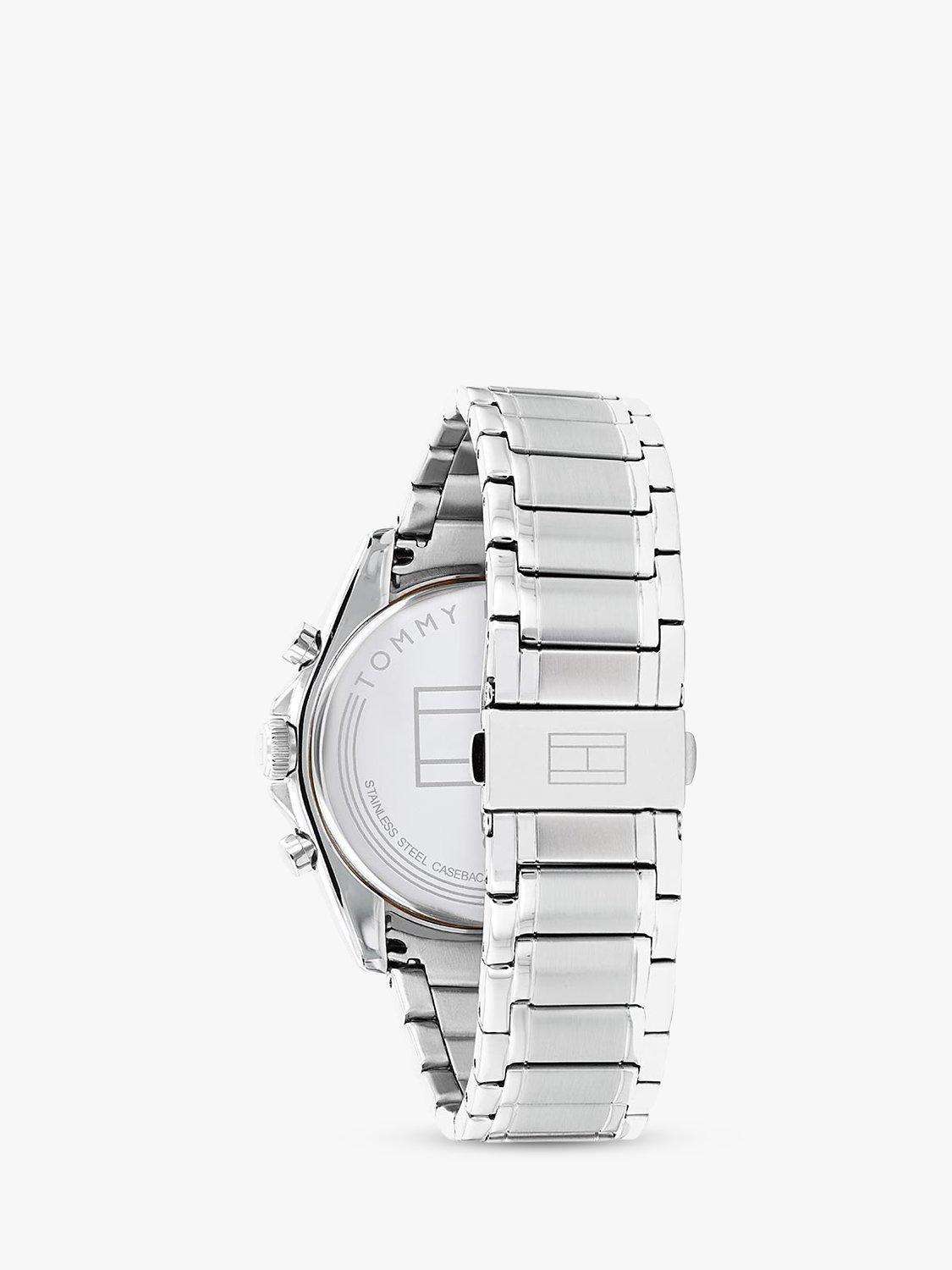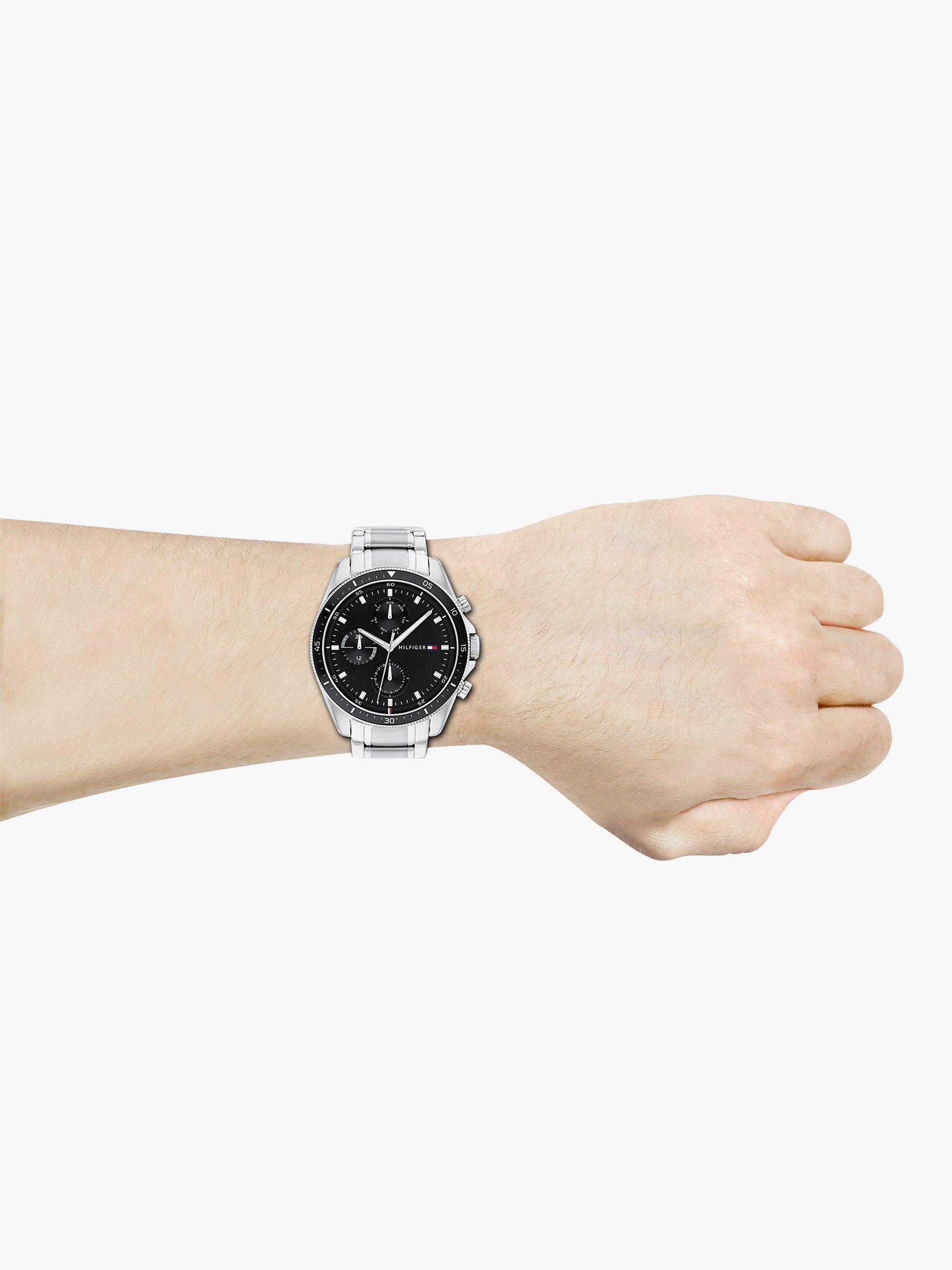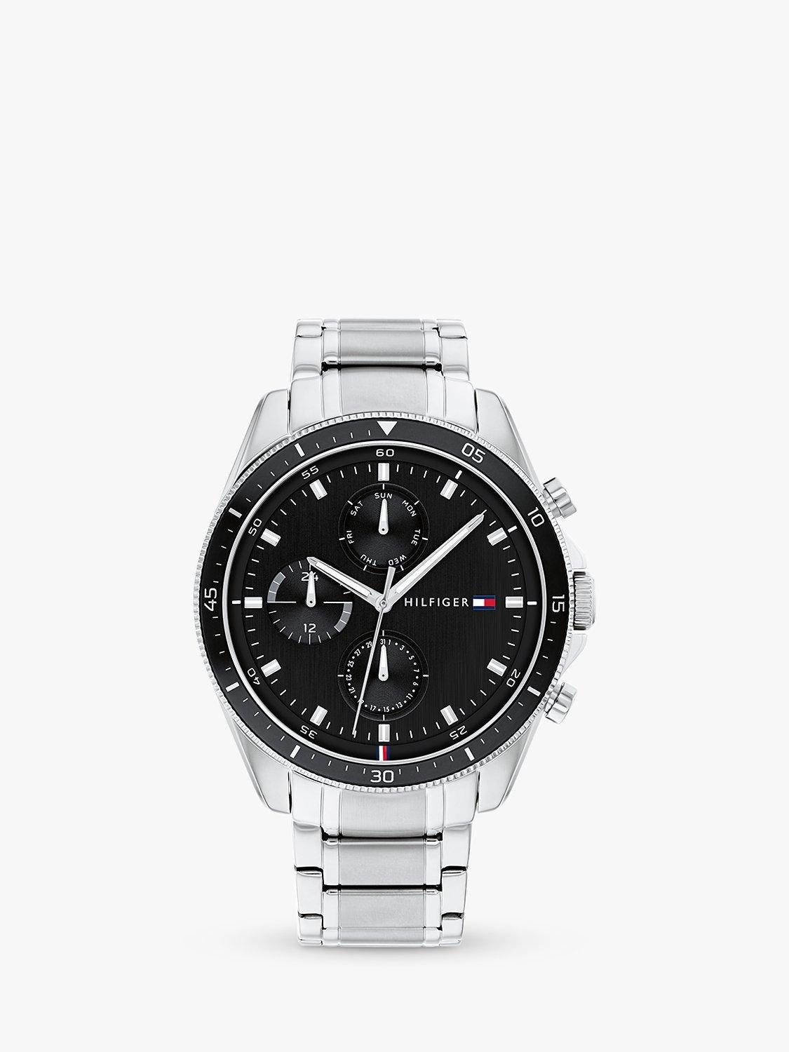 This statement watch from Tommy Hilfiger carries the brand's distinctive branding in a 44mm wide stainless steel case. The piece offers a three sub-dial chronograph function with day and date readings. The slightly chunky index hour markers and hands ensure legibility in not-so-bright conditions. The time instrument fastens with a folding clasp.