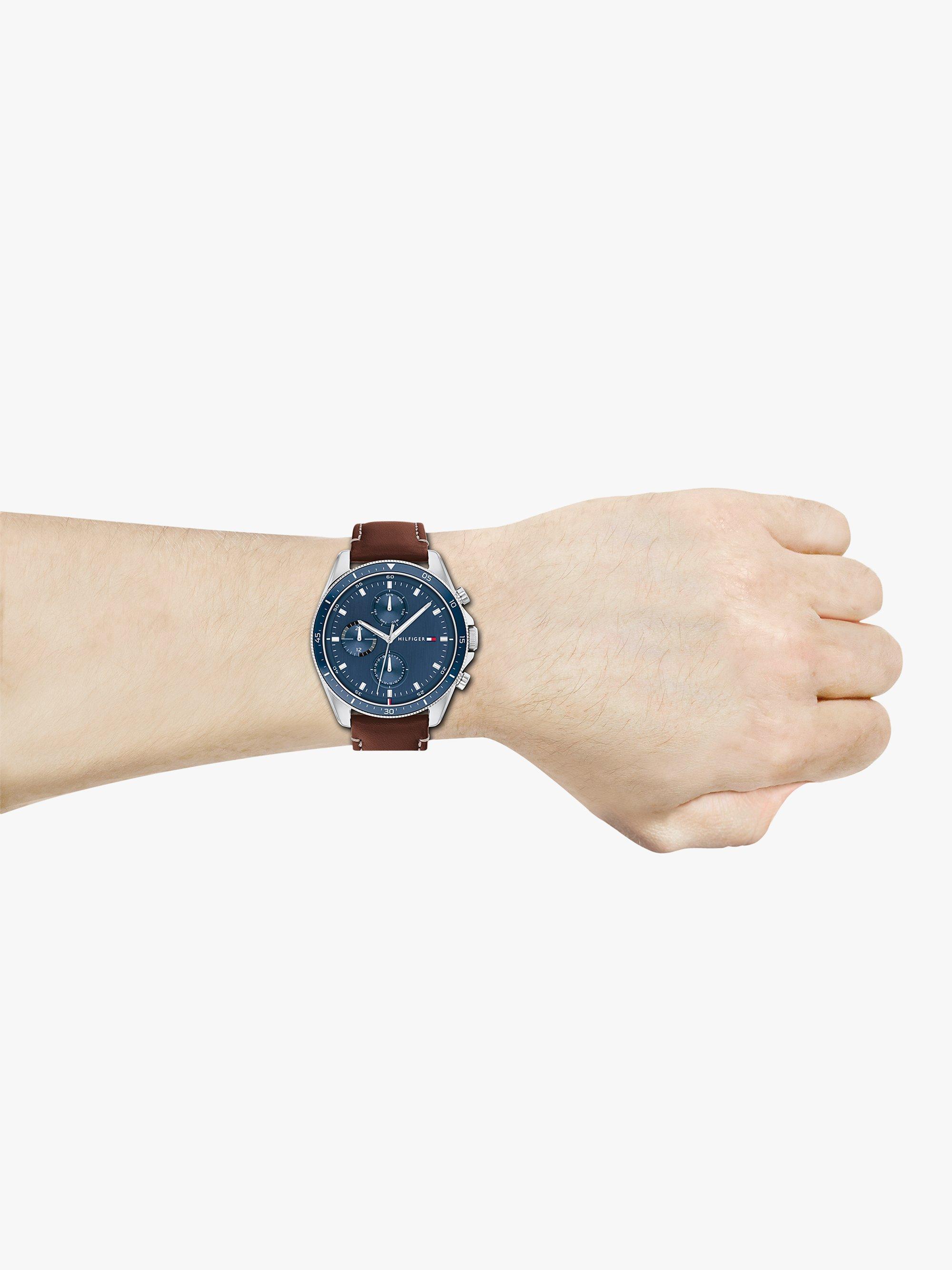 This statement watch from Tommy Hilfiger carries the brand's distinctive branding in a 44mm wide stainless steel case. The piece offers a three sub-dial chronograph function with day and date readings. The slightly chunky index hour markers and hands ensure legibility in not-so-bright conditions. The time instrument fastens with a pin and buckle clasp.