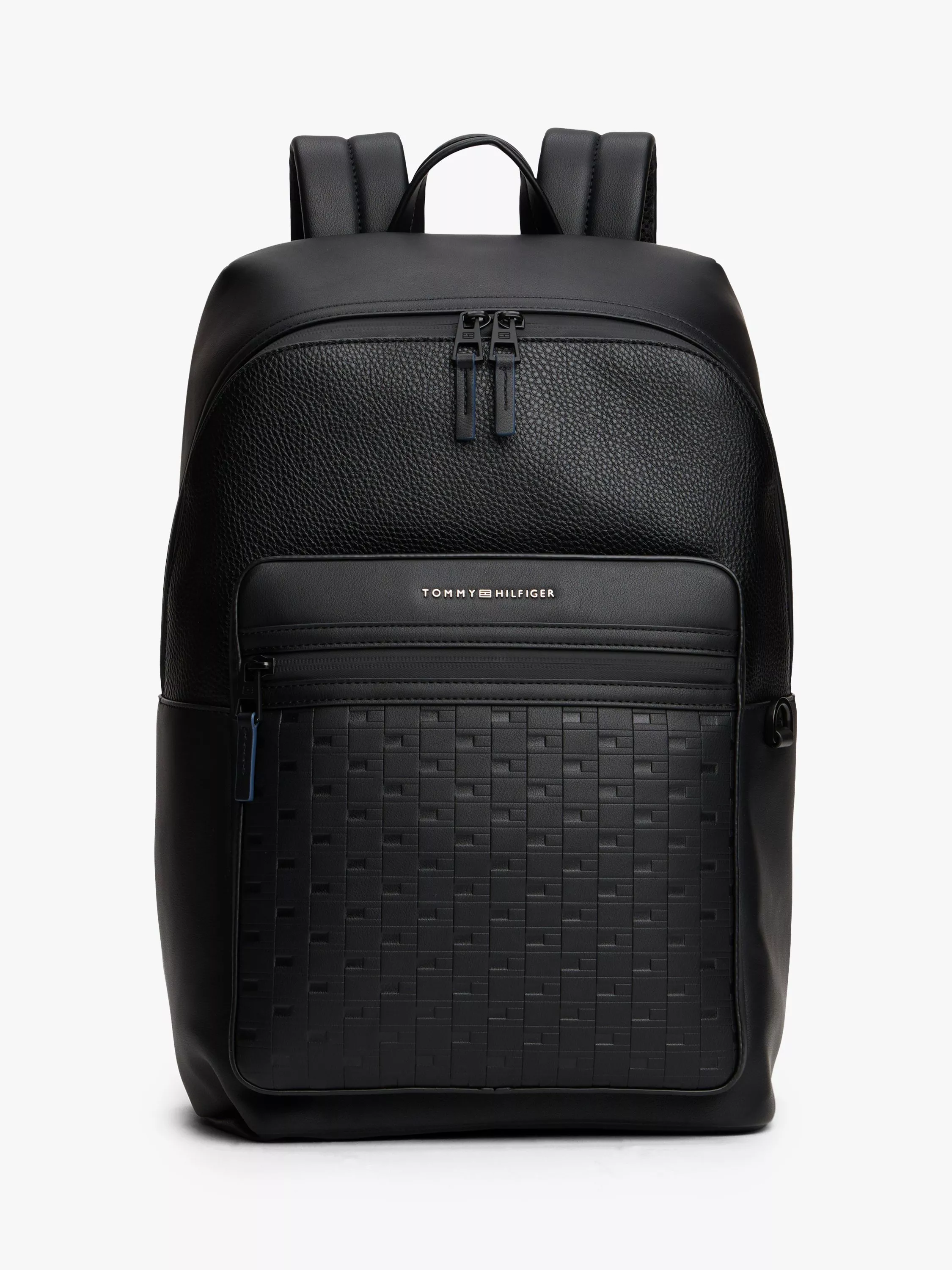 Carry your daily necessities in style with this contemporary Tommy Hilfiger backpack. The design features mixed texture panels and a subtle repeat flag pattern debossed onto the front pocket. Details include a padded mesh back and adjustable padded shoulder straps for comfortable use, securing with a double zip closure. It offers ample storage with one main compartment and an exterior zipped pocket, complete with a D-ring hook on the side for added utility.