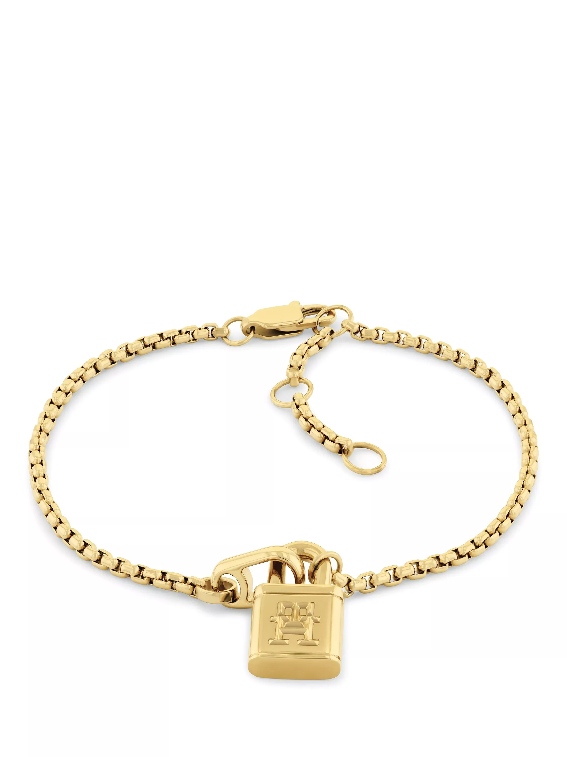 This chain bracelet features a Tommy Hilfiger monogram lock charm, inspired by the handbag collection. It has a secure lobster clasp.