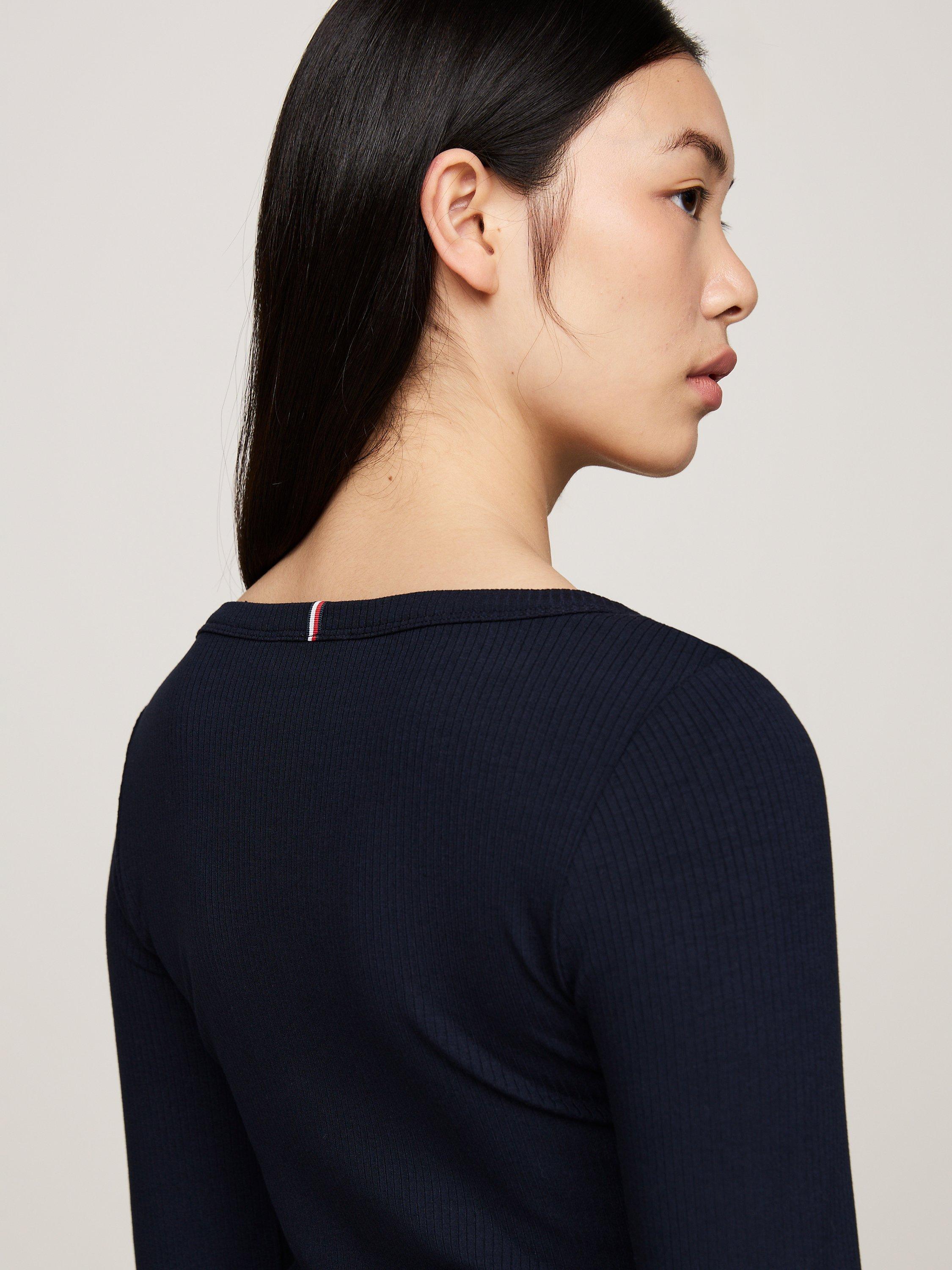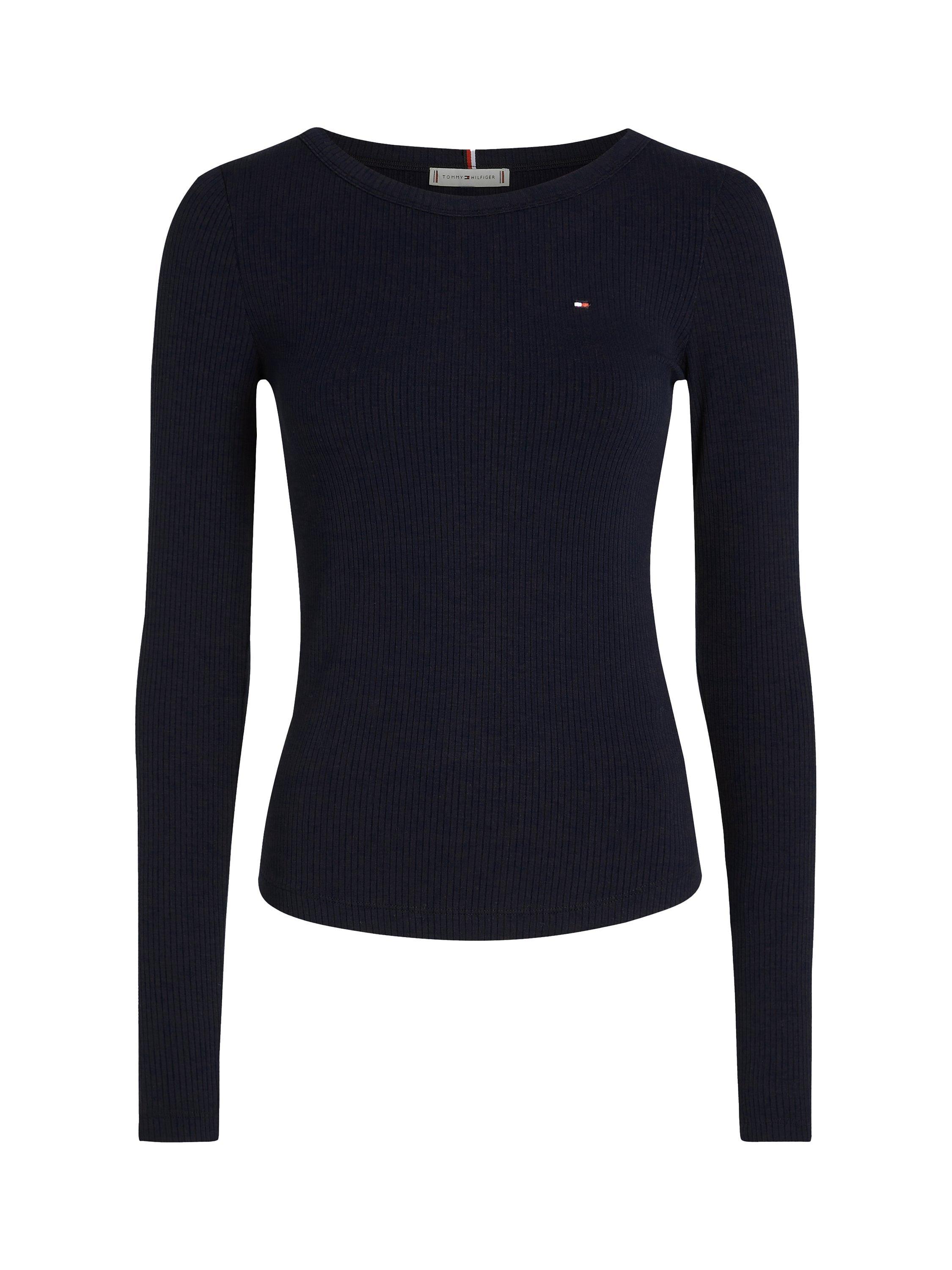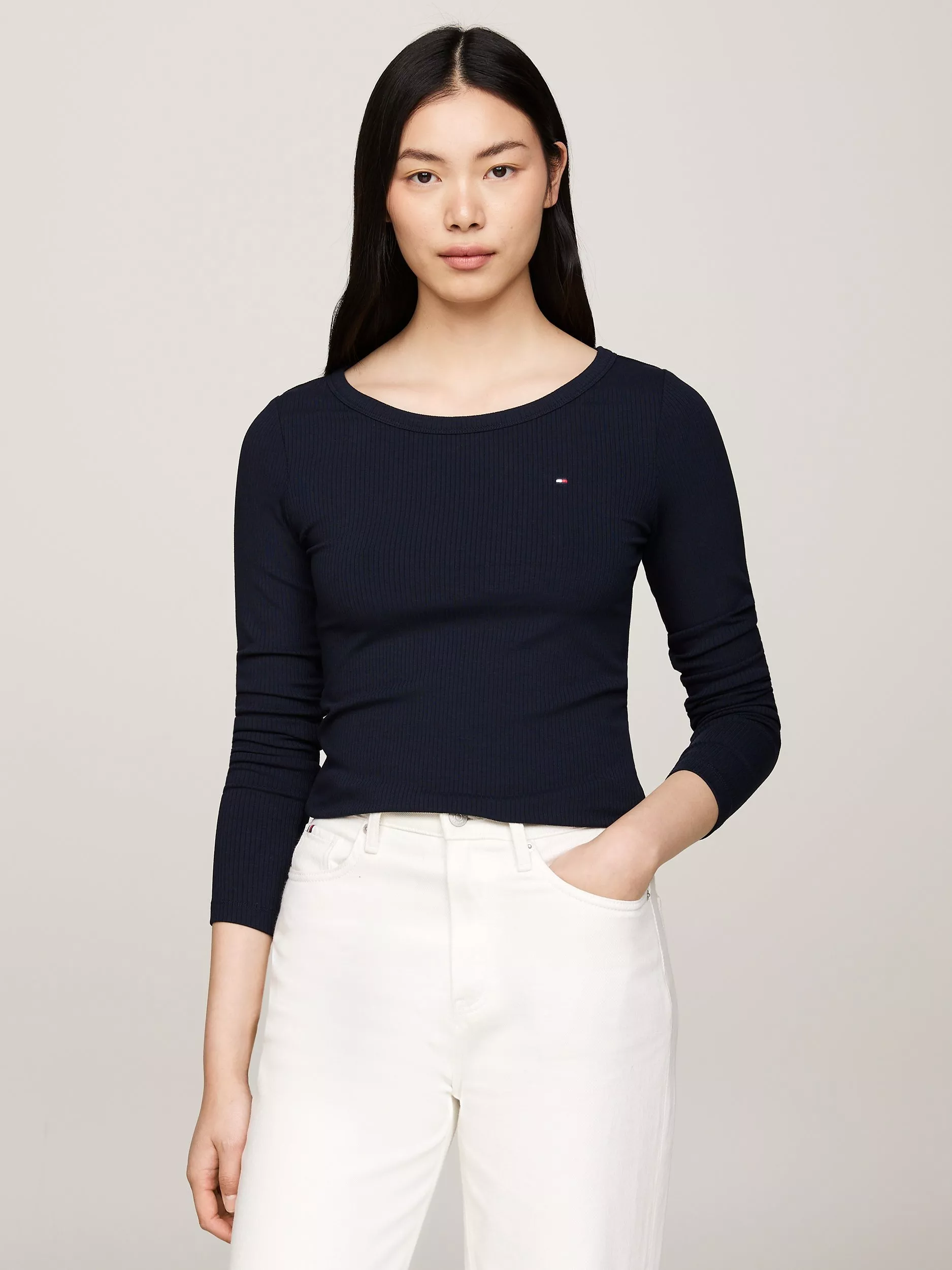 For the casual every day, this slim rib top from Tommy Hilfiger is cut with a softly rounded neckline, long sleeves and is made from a light yet durable blended fabric.