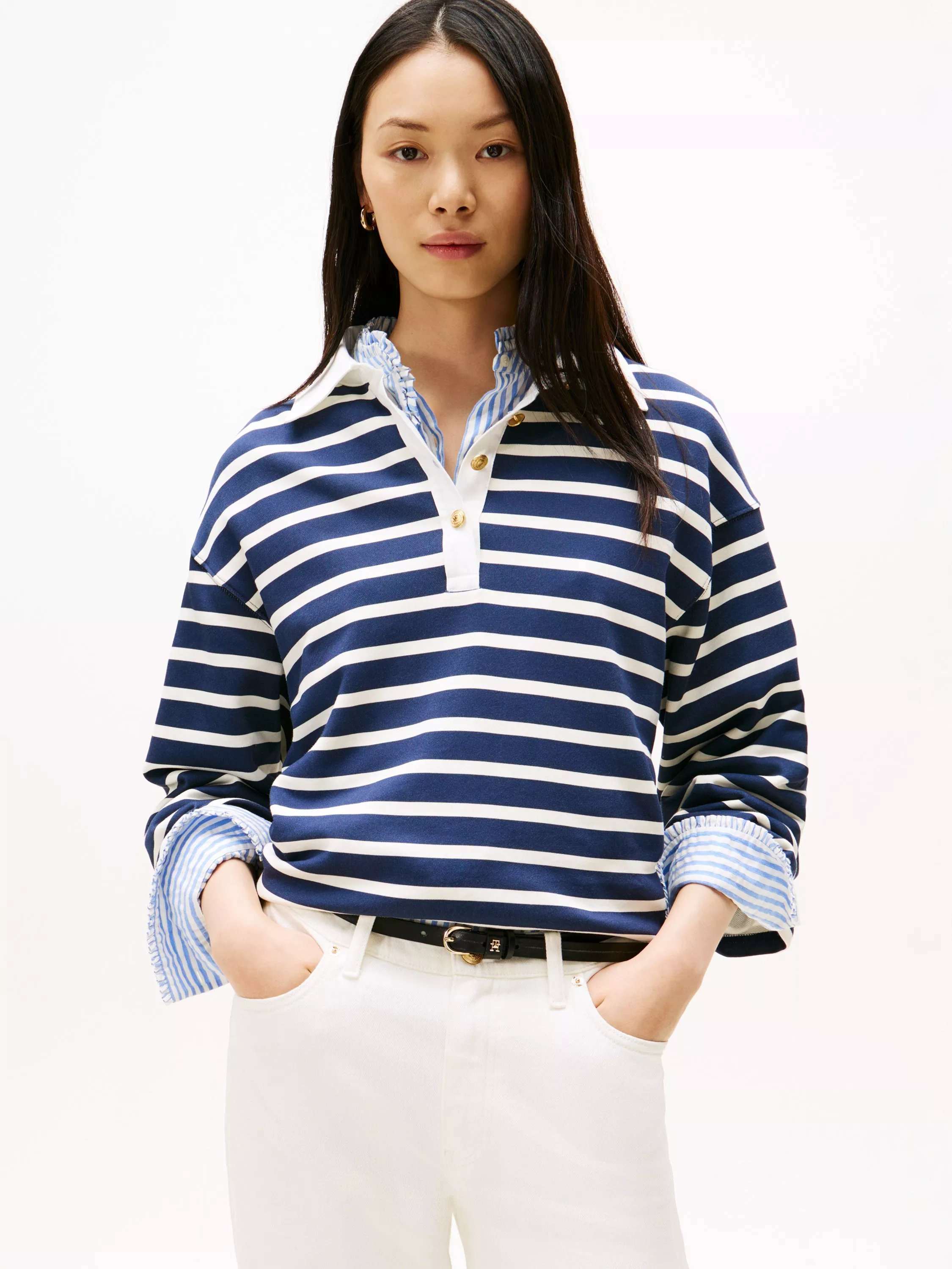 This rugby-inspired sweatshirt is a relaxed style that's complete with branded metallic-tone buttons on the placket for an elevated touch.