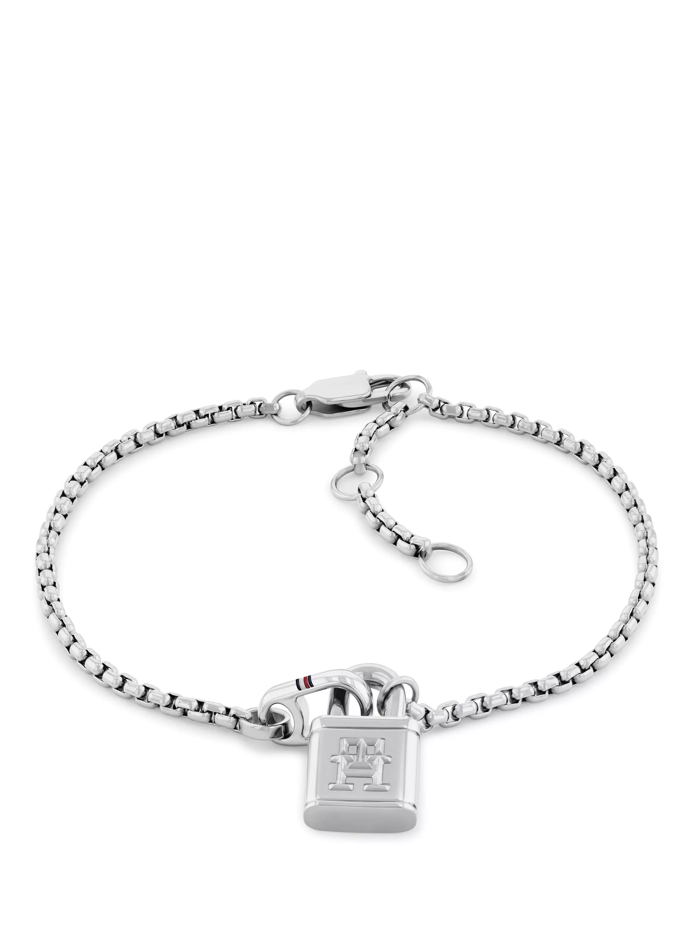 This stainless steel chain bracelet features a TH monogram lock pendant. The Lock charm was inspired by the Tommy Hilfiger handbag collection. It also features an enamel signature stripe detail on the carabiner link for that iconic touch.