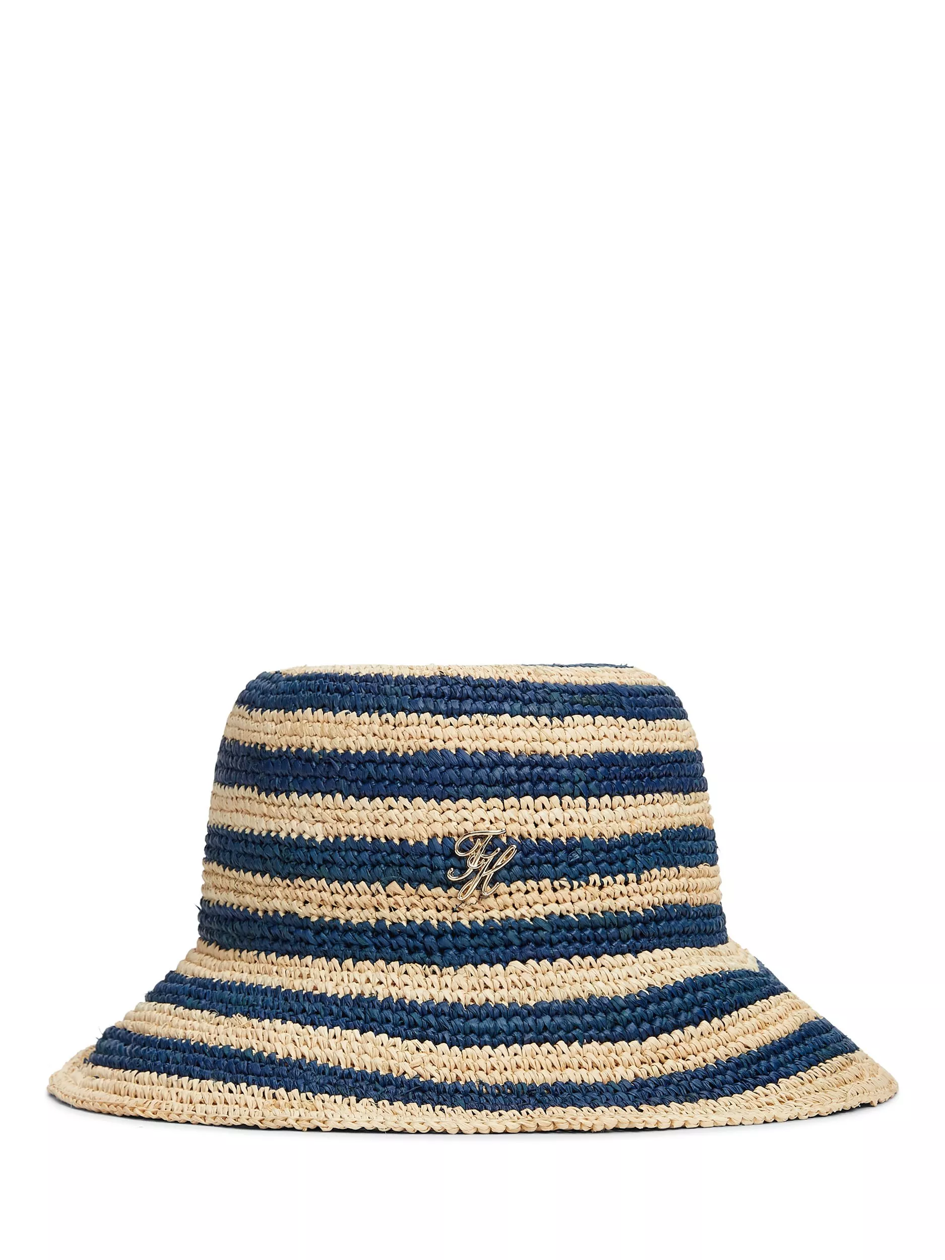 This raffia bucket hat combines a bold horizontal stripe with a glistening logo plaque for elevated warm-weather style.