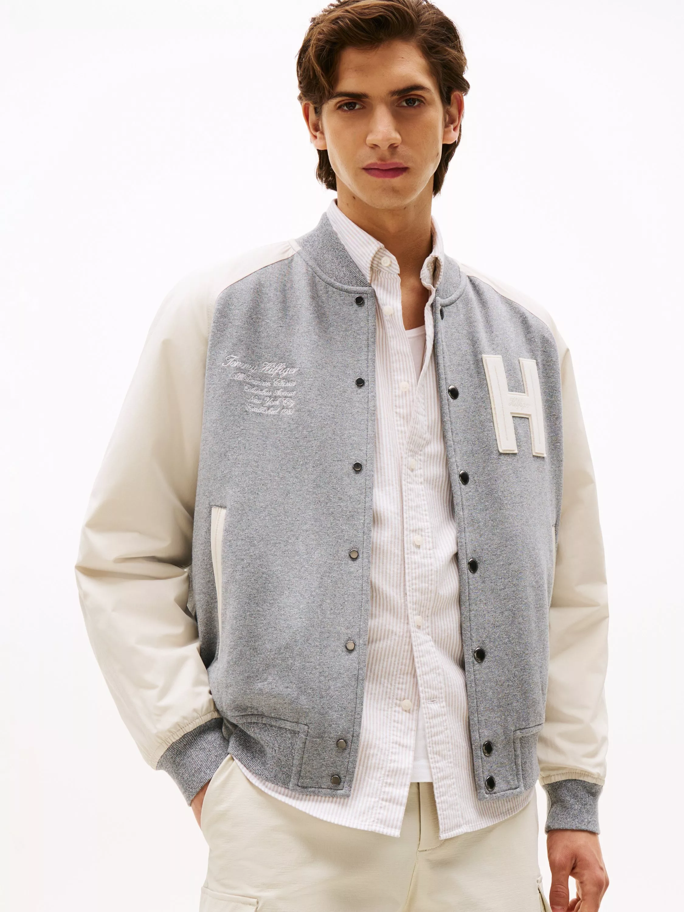 Embrace collegiate style in this bomber jacket, featuring a mix of fabric textures and a bold varsity letter appliqué on the chest.